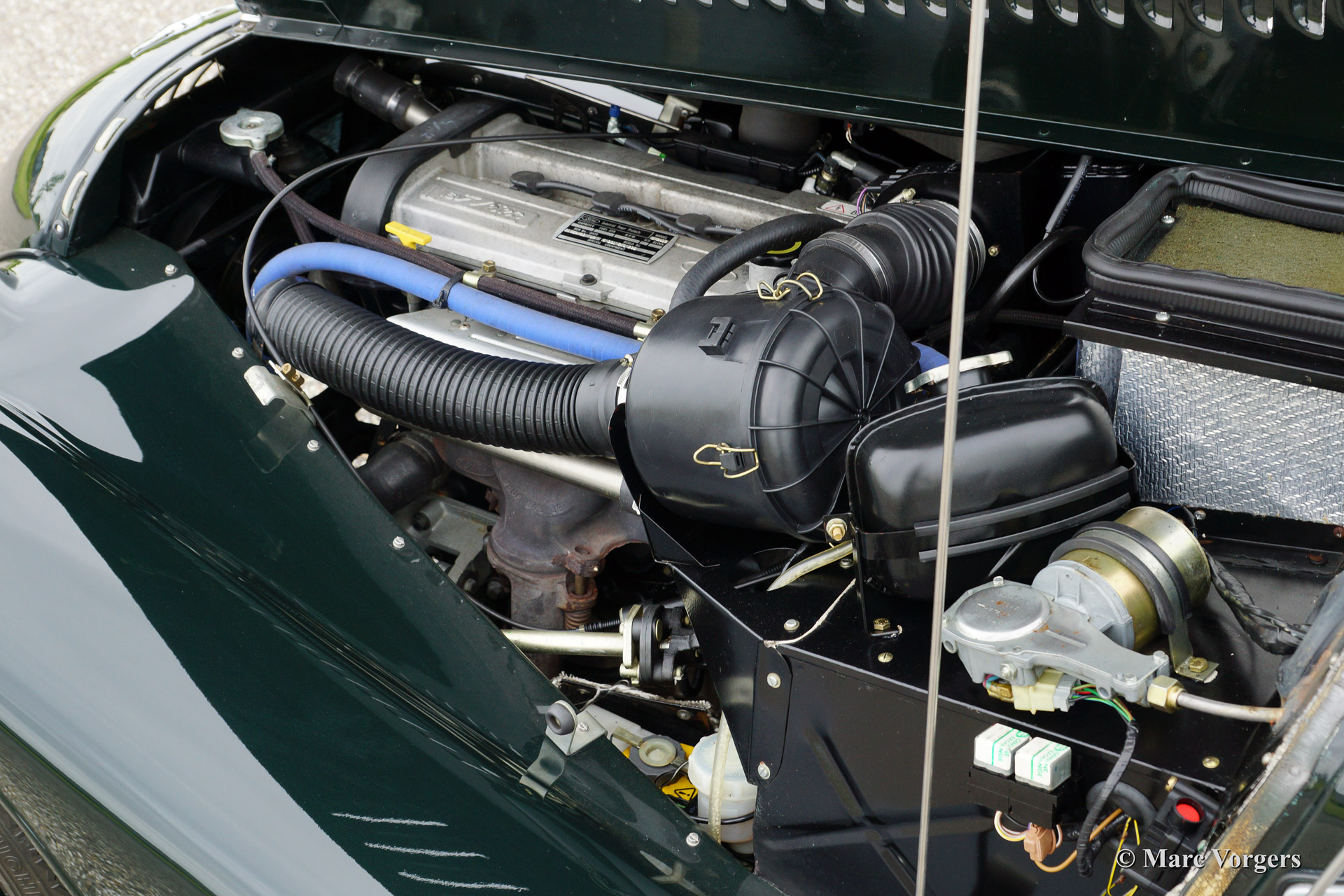 The Morgan 4/4 was built for 50 years. the first model, introduced in the year 1936 was the 4/4 with flat radiator which was built until the year 1951. After a four year break (only the Morgan plus 4 was built those years) the Morgan 4/4 was going to be rebuild. The car did not change a lot (conservative as they are at the Morgan company), only the shape of the radiator changed from flat to cowled. Morgan never built their own engine, the early flat radiator cars were powered by Standard or Ford engines. The cowled radiator models were powered by Ford engines. The Ford engine used was known as the "Kent" engine and was also used in Fords Cortina model. Morgan 4/4 1600 cars were powered by the 1599 cc. Ford Kent engine which had a standard capacity of 98 bhp. giving the light car (two seater 660 kg./ four seater 785 kg.) sporty performance. The cars were fitted with a four speed manual gearbox. The modern Morgan 4/4 models are powered by a Ford Zetec 16V engine. These cars feature petrol injection and a five speed manual gearbox. The Morgan 4/4 is a very special car to drive because it has it's own strong character. It cannot be compared with any other roadster or convertible.