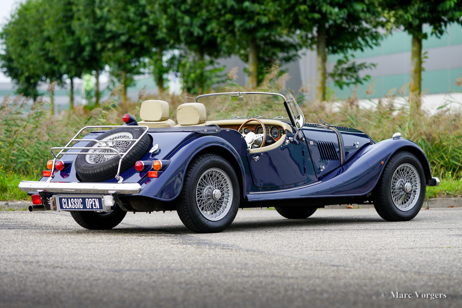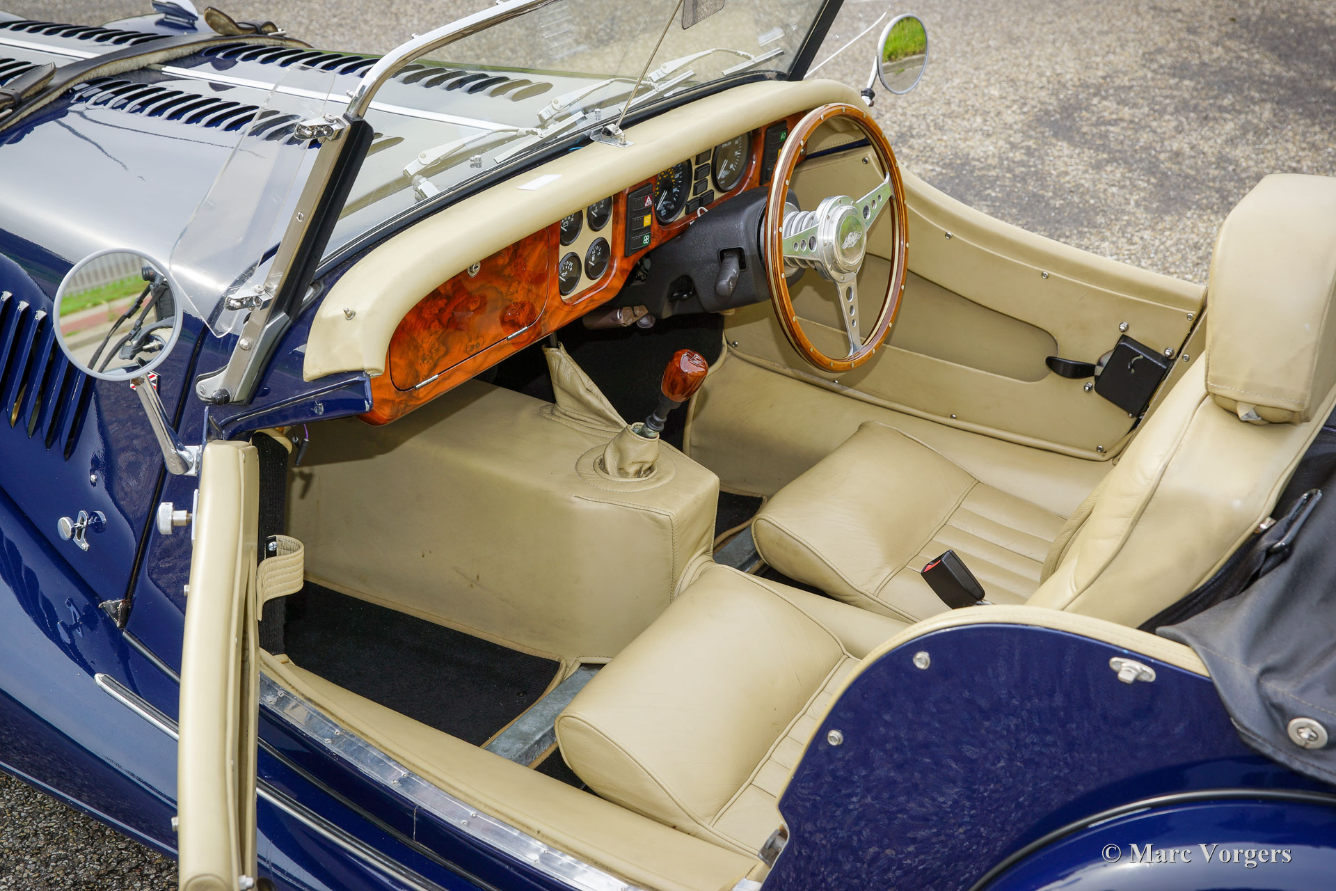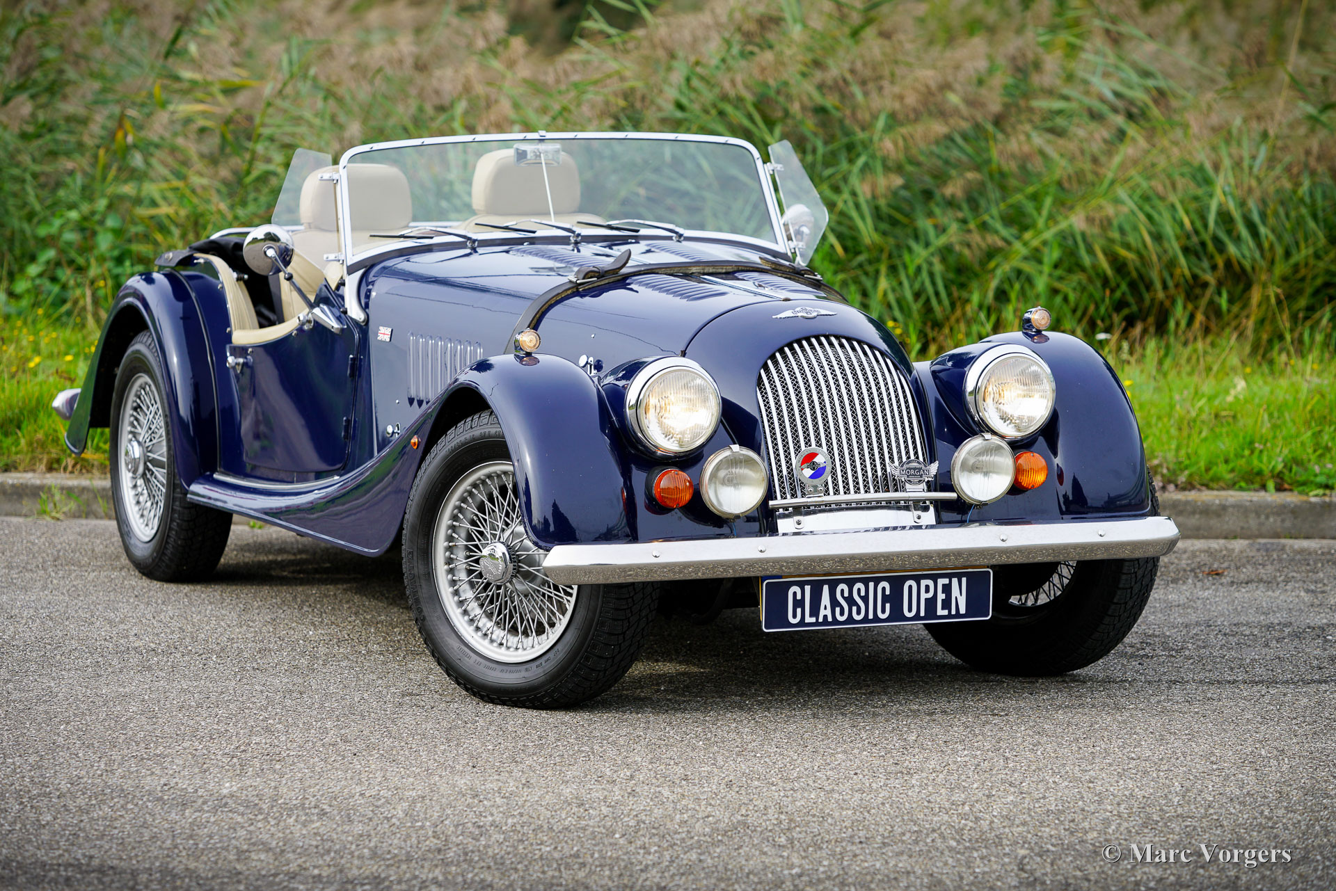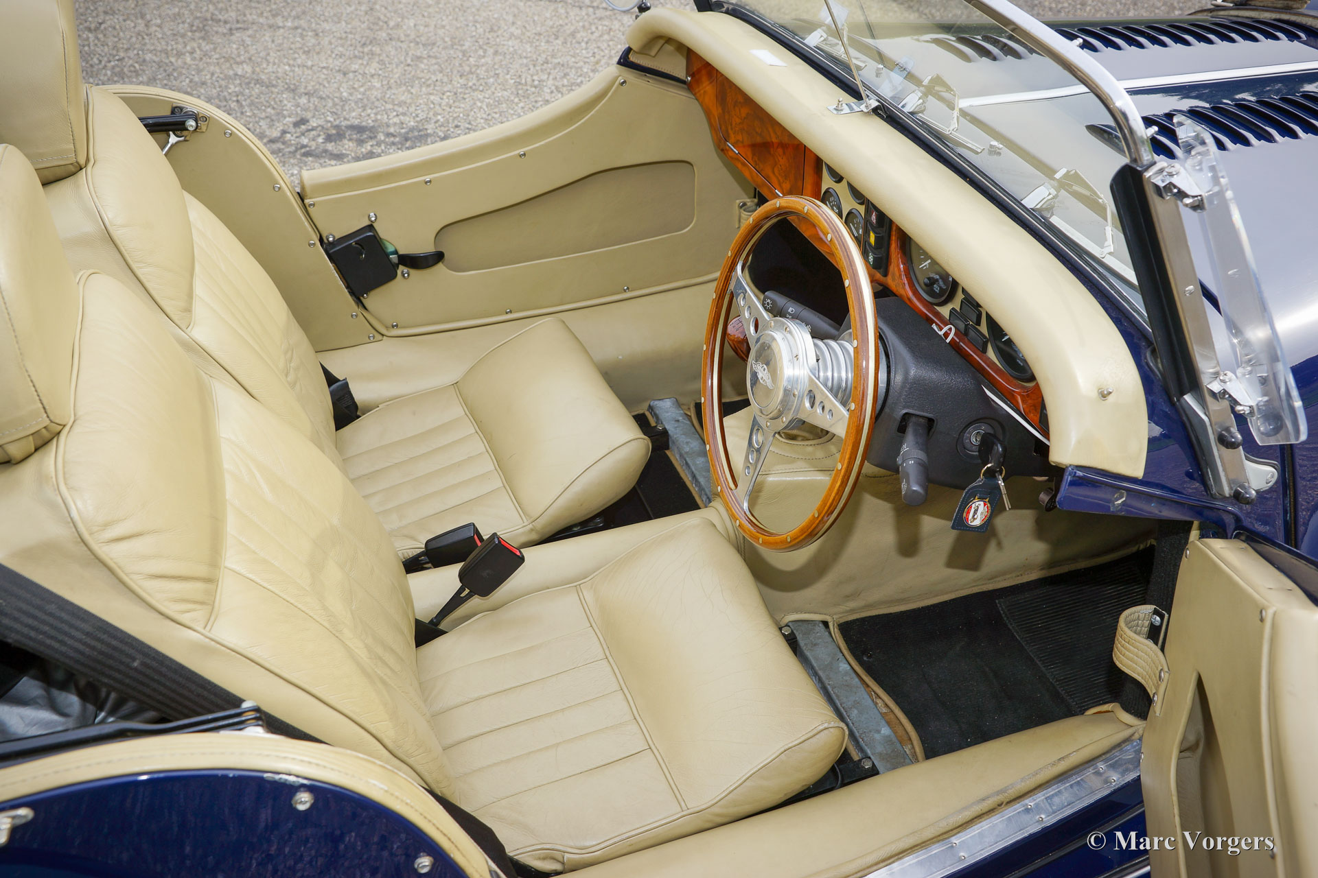 Morgan 4/4 1800, year 1998. First registration 5 October 1998. Colour dark blue combined with a beige leather interior and black carpet. Black vinyl hood, tonneau cover, and aluminium side screens. This fantastic Morgan 4/4 was imported to the Netherlands in 2017, the car is with the second Dutch owner since 31 December 2019. This wonderful machine is fitted with the powerful and reliable Ford Zetec 1800 four-cylinder engine. The power is transmitted to the rear wheels via a five-speed gearbox, and stopping power is provided by servo assisted disk brakes at the front and drum brakes at the rear. The Morgan weighs only 868 kilogrammes, combined with the lusty 120 bhp 16 Valve engine it is a proper sports car! This example features silver grey painted 15-inch wire wheels shod with good Continental tyres, a baggage rack, a walnut dashboard and, sports steering wheels with a wood rim, a badge bar with additional driving lamps fitted, and a leather belt over the bonnet. From new this fine morgan 4/4 has driven only 28.000 miles! The driving experience is sporty and 1950s/1960s classic, with the advantage of more modern technology and reliability. You will not find this unique experience in any other car. A unique hand built British sports car!