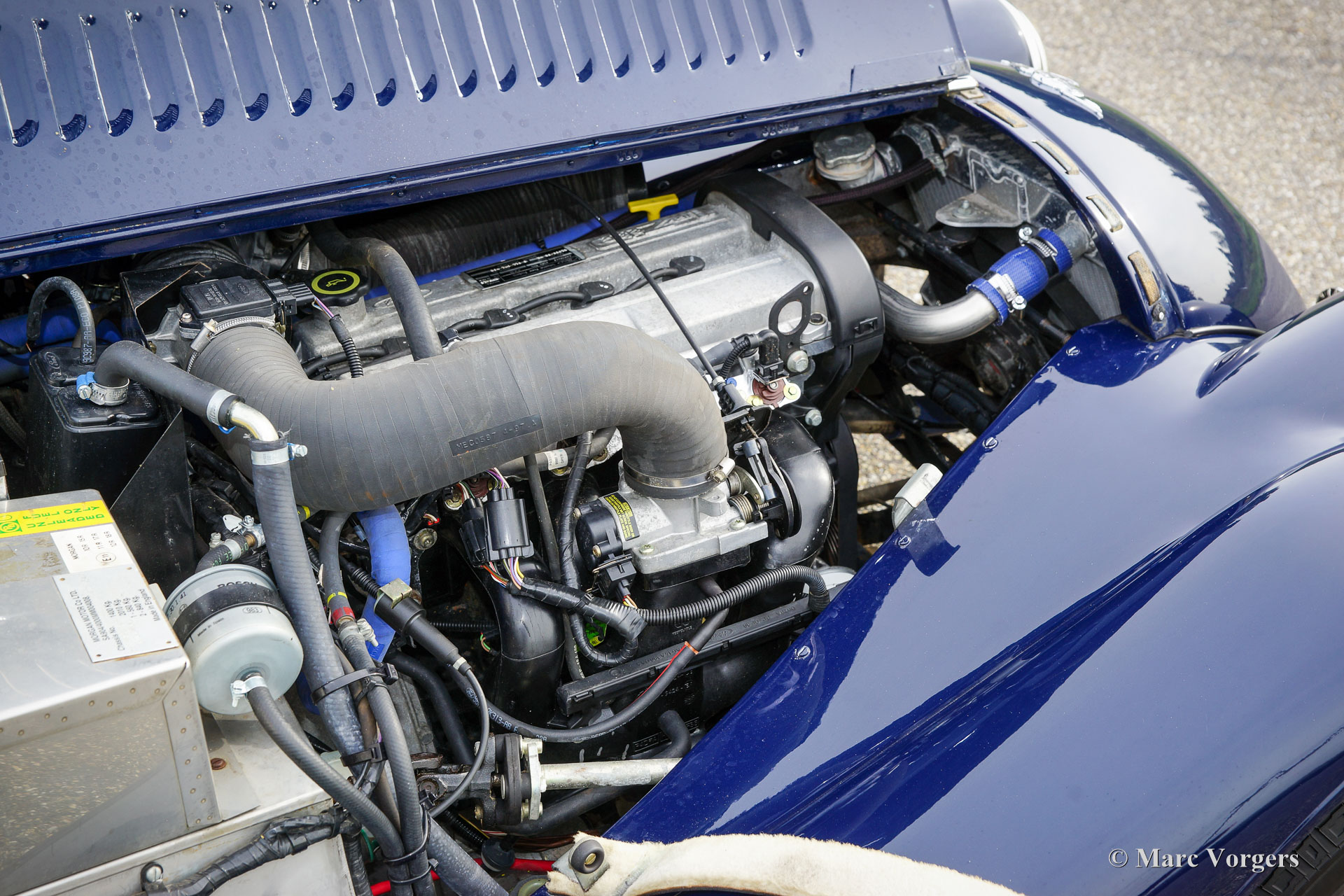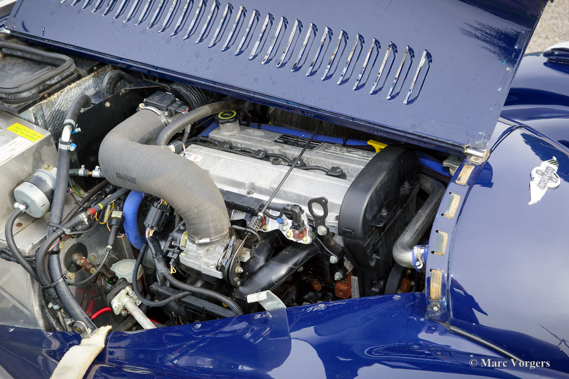 The Morgan 4/4 was built for 50 years. the first model, introduced in the year 1936 was the 4/4 with flat radiator which was built until the year 1951. After a four year break (only the Morgan plus 4 was built those years) the Morgan 4/4 was going to be rebuild. The car did not change a lot (conservative as they are at the Morgan company), only the shape of the radiator changed from flat to cowled. Morgan never built their own engine, the early flat radiator cars were powered by Standard or Ford engines. The cowled radiator models were powered by Ford engines. The Ford engine used was known as the "Kent" engine and was also used in Fords Cortina model. Morgan 4/4 1600 cars were powered by the 1599 cc. Ford Kent engine which had a standard capacity of 98 bhp. giving the light car (two seater 660 kg./ four seater 785 kg.) sporty performance. The cars were fitted with a four speed manual gearbox. The modern Morgan 4/4 models are powered by a Ford Zetec 16V engine. These cars feature petrol injection and a five speed manual gearbox. The Morgan 4/4 is a very special car to drive because it has it's own strong character. It cannot be compared with any other roadster or convertible.