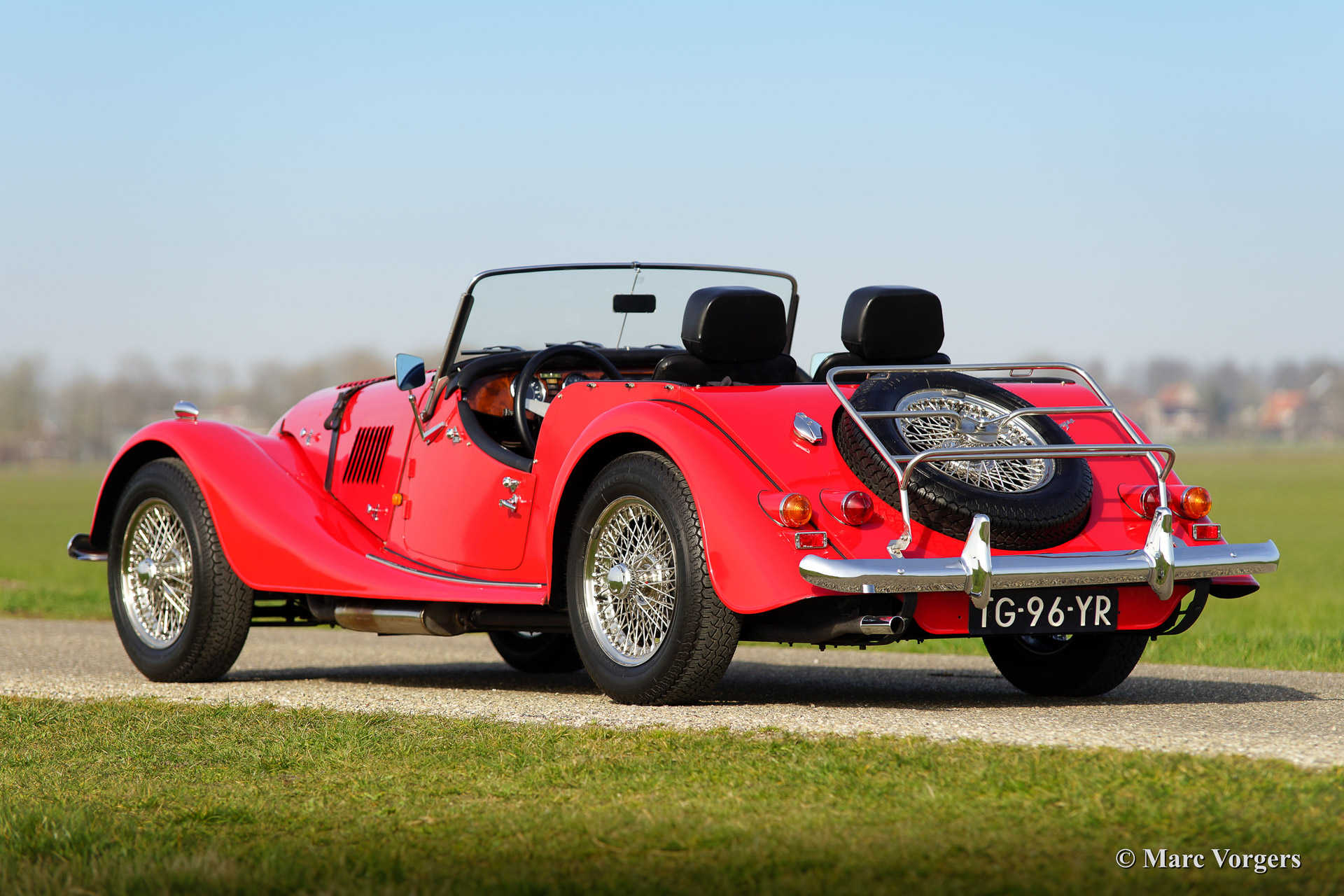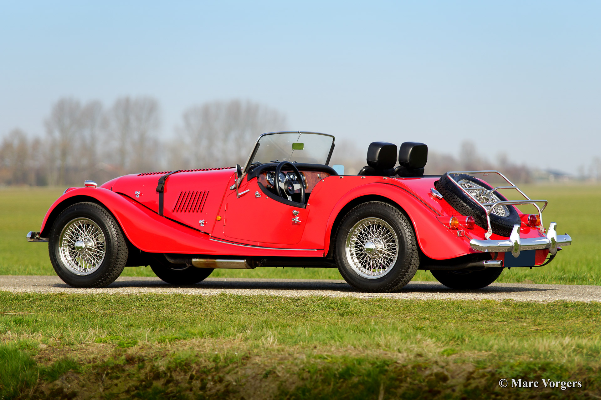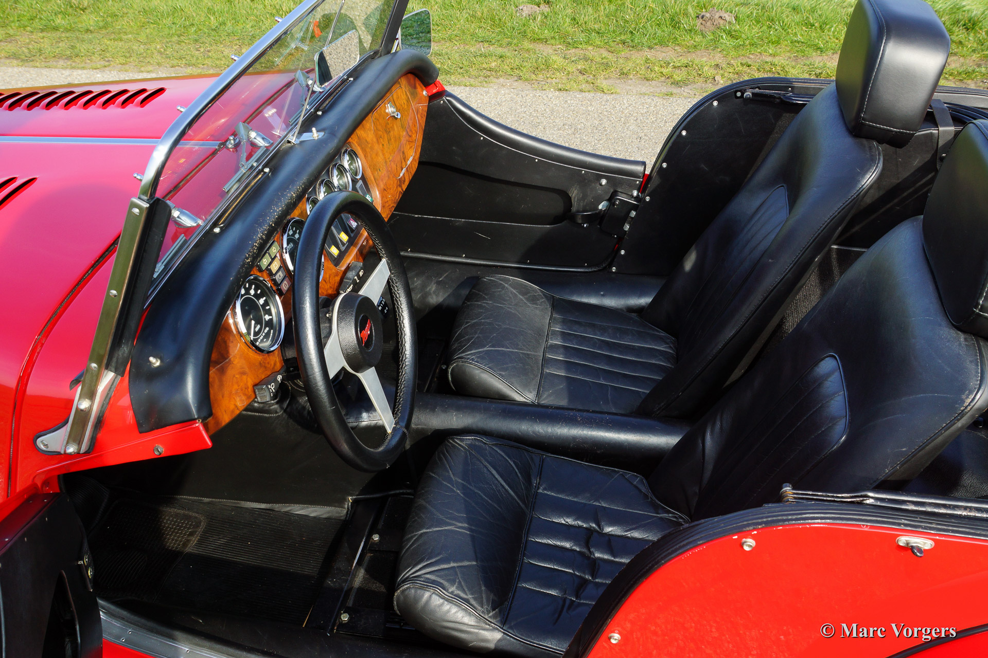 Morgan 4/4 1800, year 1988. Colour red with a black leather interior and black carpet. Black soft top and tonneau cover.
