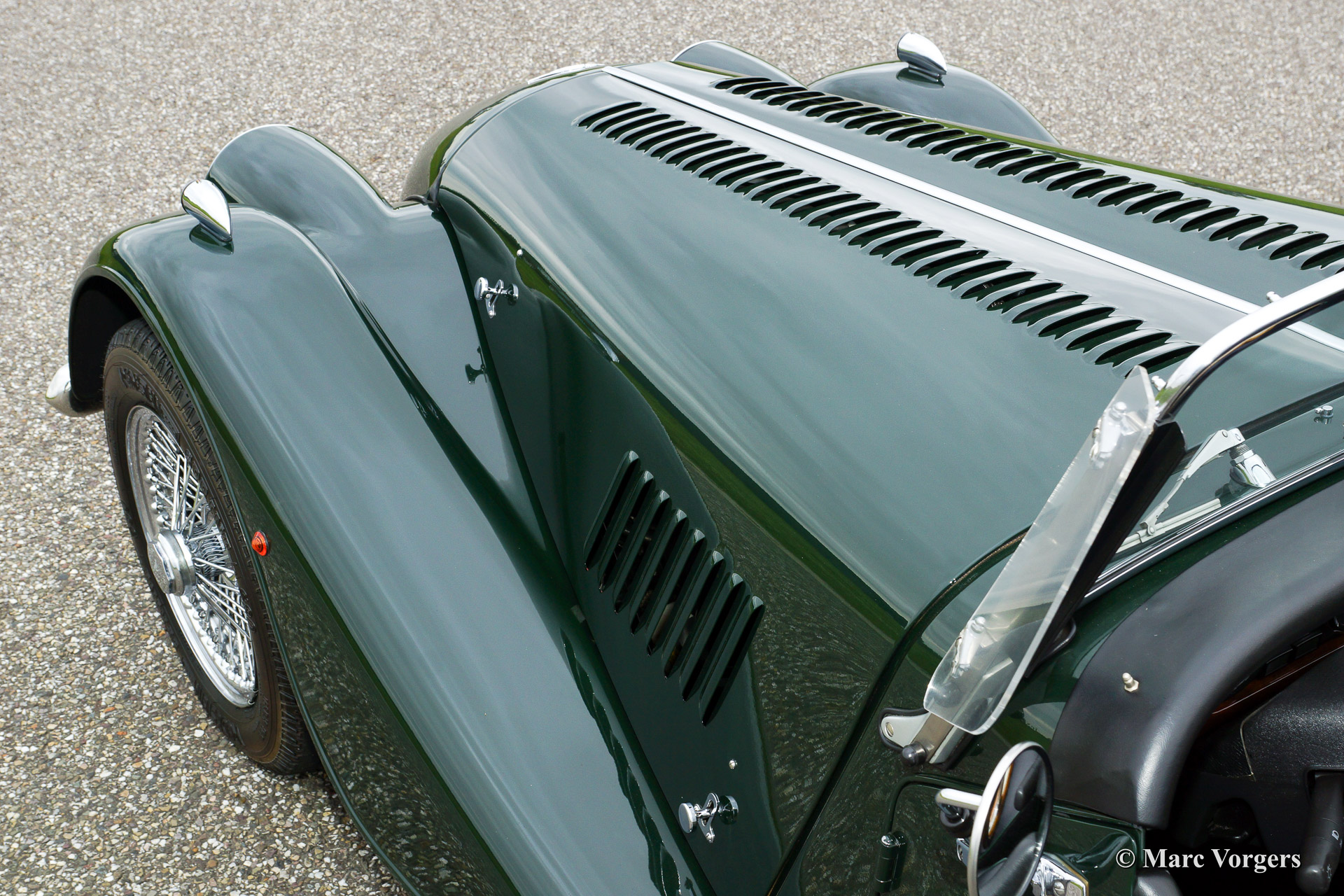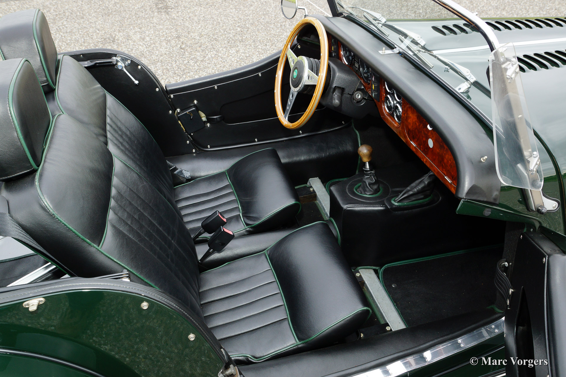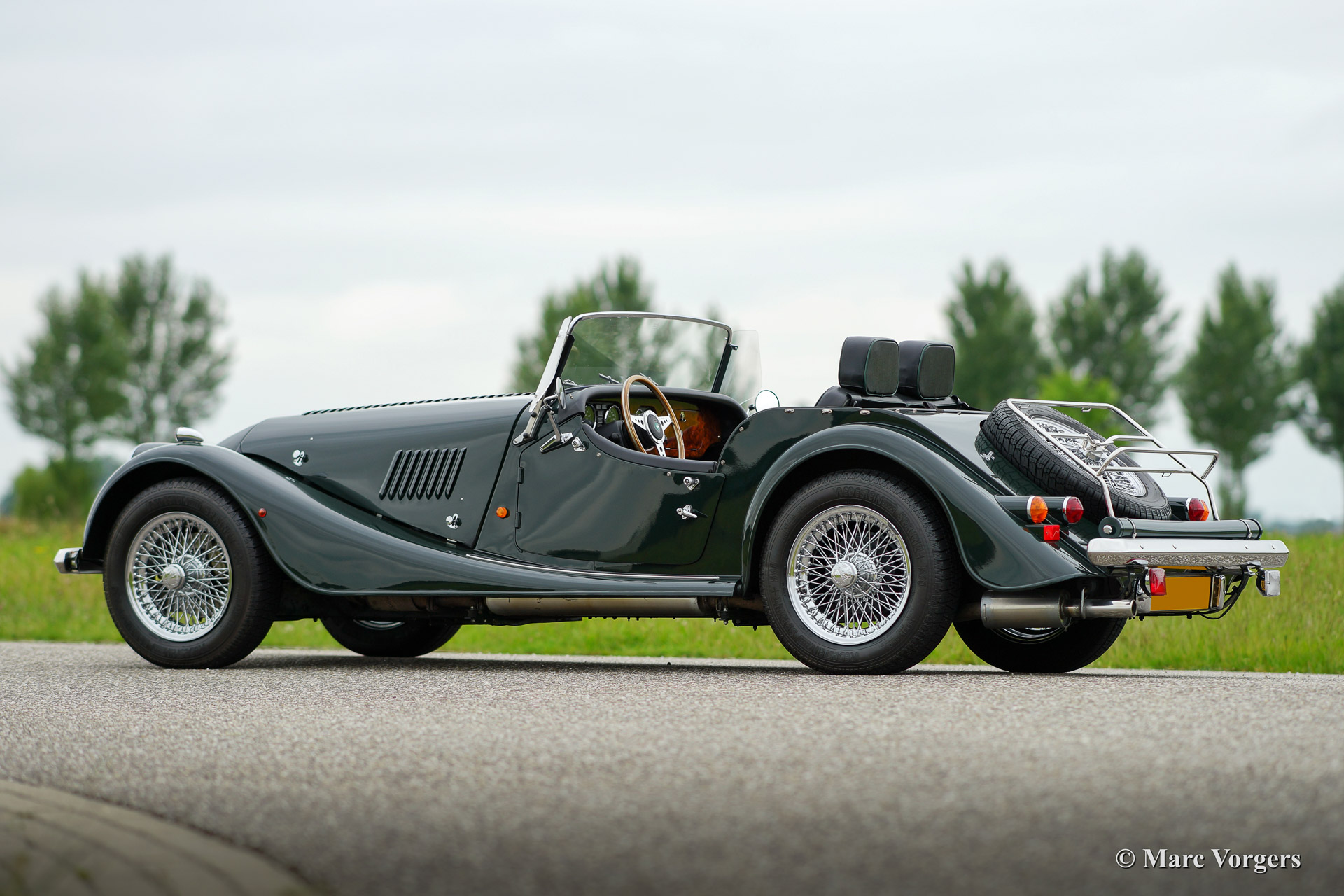 Morgan 4/4 1800, year 1998. Colour dark British Racing Green with a black leather interior piped green. Black vinyl soft top and tonneau cover. This fine Morgan 4/4 was delivered new by the Dutch Morgan representative (Nimag). From new the car has driven 44.177 kilometres. The automobile is in superb (excellent++) condition, like new! The service booklet is present and the (service) history is fully known. This Morgan drives perfectly! the car sports chrome wire wheels, a chrome luggage rack, chrome bumpers, a wooden dashboard, a badge bar and a special umbrella storage 'tube' above the rear bumper!