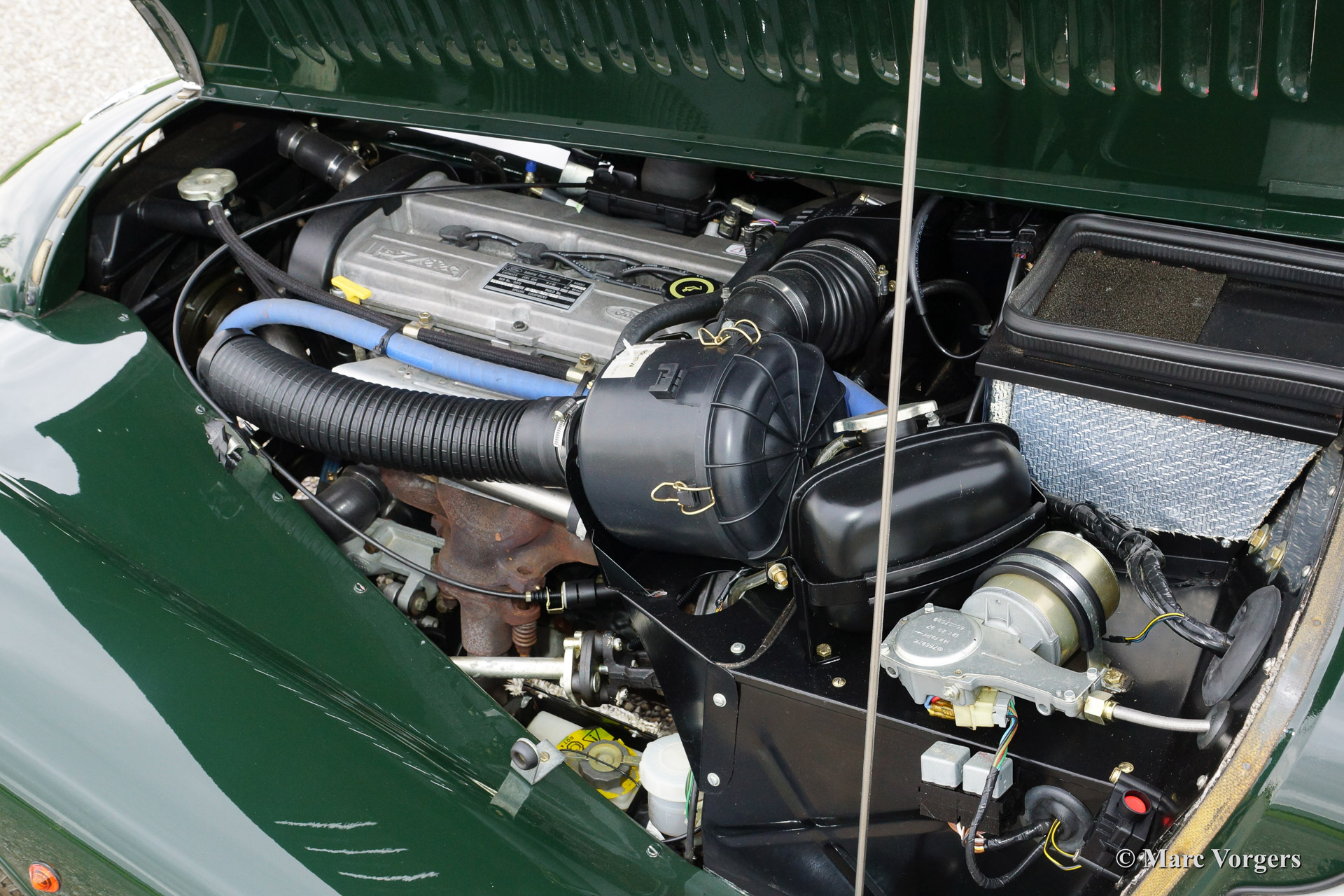The Morgan 4/4 was built for over 50 years. The first model, introduced in the year 1936 was the 4/4 with flat radiator which was built until the year 1951. After a four year break (only the Morgan plus 4 was built those years) the Morgan 4/4 was going to be rebuild. The car did not change a lot (conservative as they are at the Morgan company), only the shape of the radiator changed from flat to cowled. Morgan never built their own engine, the early flat radiator cars were powered by Standard or Ford engines. The cowled radiator models were powered by Ford engines. The Ford engine used was known as the "Kent" engine and was also used in Fords Cortina model. Morgan 4/4 1600 cars were powered by the 1599 cc. Ford Kent engine which had a standard capacity of 98 bhp. giving the light car (two seater 660 kg./ four seater 785 kg.) sporty performance. The cars were fitted with a four speed manual gearbox. The modern Morgan 4/4 models are powered by a Ford Zetec 16V engine. These cars feature petrol injection and a five speed manual gearbox. The Morgan 4/4 is a very special car to drive because it has it's own strong character. It cannot be compared with any other roadster or convertible.