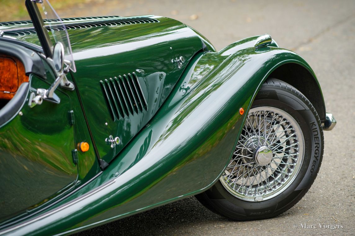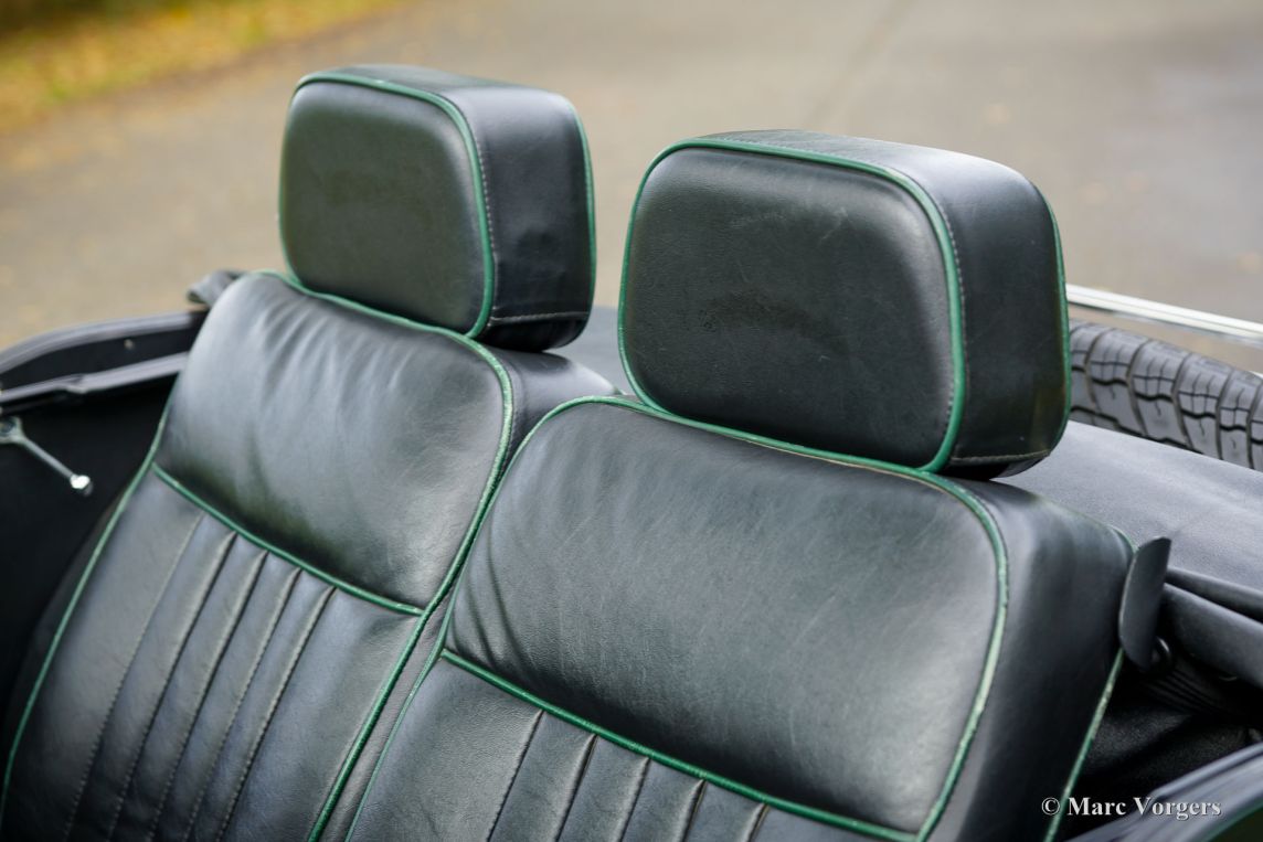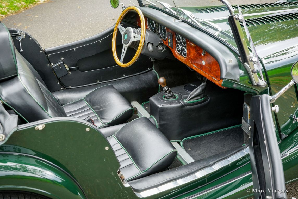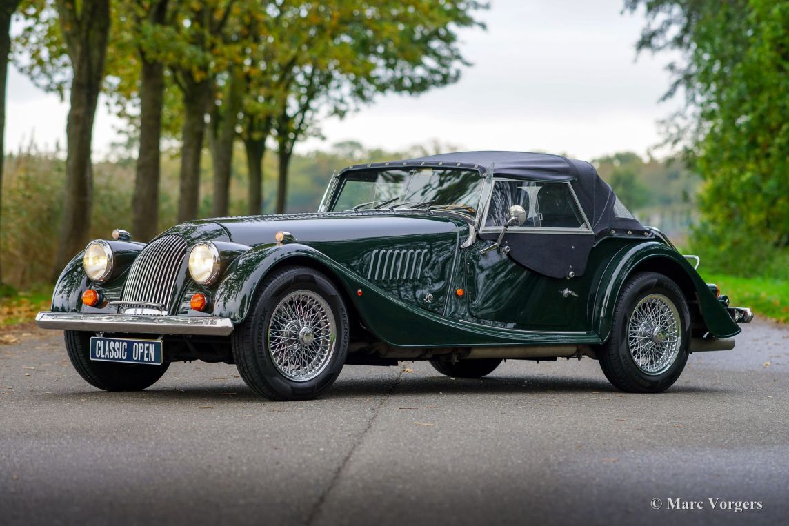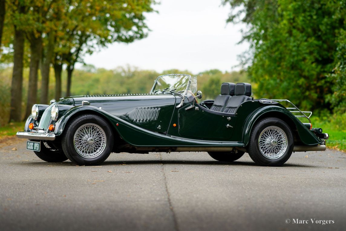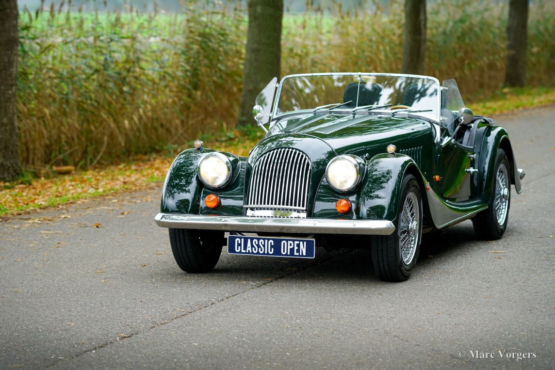 Morgan 4/4, year 1998. Bodywork finished in British Racing Green combined with a black vinyl soft top and tonneau cover. Black leather interior trimmed with green piping and black carpet. This gorgeous Morgan 4/4 was sold in the Netherlands, and the car has driven 81.000 kilometres from new. The story of the Morgan 4/4 is one of remarkable longevity, a steadfast beacon of traditional British motoring. For decades, craftsmen at the Malvern factory have lovingly built these sports cars, using time-honoured techniques and an ash frame. This approach has always been about character over outright speed, a fact that has endeared the 4/4 to enthusiasts worldwide. By 1998, the model had been in continuous production for much of its 62-year history, and that year saw a significant modernisation under the bonnet with the fitment of the Ford Zetec 16V engine. The 1800 cc. Zetec 16V engine delivers 121 bhp and 162 Nm of torque giving the 860 kilogrammes light Morgan 4/4 a spirited performance! The classic handcrafted looks and the modern mechanics, combined with the sporty driving experience are the charm of this legendary classic roadster. This example is in a very good condition, and it comes with a complete service history from new. The car is fitted with wide chrome wire wheels, a baggage rack, an umbrella tube above the rear bumper, two door mounted rear view mirrors, and a sports steering wheel with a wood rim. This Morgan 4/4 is a magnificent driver car for those who truly appreciate the art of driving.