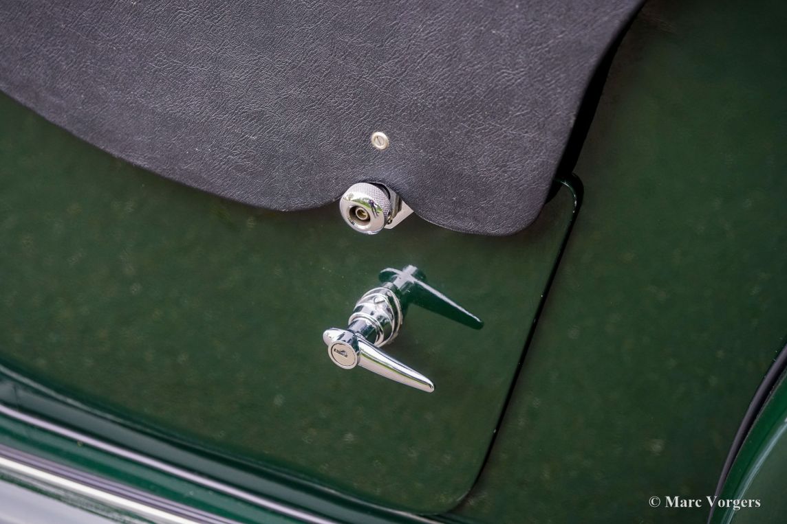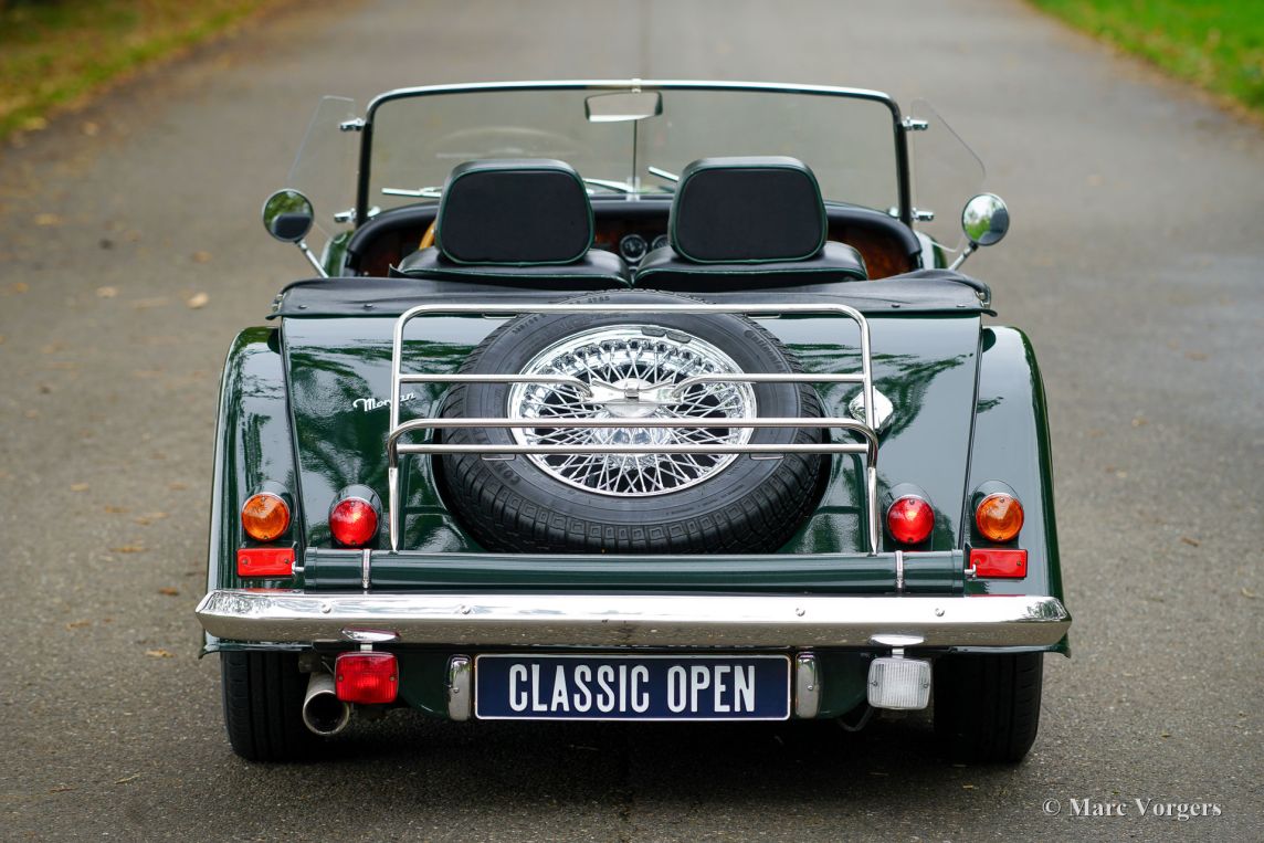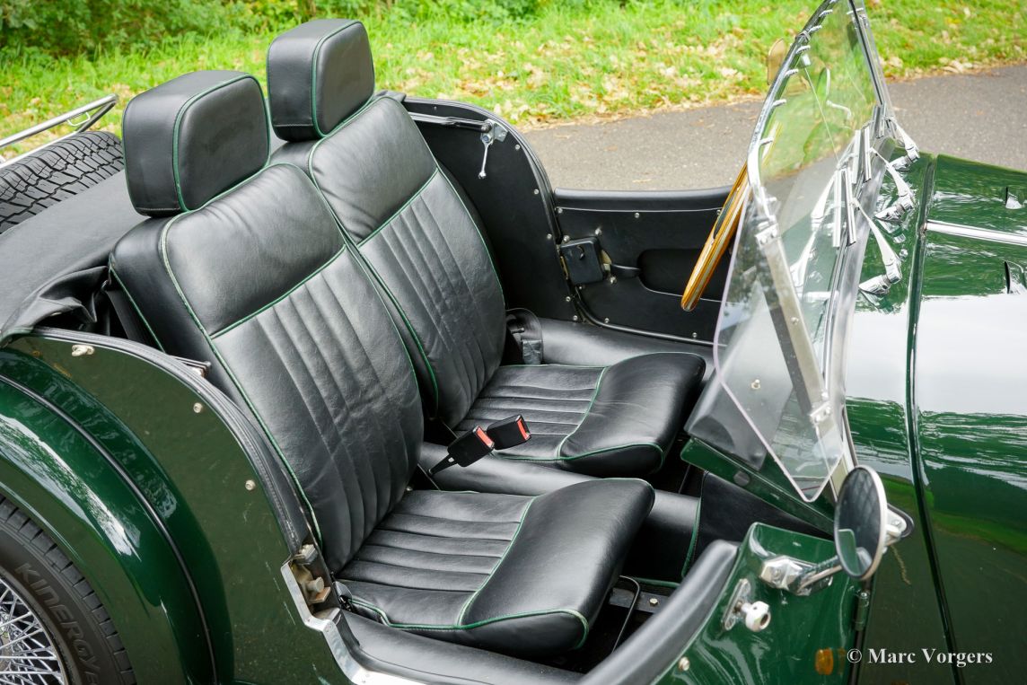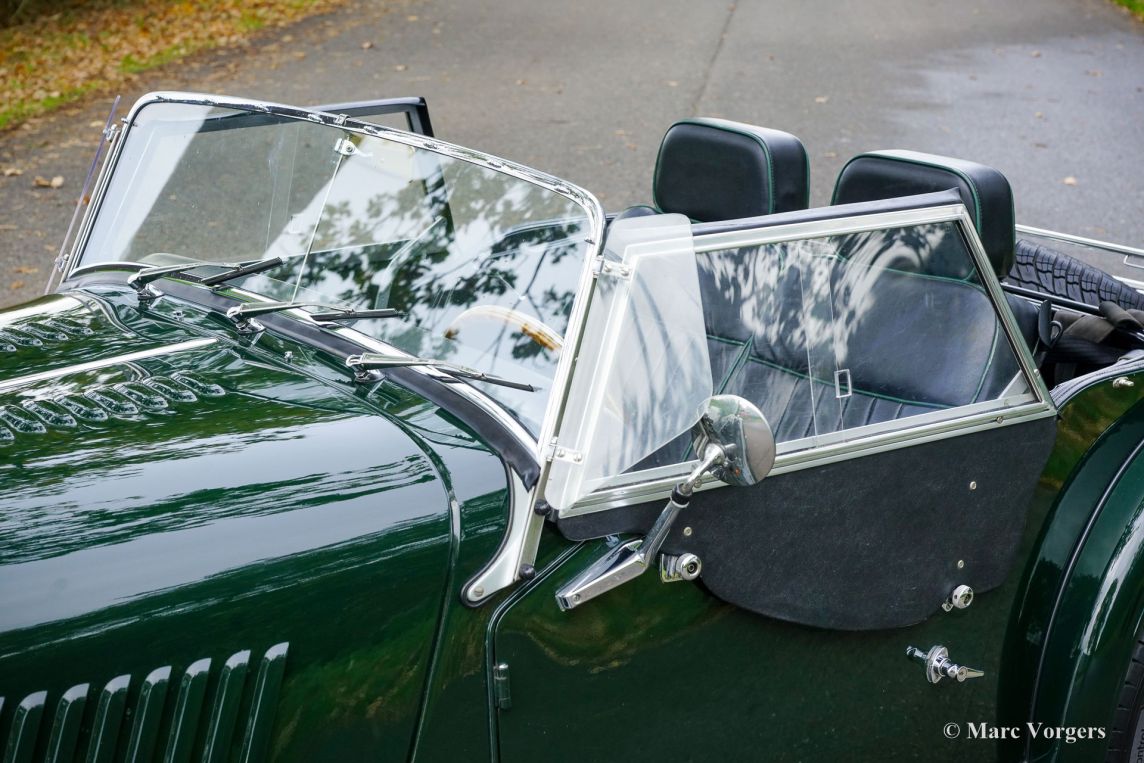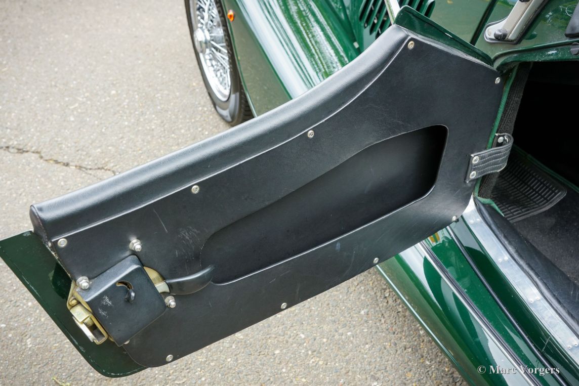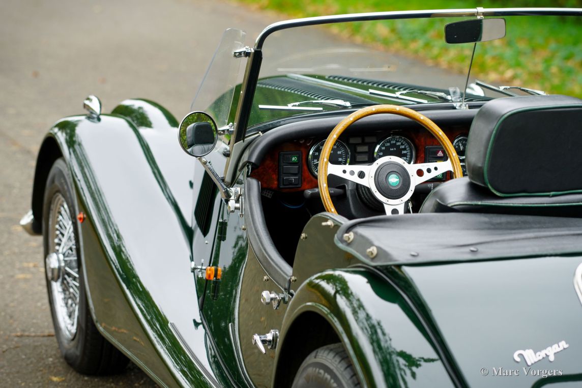 Morgan 4/4, year 1998. Bodywork finished in British Racing Green combined with a black vinyl soft top and tonneau cover. Black leather interior trimmed with green piping and black carpet. This gorgeous Morgan 4/4 was sold in the Netherlands, and the car has driven 81.000 kilometres from new. The story of the Morgan 4/4 is one of remarkable longevity, a steadfast beacon of traditional British motoring. For decades, craftsmen at the Malvern factory have lovingly built these sports cars, using time-honoured techniques and an ash frame. This approach has always been about character over outright speed, a fact that has endeared the 4/4 to enthusiasts worldwide. By 1998, the model had been in continuous production for much of its 62-year history, and that year saw a significant modernisation under the bonnet with the fitment of the Ford Zetec 16V engine. The 1800 cc. Zetec 16V engine delivers 121 bhp and 162 Nm of torque giving the 860 kilogrammes light Morgan 4/4 a spirited performance! The classic handcrafted looks and the modern mechanics, combined with the sporty driving experience are the charm of this legendary classic roadster. This example is in a very good condition, and it comes with a complete service history from new. The car is fitted with wide chrome wire wheels, a baggage rack, an umbrella tube above the rear bumper, two door mounted rear view mirrors, and a sports steering wheel with a wood rim. This Morgan 4/4 is a magnificent driver car for those who truly appreciate the art of driving.