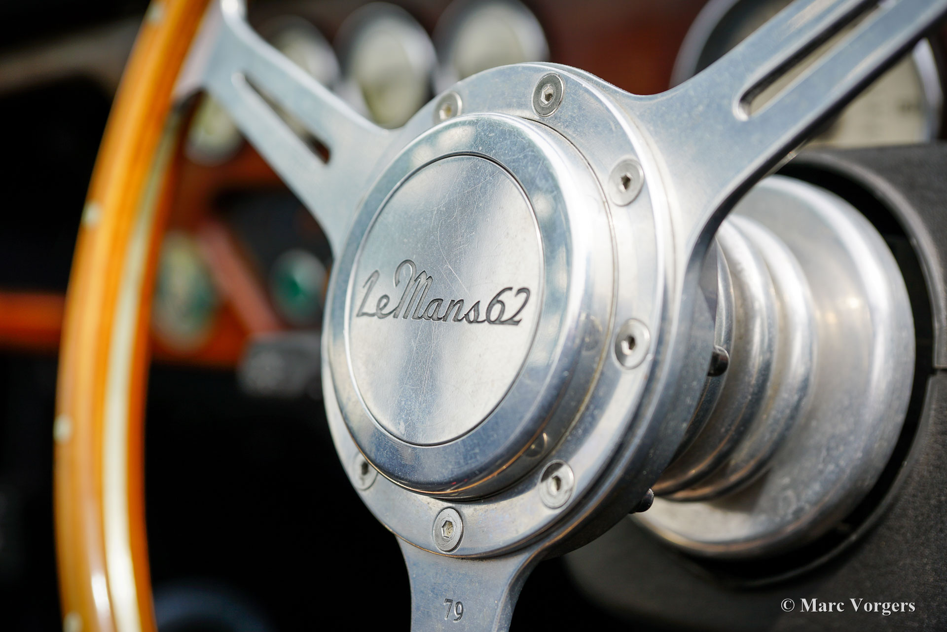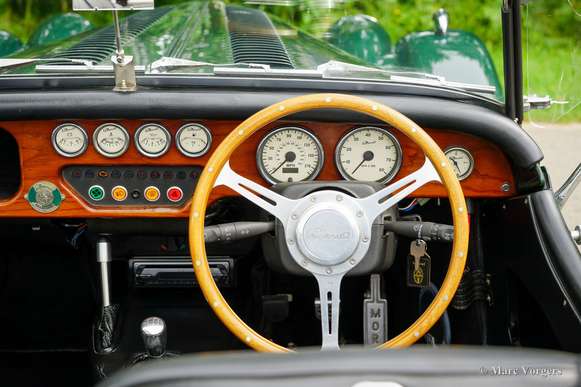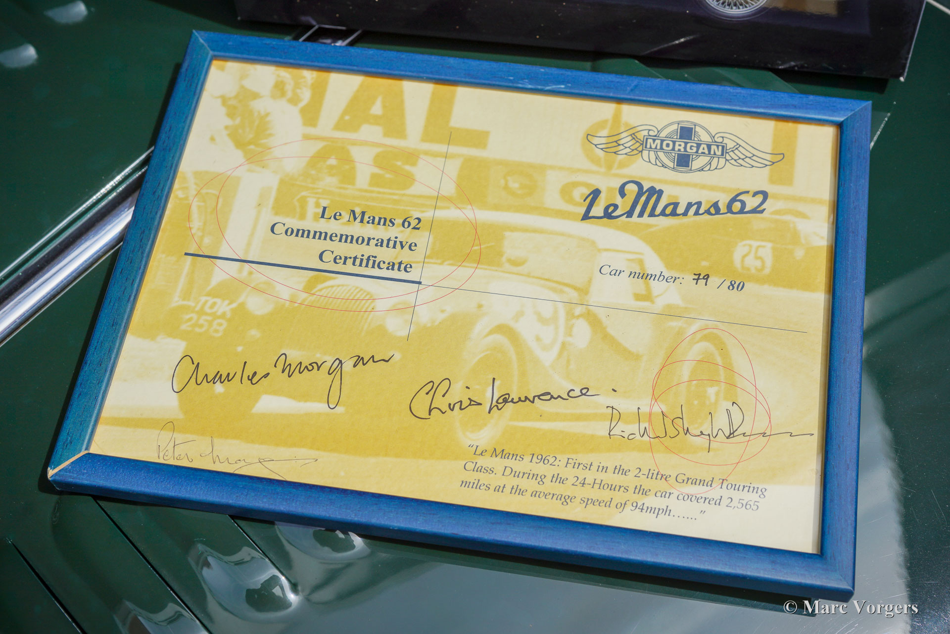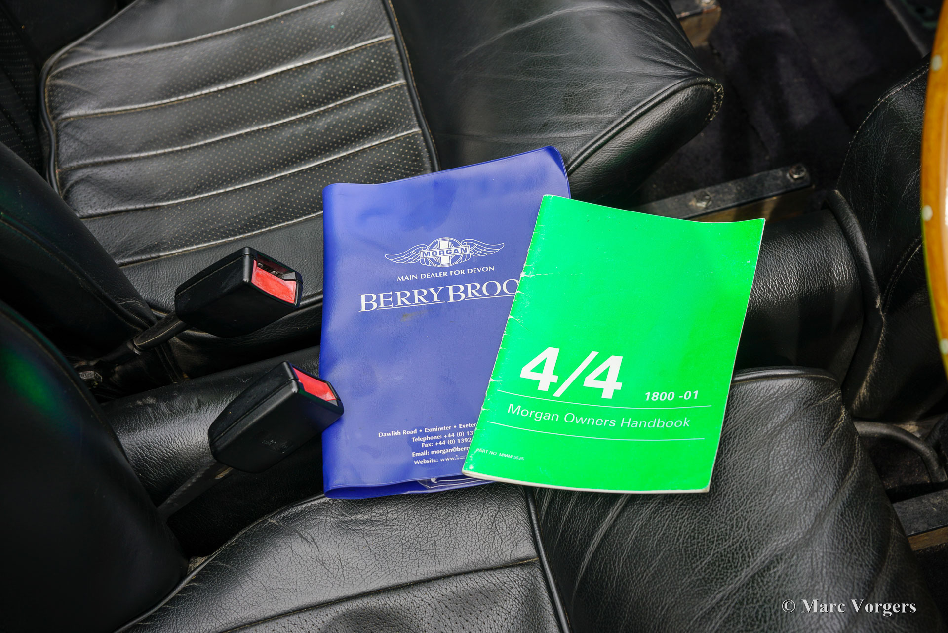 Morgan 4/4 Le Mans 62 Edition, year 2002. Colour British Racing Green combined with a black interior (black leather seats) and a black vinyl soft top. This special Le Mans 62 version comes complete with a hard top in the colour Old English White. The Morgan 4/4 Le Mans 62 is a limited edition of 80 examples, based on the Morgan Plus 4 Super Sport that won the 2-litre Grand Tourer class at the 24 Hours of Le Mans in 1962 with Christopher Lawrence and Richard Shepherd-Baron sharing the driving duties. The Le Mans-winning Morgan is renowned by its registration number TOK258. Of the 80 ‘40th Anniversary Edition LM62’ cars built in 2002, 40 were delivered in the 4/4 format; this car is the penultimate, bearing the number 79 in the limited series. The number is displayed on the vertical spoke of the steering wheel and on the framed certificate accompanying the car. This Morgan 4/4 is fitted with the strong and reliable Ford 1800 cc twin-cam engine and a five-speed gearbox. The engine produces 114 horsepower. With a low curb weight of only 1025 kg, a low centre of gravity, wide wheels and tyres, and an excellent chassis, this Morgan offers sublime handling; the car is extremely sporty to drive. Its current mileage is 79,880 miles. Over the past 23 years, this Morgan has had four English owners, one Belgian, and one Dutch owner (since 2011). We sold the car in 2011 to the current owner when the odometer read 38,000 miles. The service history has been documented since 2002 with various inspection reports and invoices. Features of the Le Mans 62 Edition include the special petrol filler cap, unique dashboard instruments, a bespoke Le Mans 62 steering wheel, and a chrome logo on the rear. Additionally, the special exhaust, lowered ride height, and short gear lever are exclusive to this Morgan 4/4. The wide stainless-steel spoked wheels (6J x 16”) fitted with Michelin 205/55 R16 tyres give this Morgan an extra sporty appearance and excellent grip on the road. The driving experience of this brisk Morgan Le Mans 62 is simply fantastic!