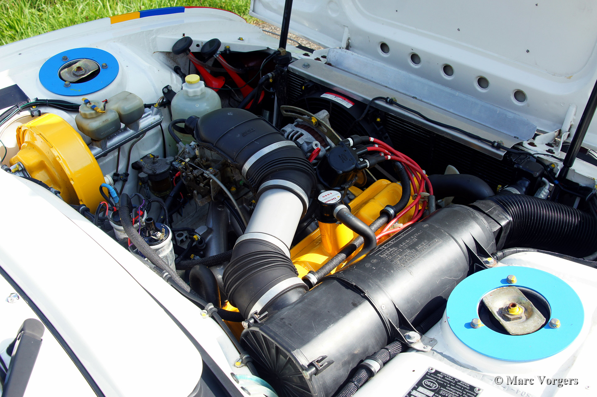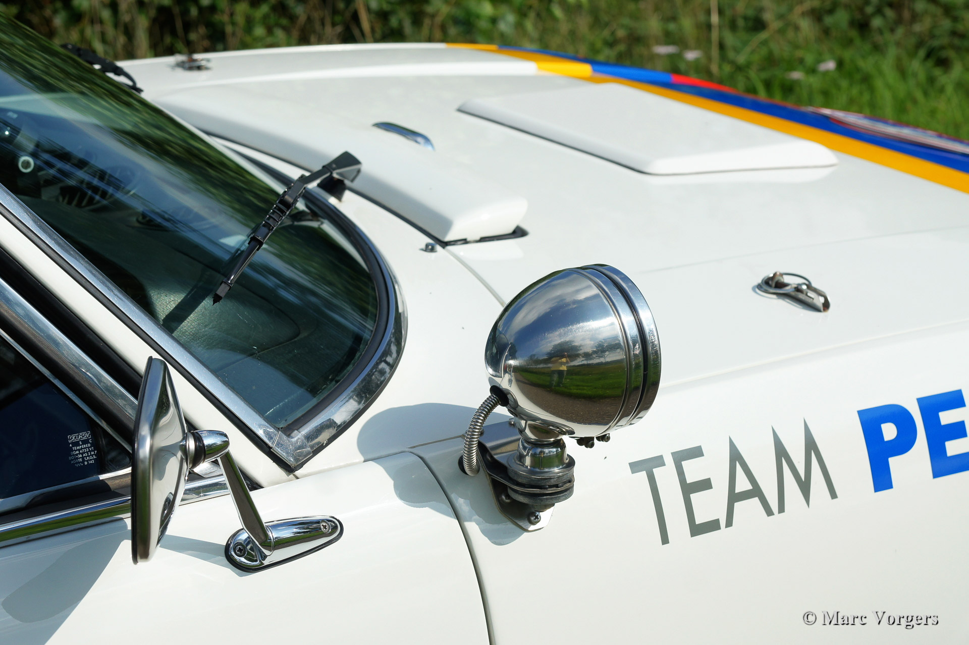 Peugeot 504 Coupe (C12) rally car, year 1976. Colour white trimmed with 'Team Peugeot' rally striping, black rally interior with blue rally seats. The car was inspired upon the successful Peugeot 504 'works' rally cars of the 1970'ies. Next to all rally gear the car features a built in electric cooling box and air conditioning in the rear.