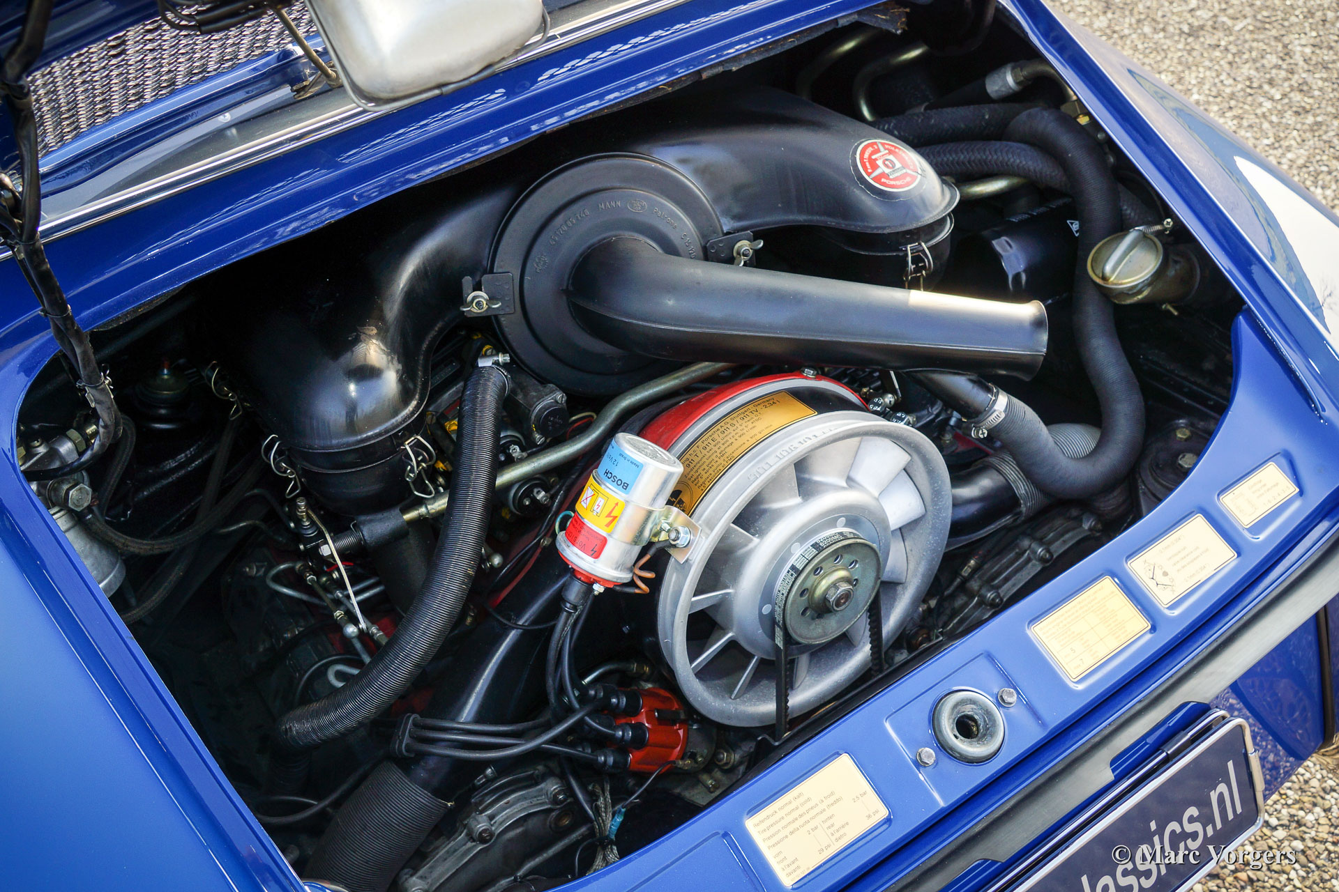 The Porsche 911 was designed with a steel unitary bodywork construction in which the engine was located behind the rear axle. The 911 engine is a air-cooled six cylinder "boxer" engine. The suspension of the Porsche 911 was independent from the start as was a five speed gearbox with floor shift.