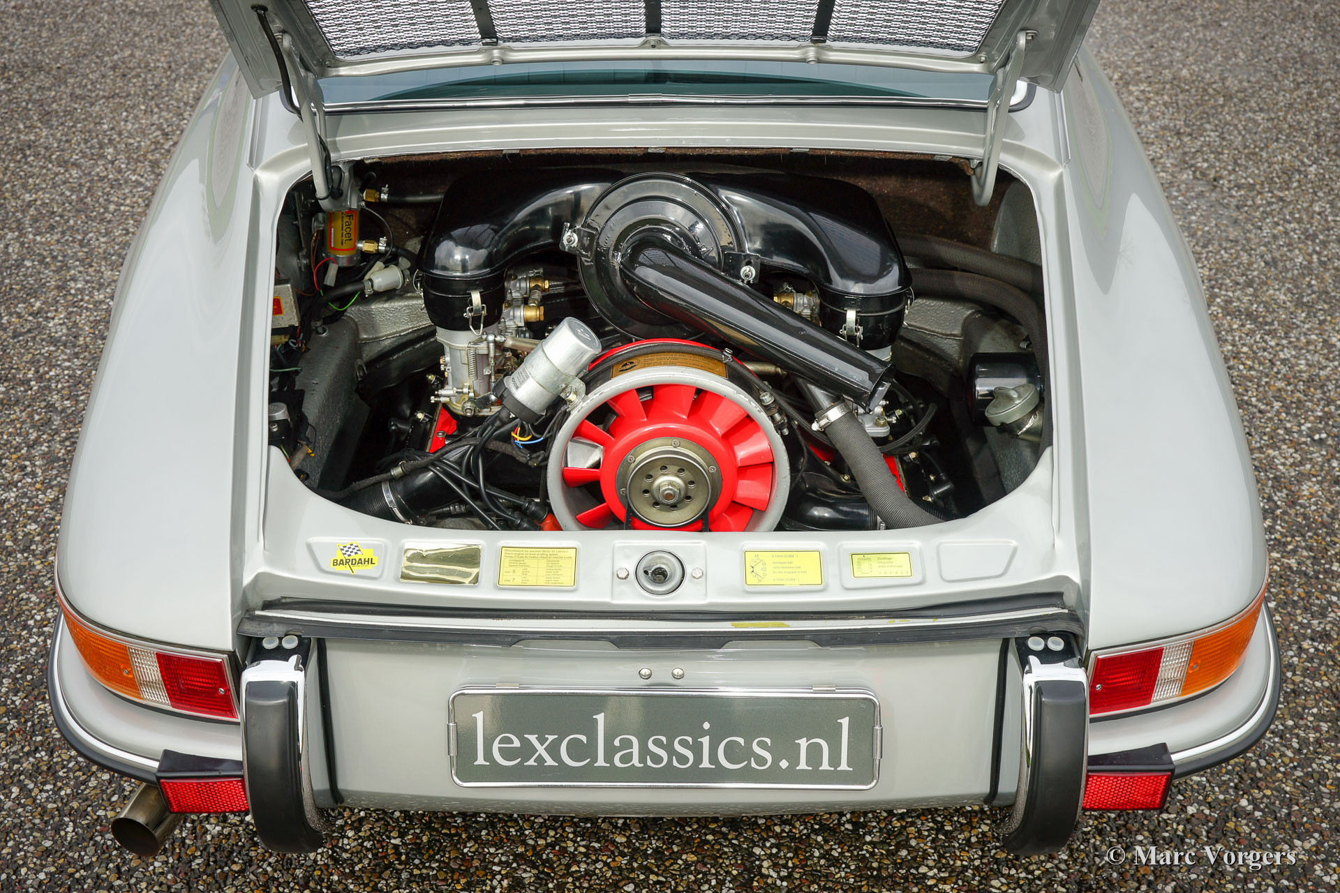 The Porsche 911 was designed with a steel unitary bodywork construction in which the engine was located behind the rear axle. The 911 engine is a air-cooled six cylinder "boxer" engine. The suspension of the Porsche 911 was independent from the start as was a five speed gearbox with floor shift.