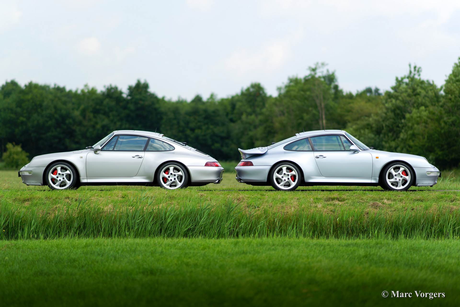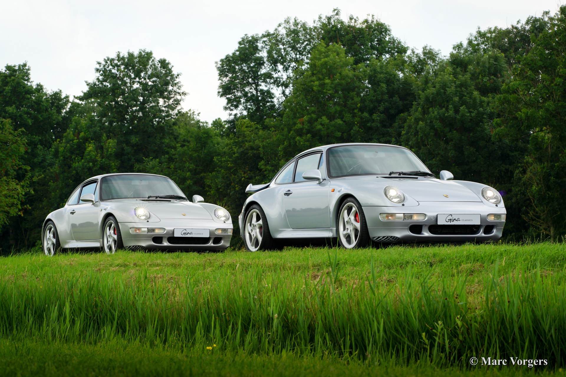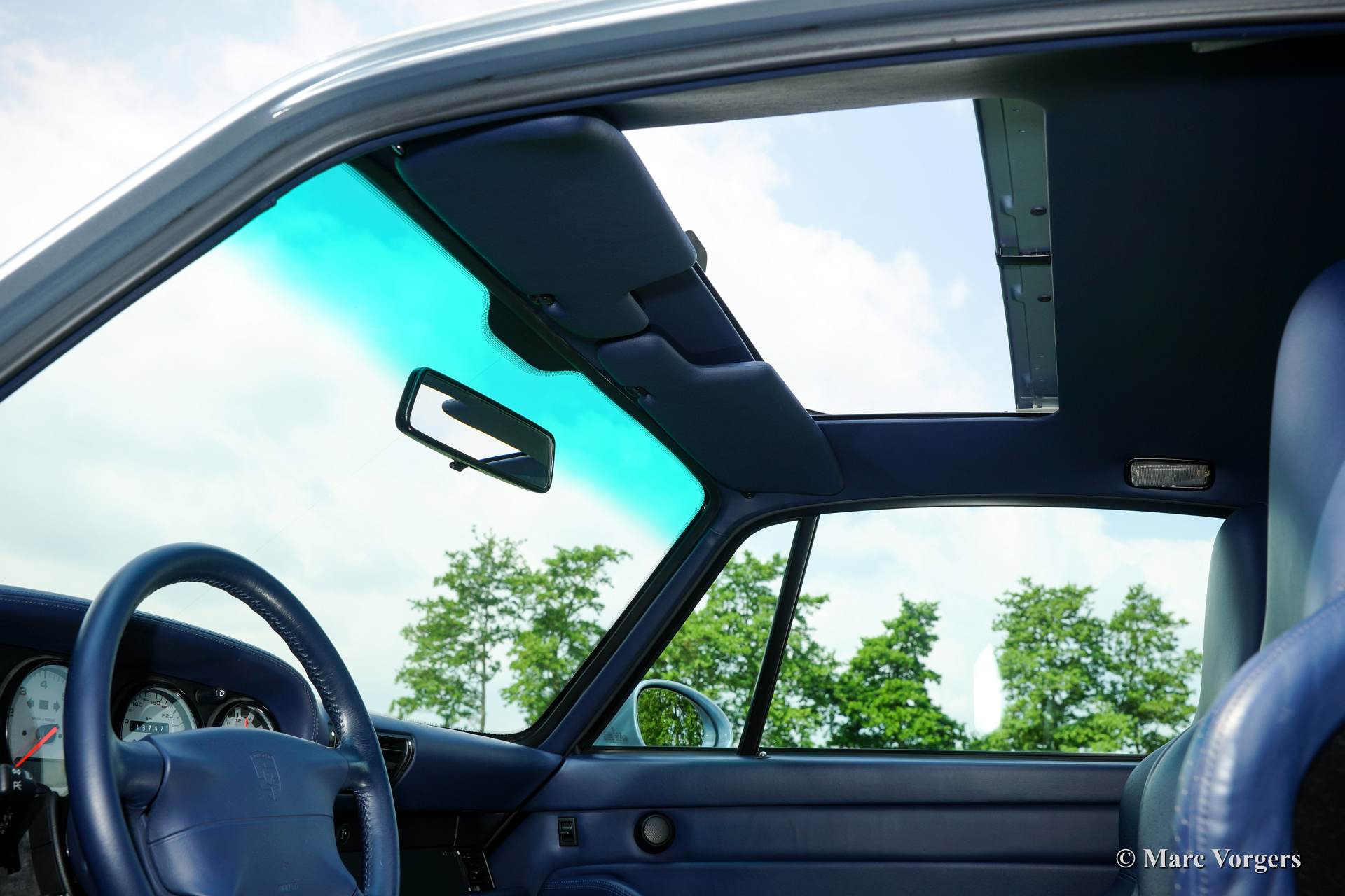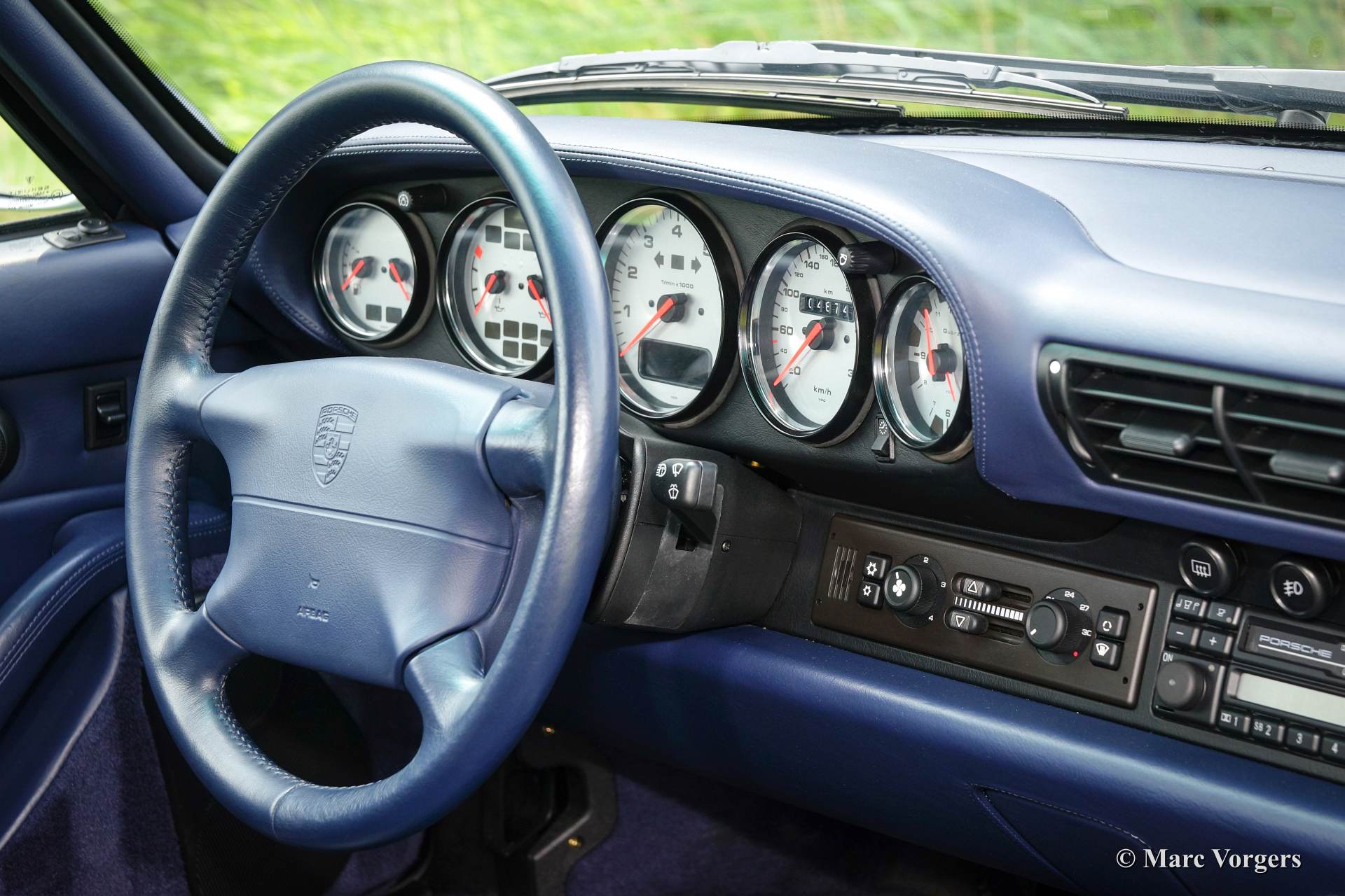 Porsche 911 (993) Turbo, year 1995. Colour Polar silver metallic with a blue leather interior.