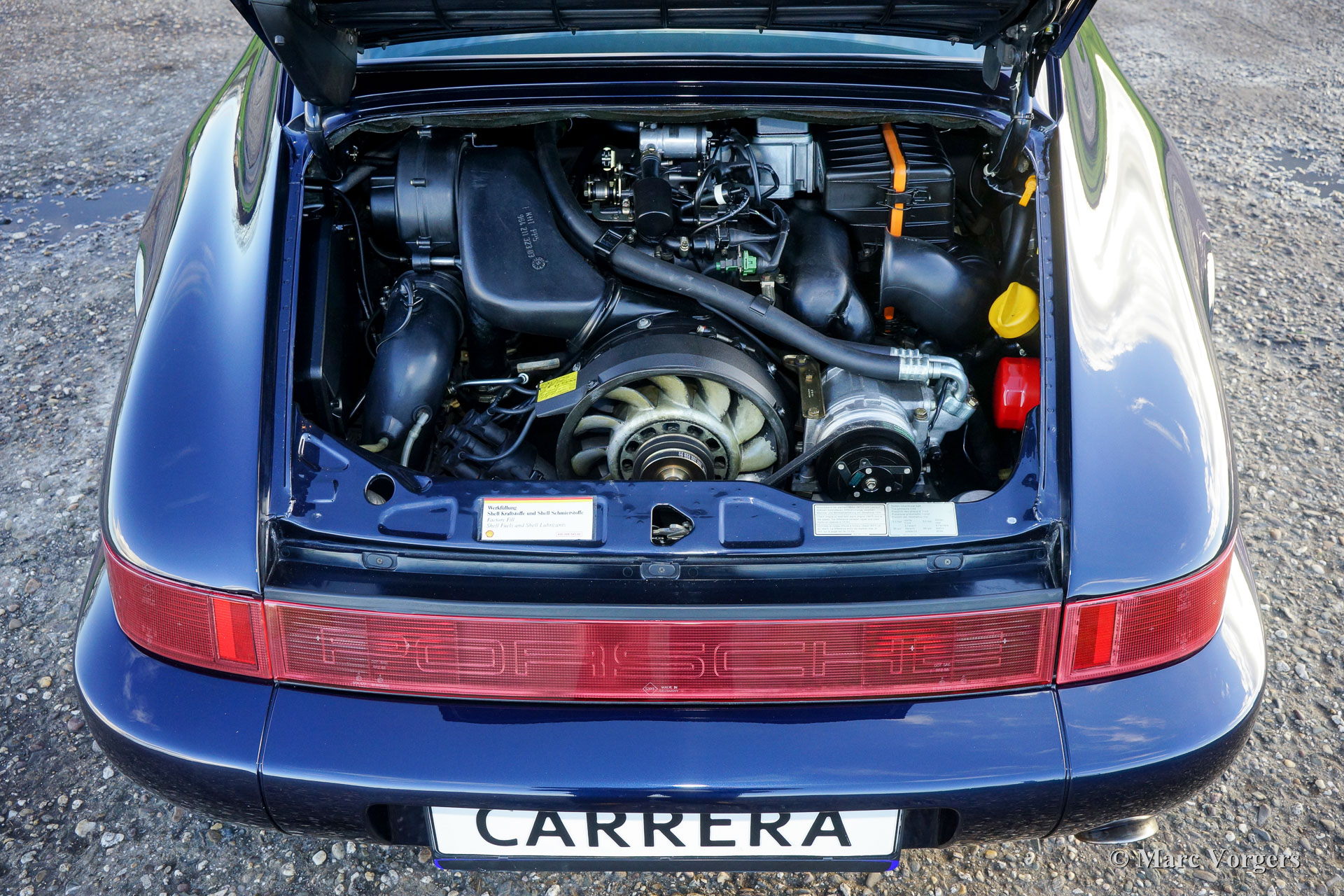 The Porsche 911/964 interior is almost 100% identical to the Carrera 3.2 liter cabin. Only the Carrera 4 shows a higher center section to house the four wheel drive transmission to the front wheels. The Porsche 911/ 964 is powered by the famous Porsche "flat six" boxer engine. The cylinder capacity was enlarged to 3.6 liter where the Carrera 3.2 measured 3.2 liter. The engine was fitted with two spark plugs per cylinder and the engine unit was coupled with a 5-speed gearbox. From 1990 , with the introduction of the Carrera 2, an automatic/ pushbutton manual 5-speed "Tiptronic" gearbox became available.