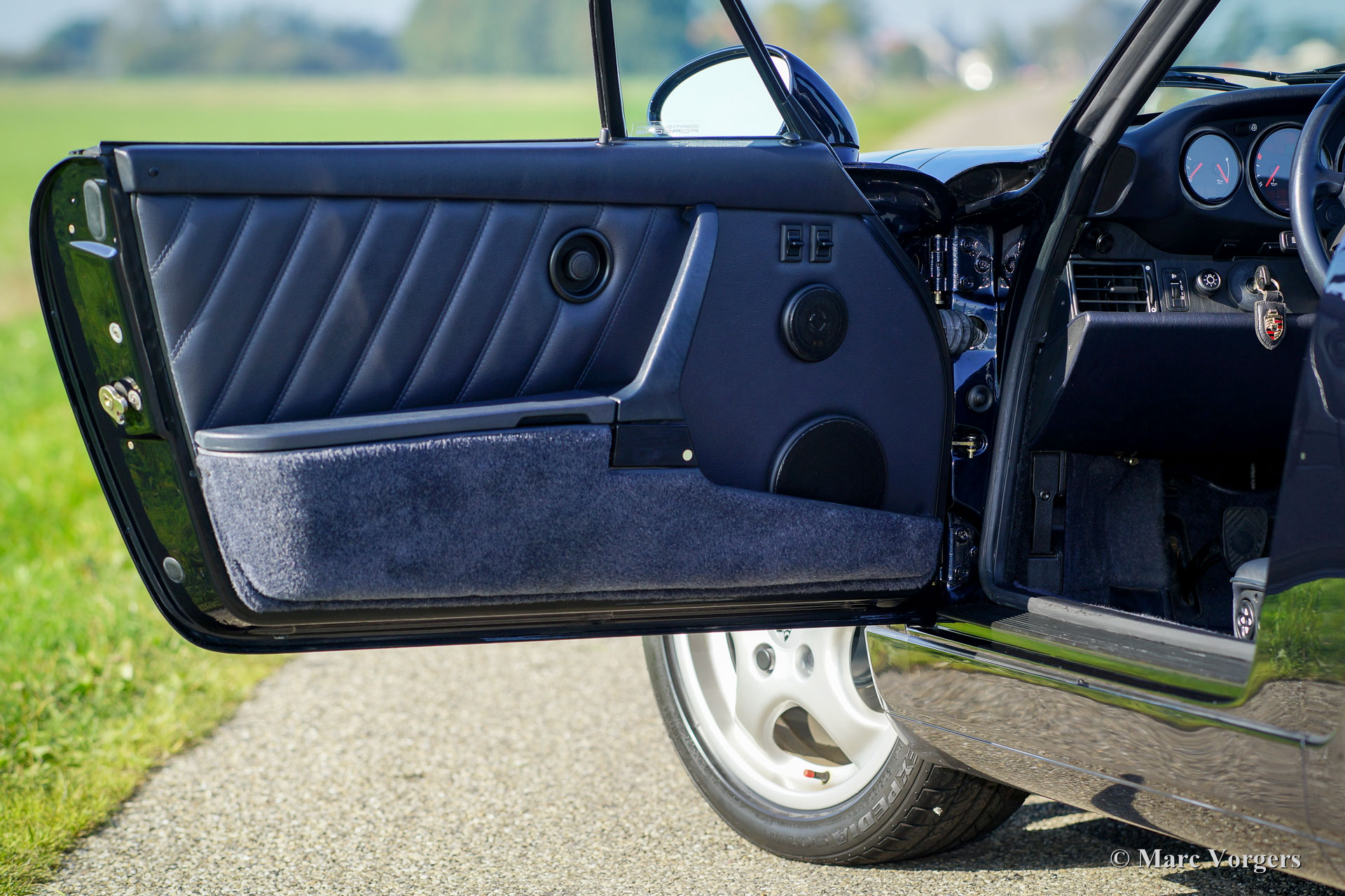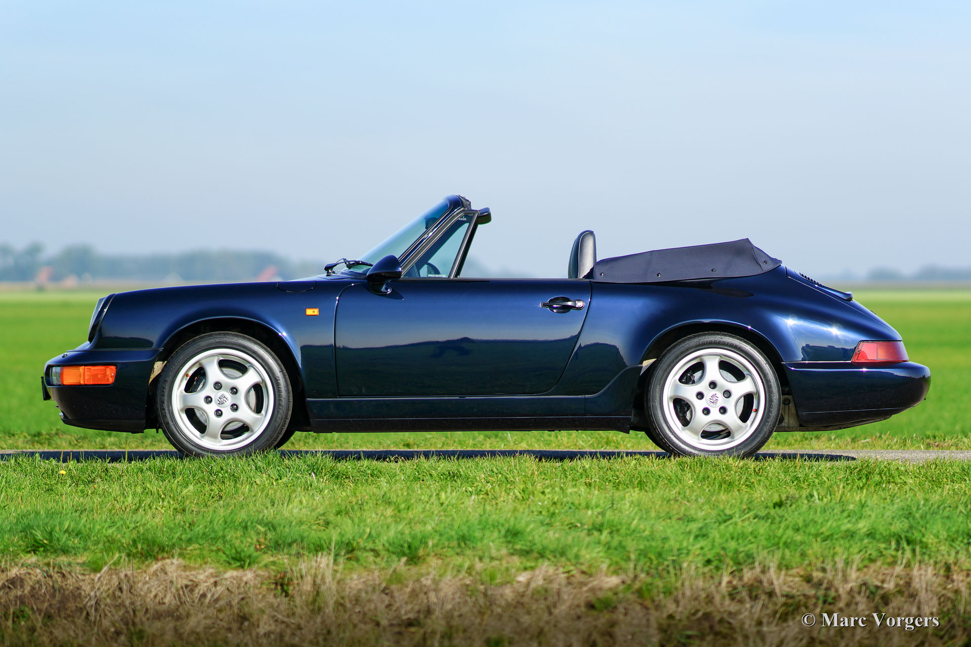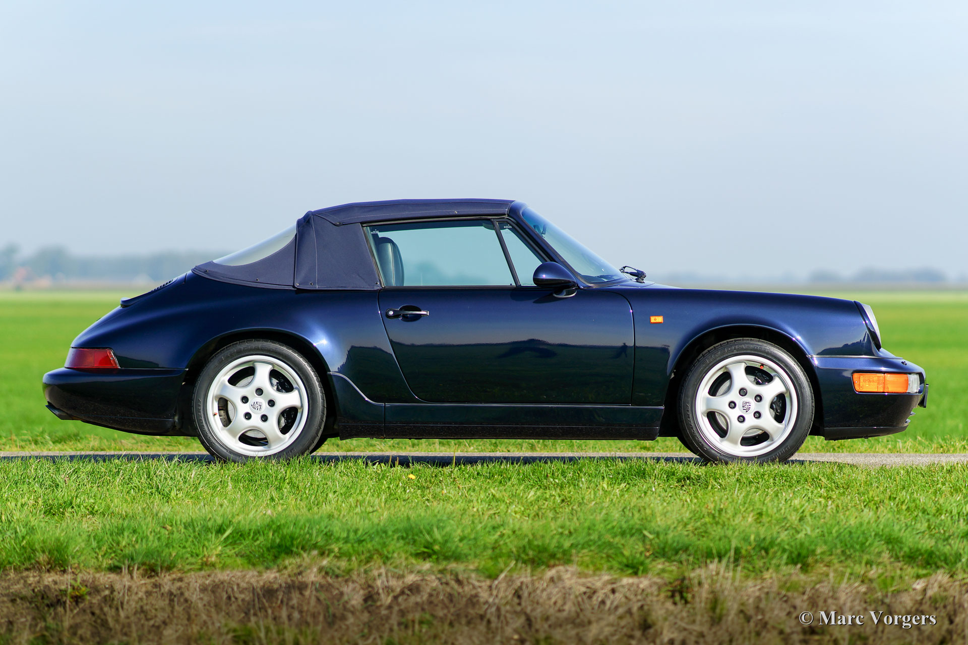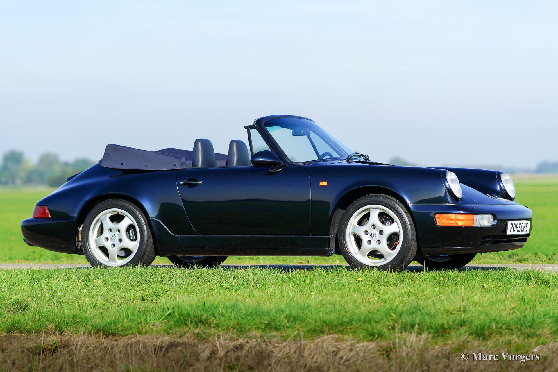 Porsche 911 (964) Carrera 4 cabriolet, year 1992. Kleur ‘Midnight blue’ metallic with a blue leather interior and a black soft-top. This fantastic Porsche 911 Carrera 4 is in superb original TOP condition, like new! From new the car has driven 49.524 kilometres. The paint is still fully original and in pristine condition! It will be hard to find a better preserved example! This Porsche comes beautifully documented, the original booklets are present as are service invoices. The 964 Carrera 4 features permanent four wheel drive, a system that was developed from the legendary Porsche 959 which has won the rough Paris-Dakar rally. This is a top quality specimen.