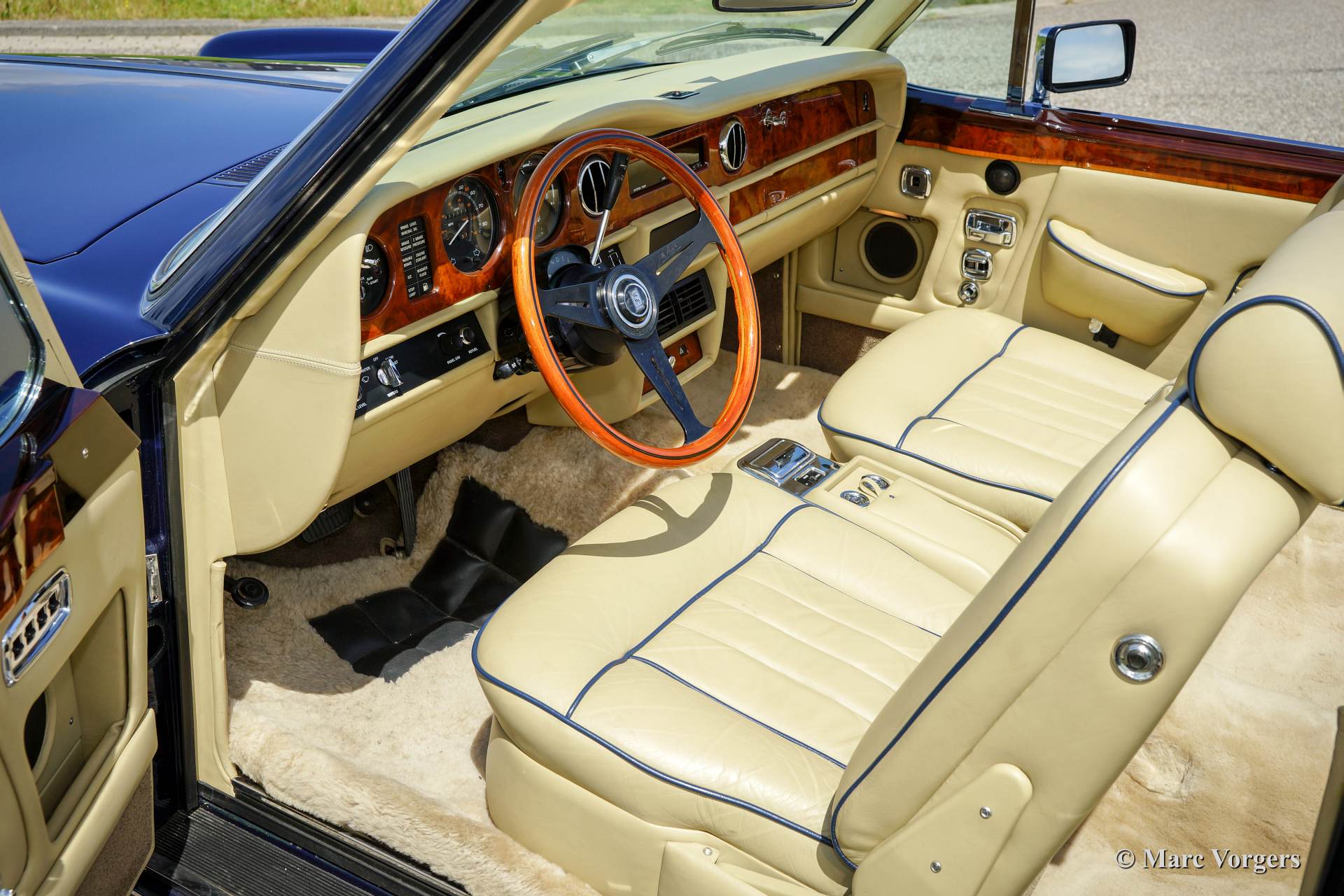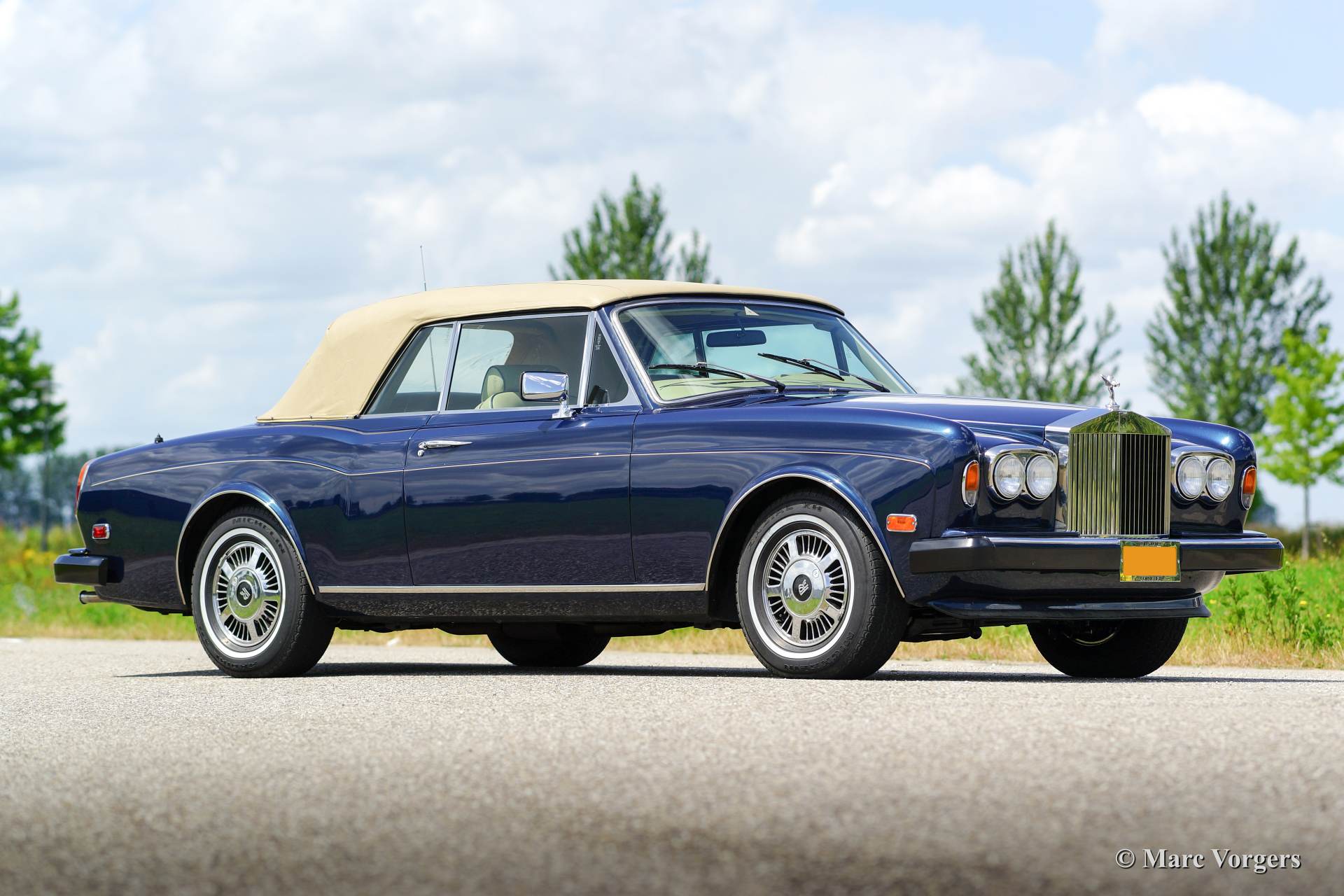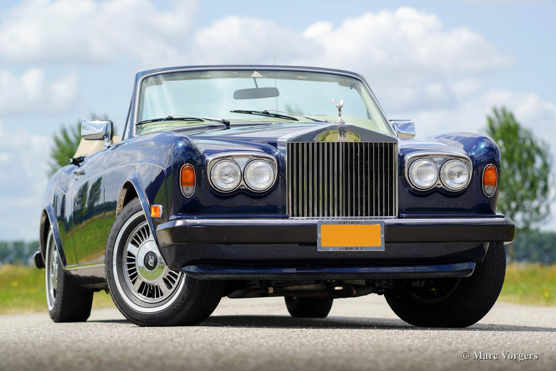 Rolls-Royce Corniche II, year 1984. Colour dark blue with a beige leather interior trimmed with blue piping. Beige convertible top and hood cover. This beautiful and very stylish Rolls-Royce Corniche is in excellent original condition and the car drives superbly. The driving experience is very comfortable and relaxing. By pressing the throttle a little deeper the powerful V8 engine is at your service swiftly and immediately as is the smooth shifting automatic gearbox. Only 2.669 Rolls-Royce cars of this type have been built.