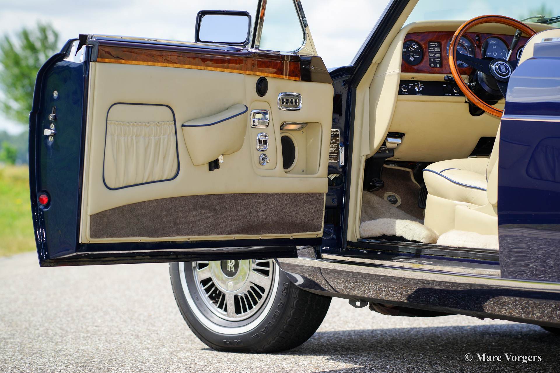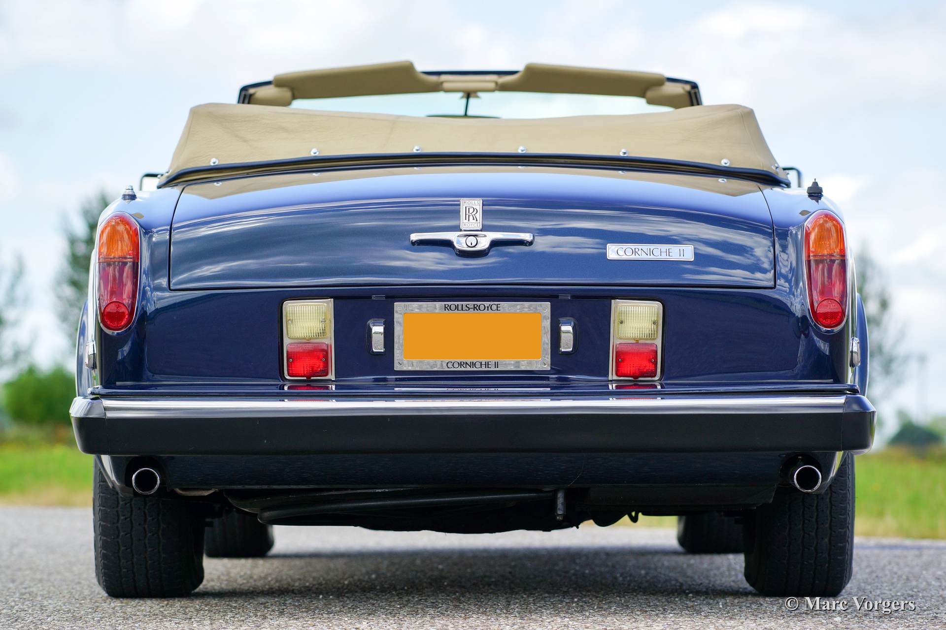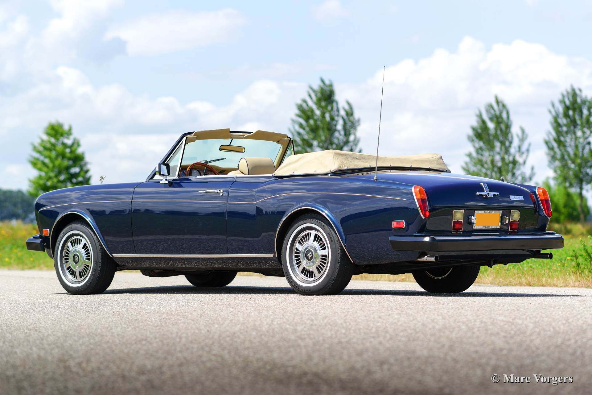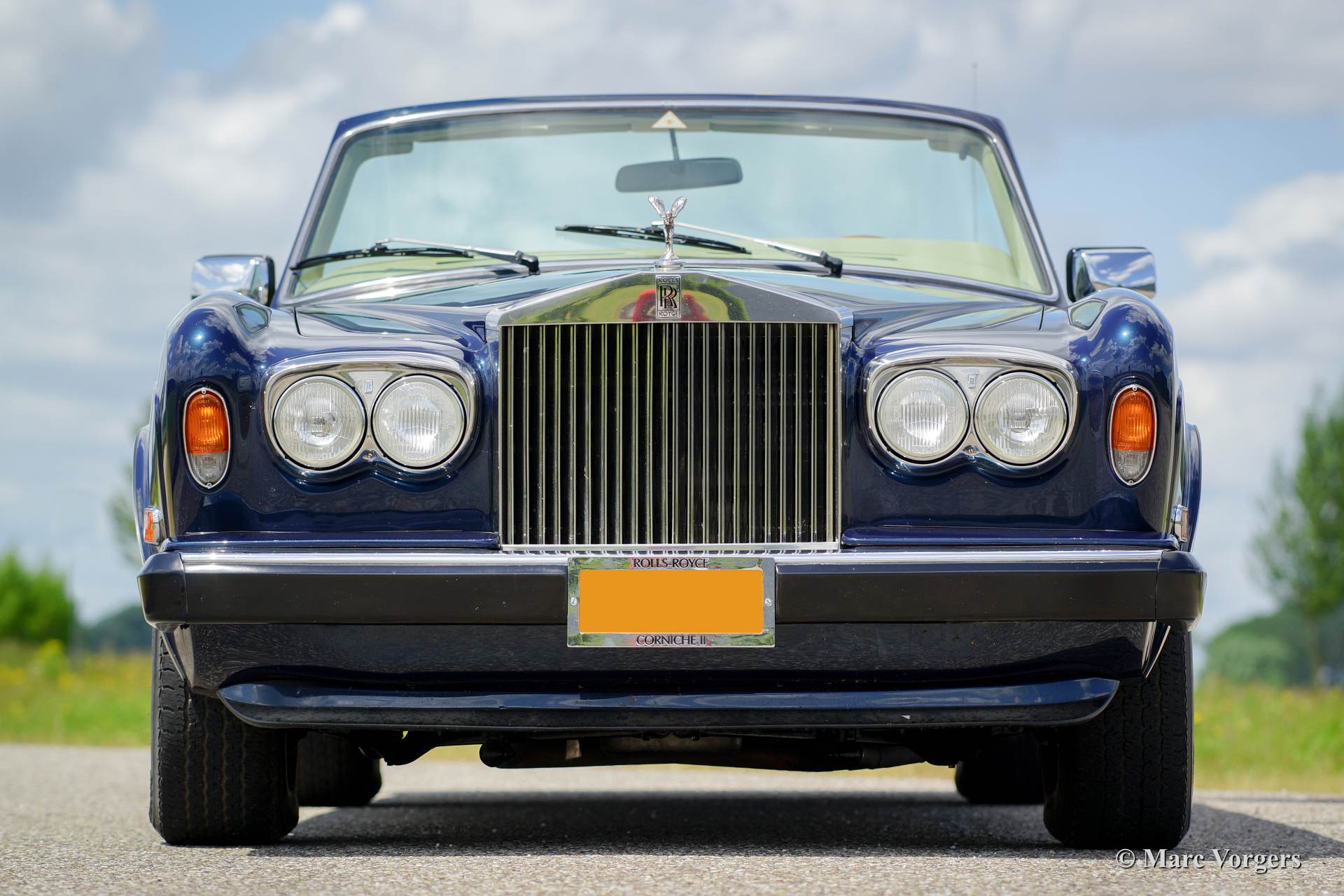 Rolls-Royce Corniche II, year 1984. Colour dark blue with a beige leather interior trimmed with blue piping. Beige convertible top and hood cover. This beautiful and very stylish Rolls-Royce Corniche is in excellent original condition and the car drives superbly. The driving experience is very comfortable and relaxing. By pressing the throttle a little deeper the powerful V8 engine is at your service swiftly and immediately as is the smooth shifting automatic gearbox. Only 2.669 Rolls-Royce cars of this type have been built.