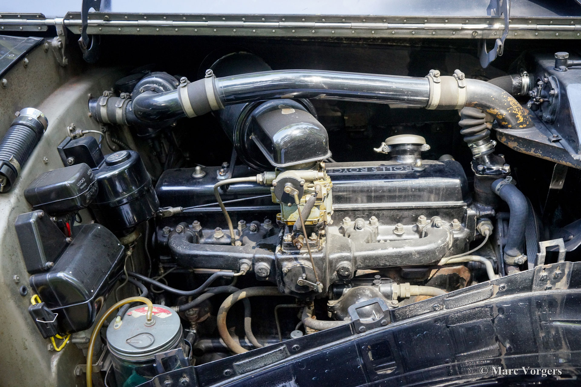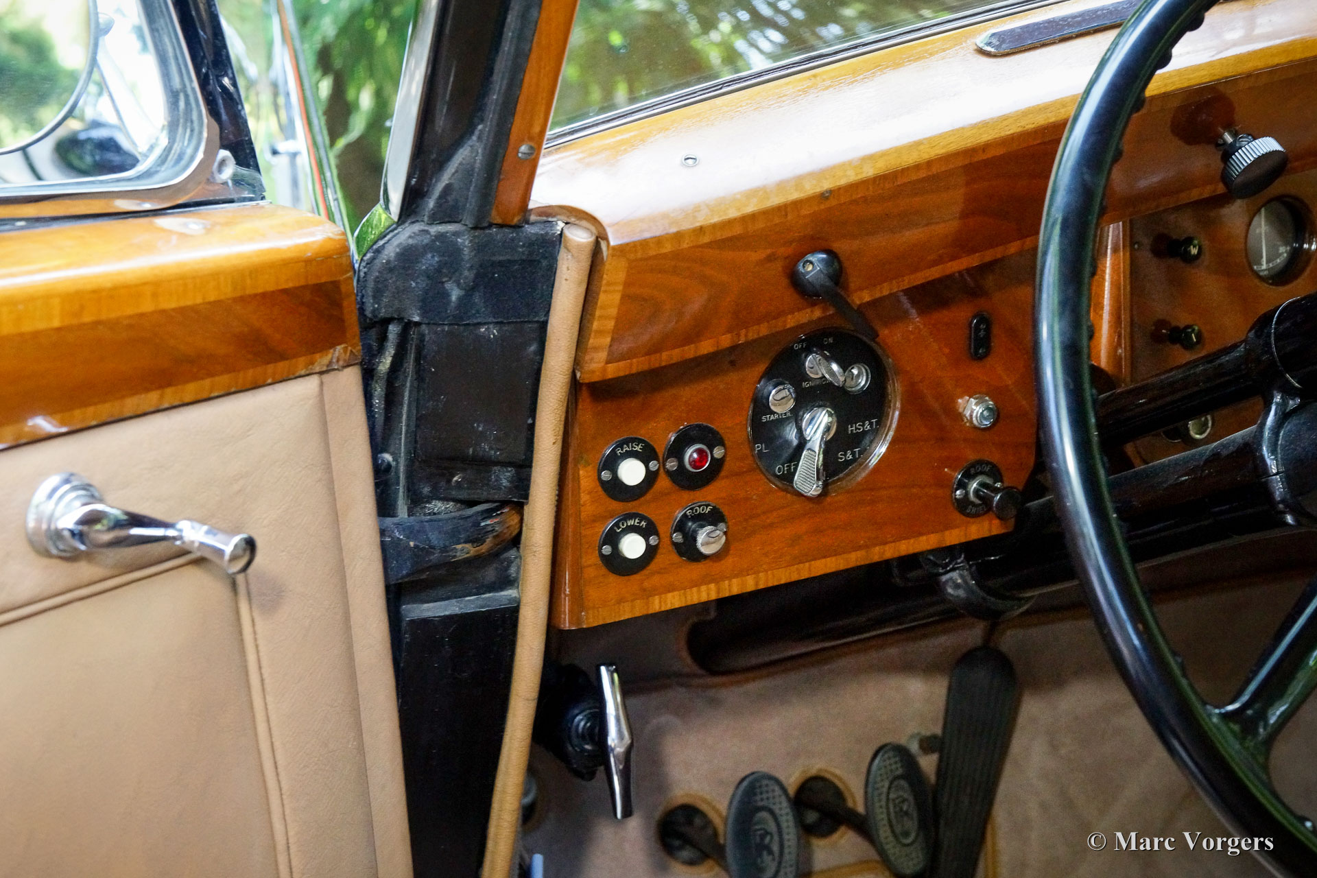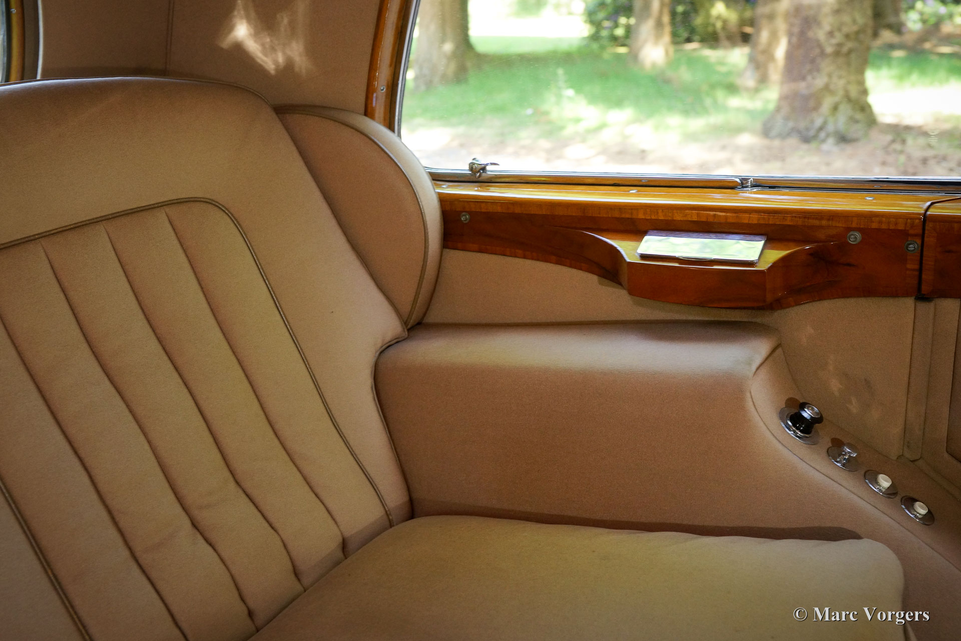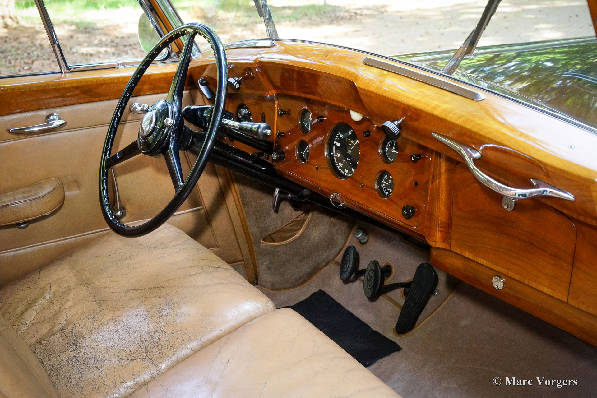 Rolls-Royce Silver Wraith, year 1952. Colour black. In the magnificent interior, the driver and co-driver are seated on beige leather seats. The ultra-luxurious passenger compartment features beige coloured soft cloth upholstery and deep wool carpet in a matching colour. This gorgeous and unique Rolls-Royce was sold new to an Italian Count and it has been in service of the family for many decades. A unique automobile with LHD steering and a very remarkable bodywork by Mulliner. This Rolls-Royce is in very good and in fully original condition: a magnificent time-machine! The driving experience in the front is one of sheer ease of control mastering this big machine. In the rear, the passengers are treated to sheer comfort in their own ‘cocoon’ featuring masterly seats, roll-up curtains, feet rests and much more. Their weekend travel suitcases are located neatly in front of their feet. The driver and passenger compartments can be divided with an electrically operated glass panel. The Rolls-Royce Silver Wraith is the last Rolls-Royce ‘chassis’ which was clad by body builders like Mulliner. This spacious limousine bodywork by Mulliner is a very impressive creation which offers the passengers a magnificent view on and over the countryside. This limousine must have been used for longer trans-European journeys; the car comes with a large original (detachable) roof rack and snow chains!