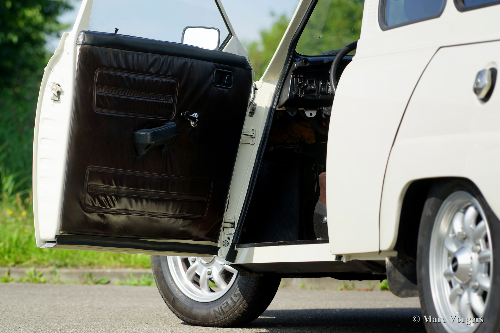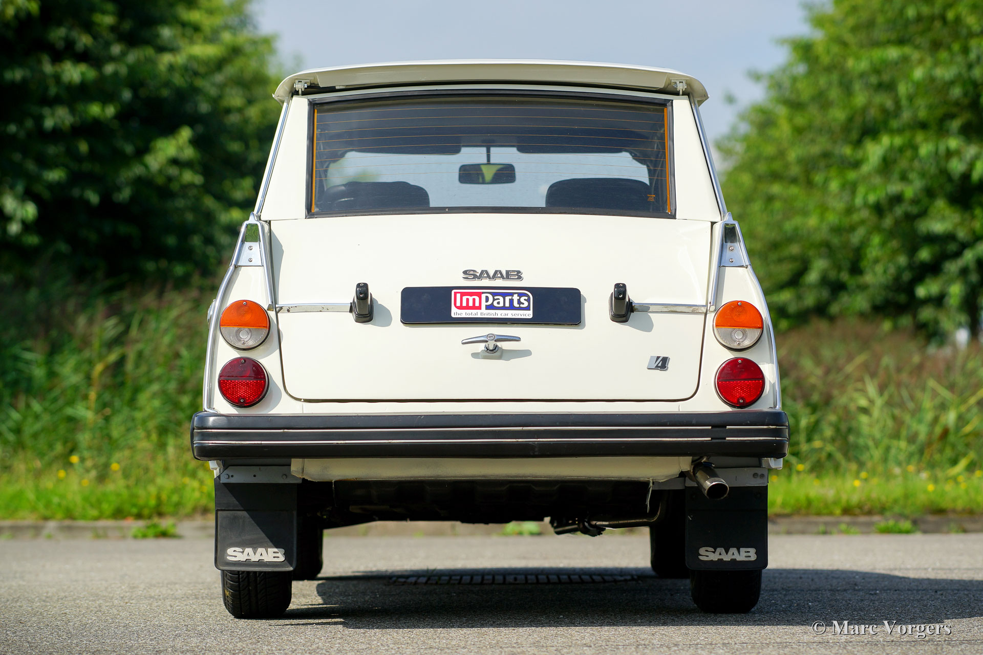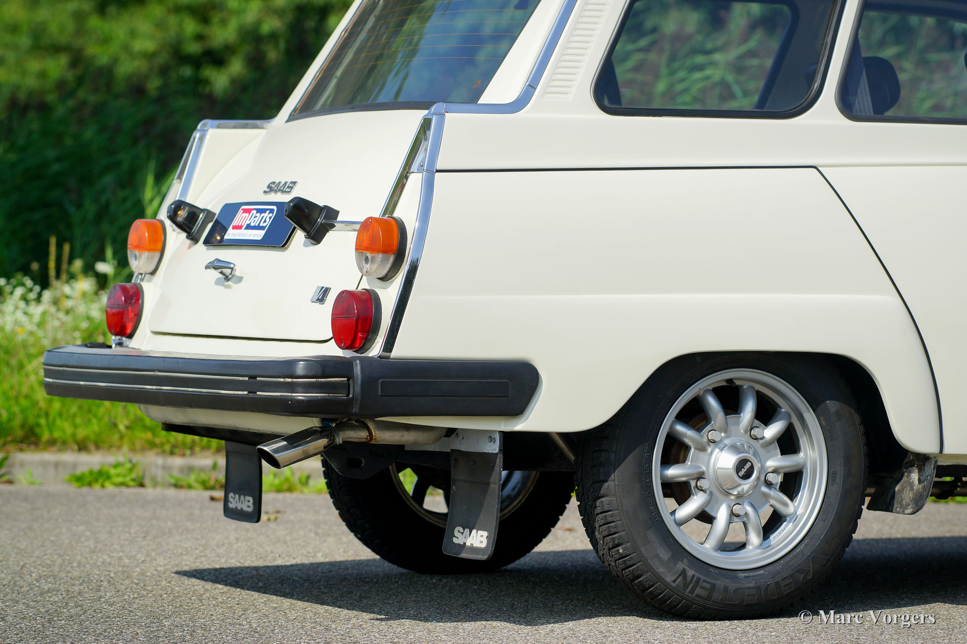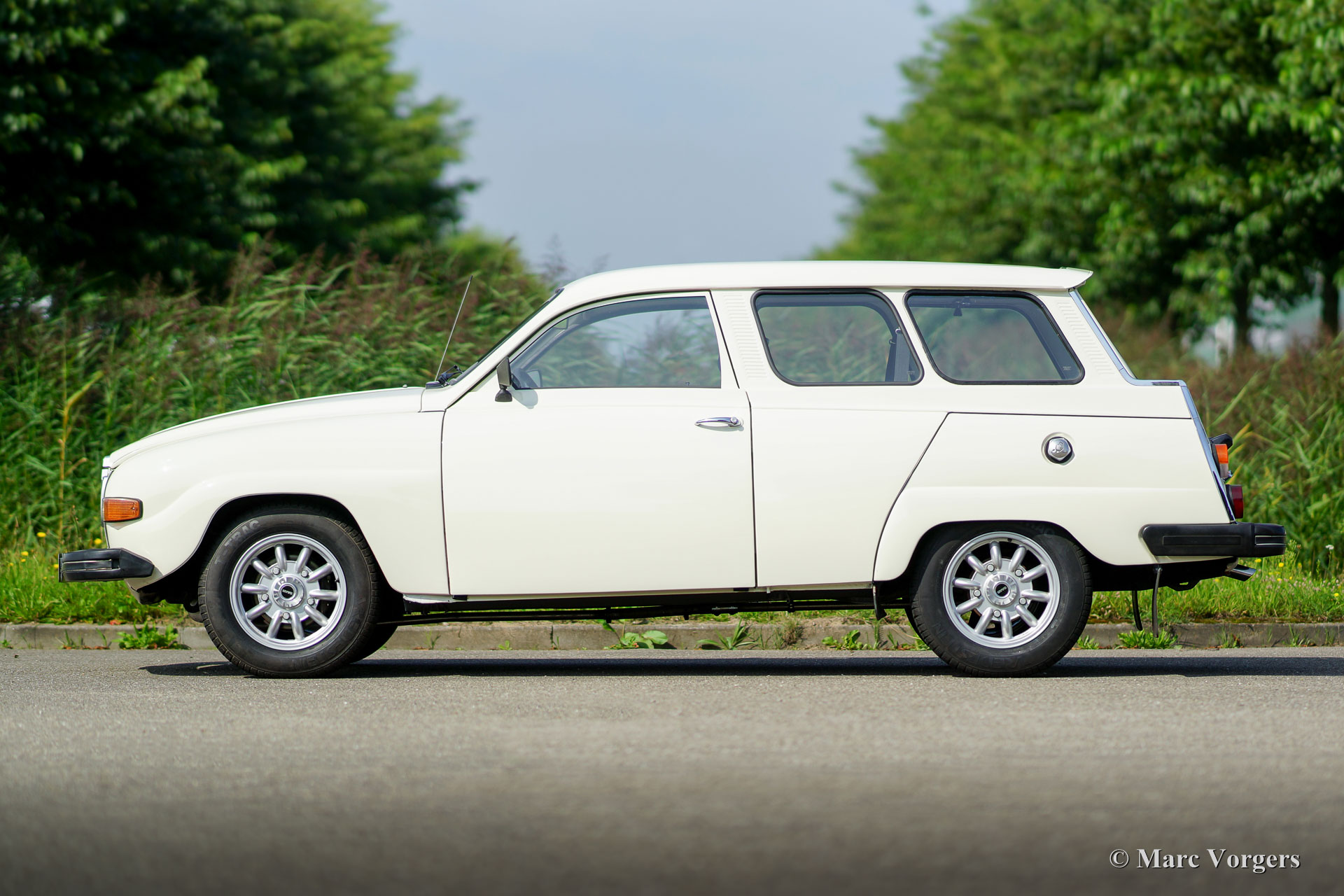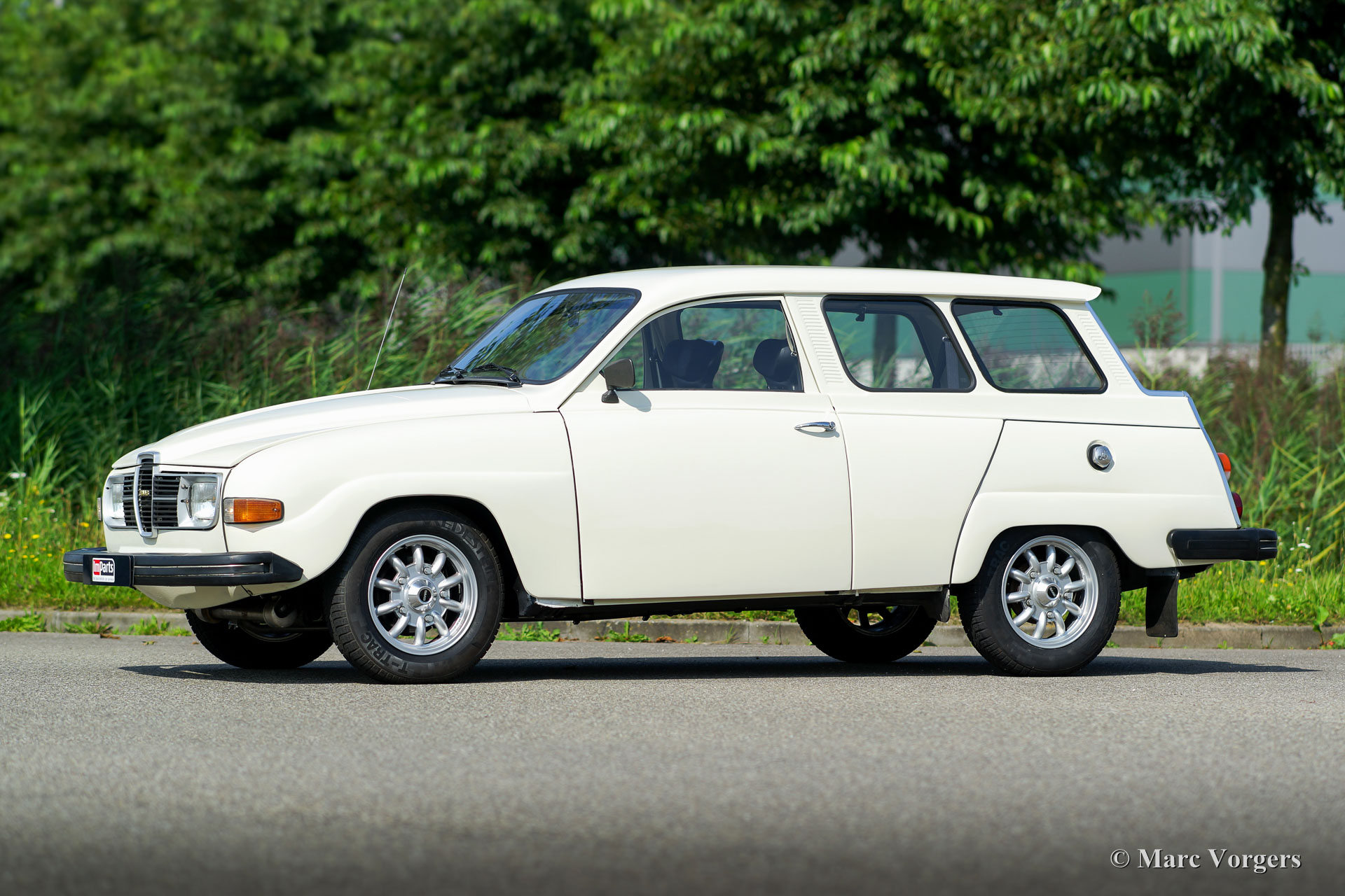 Saab 95 estate, year 1977. Colour white with a brown cloth/leathercloth interior and brown carpet. This characteristic Saab estate is in excellent condition and the car drives delightfully! The automobile features the rugged 1500 cc (Ford) V4 petrol engine which produces a very pleasant exhaust note. The power is transferred to the front wheels via a four speed manually operated gearbox with gear-change on the steering-column. The big rear door opens up to a spacious boot which can be enlarged by folding down the rear bench. The sporty Minilite-style wheels look splendid on this car! This is an excellent Saab 95 V4 estate; a delightfully eccentric Swedish classic!