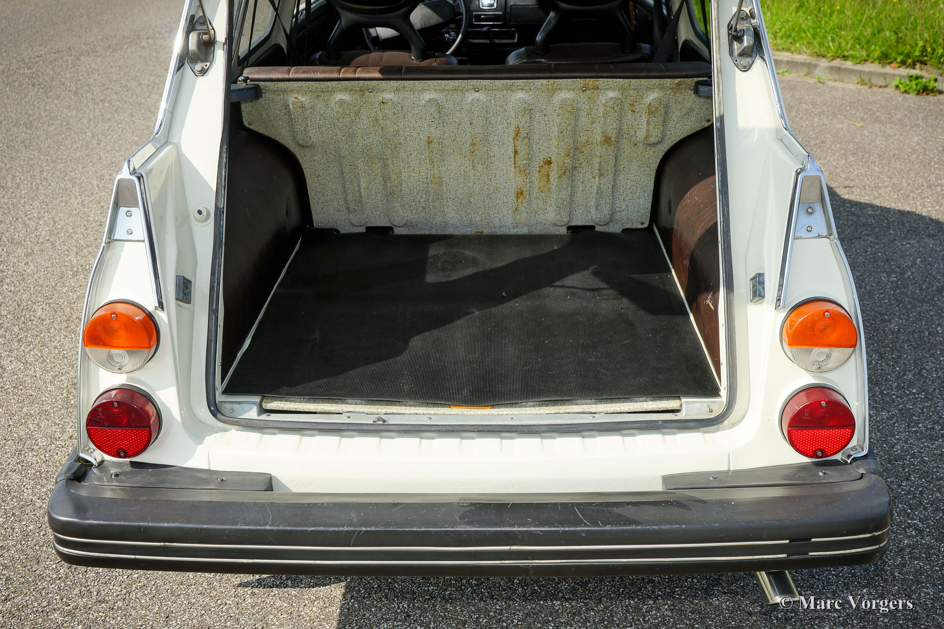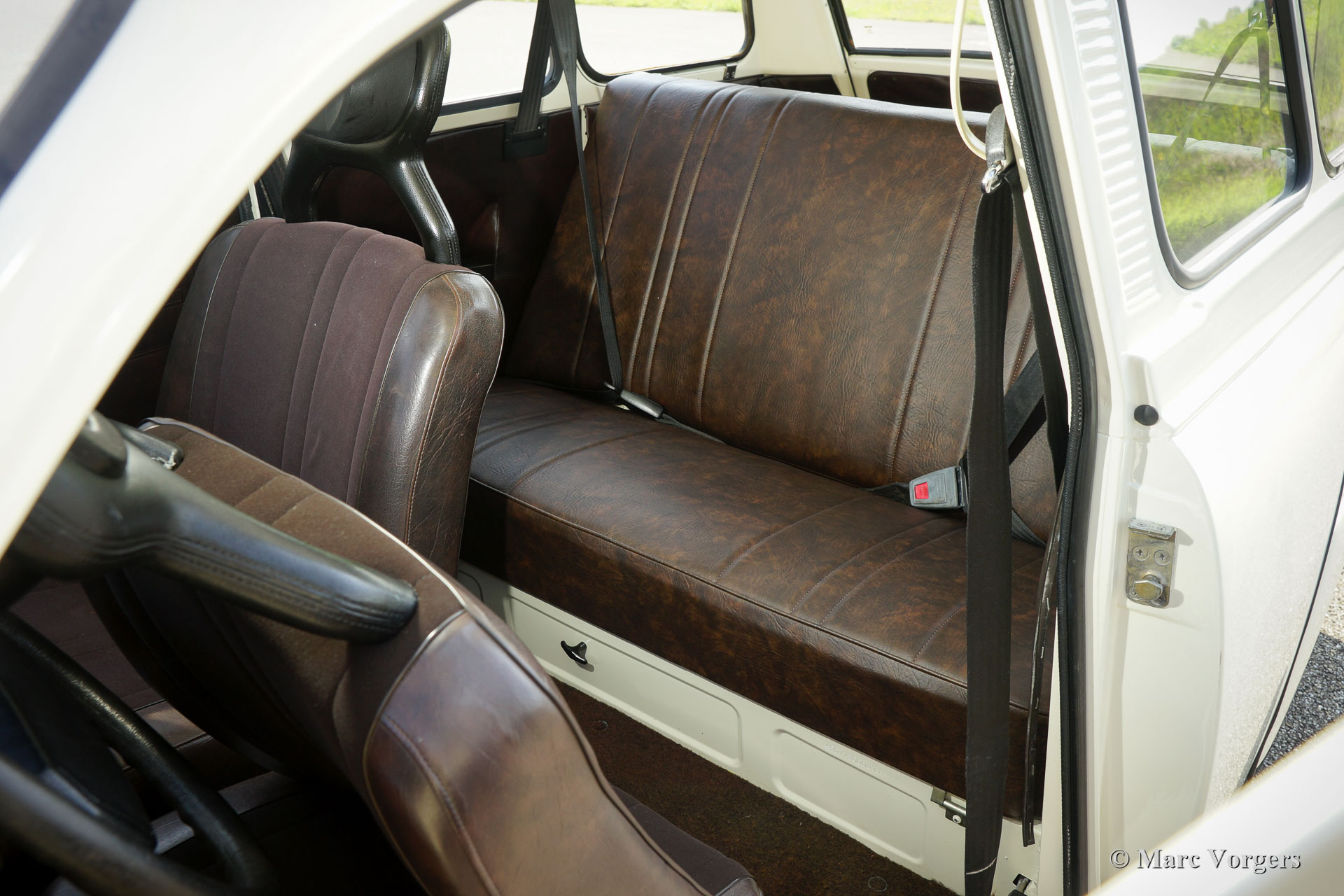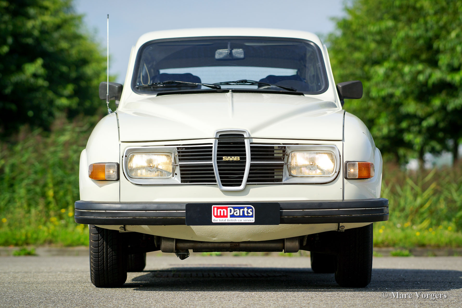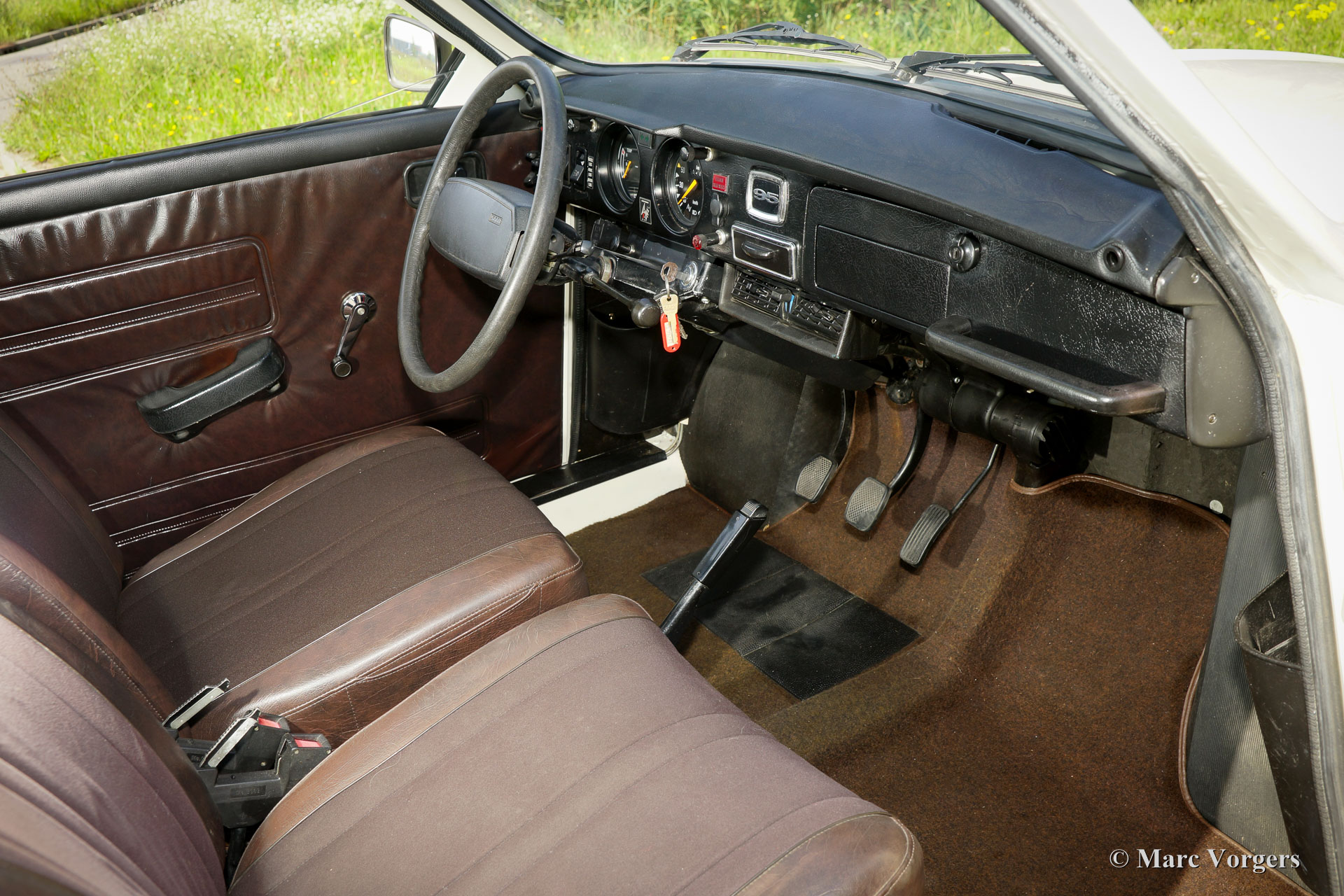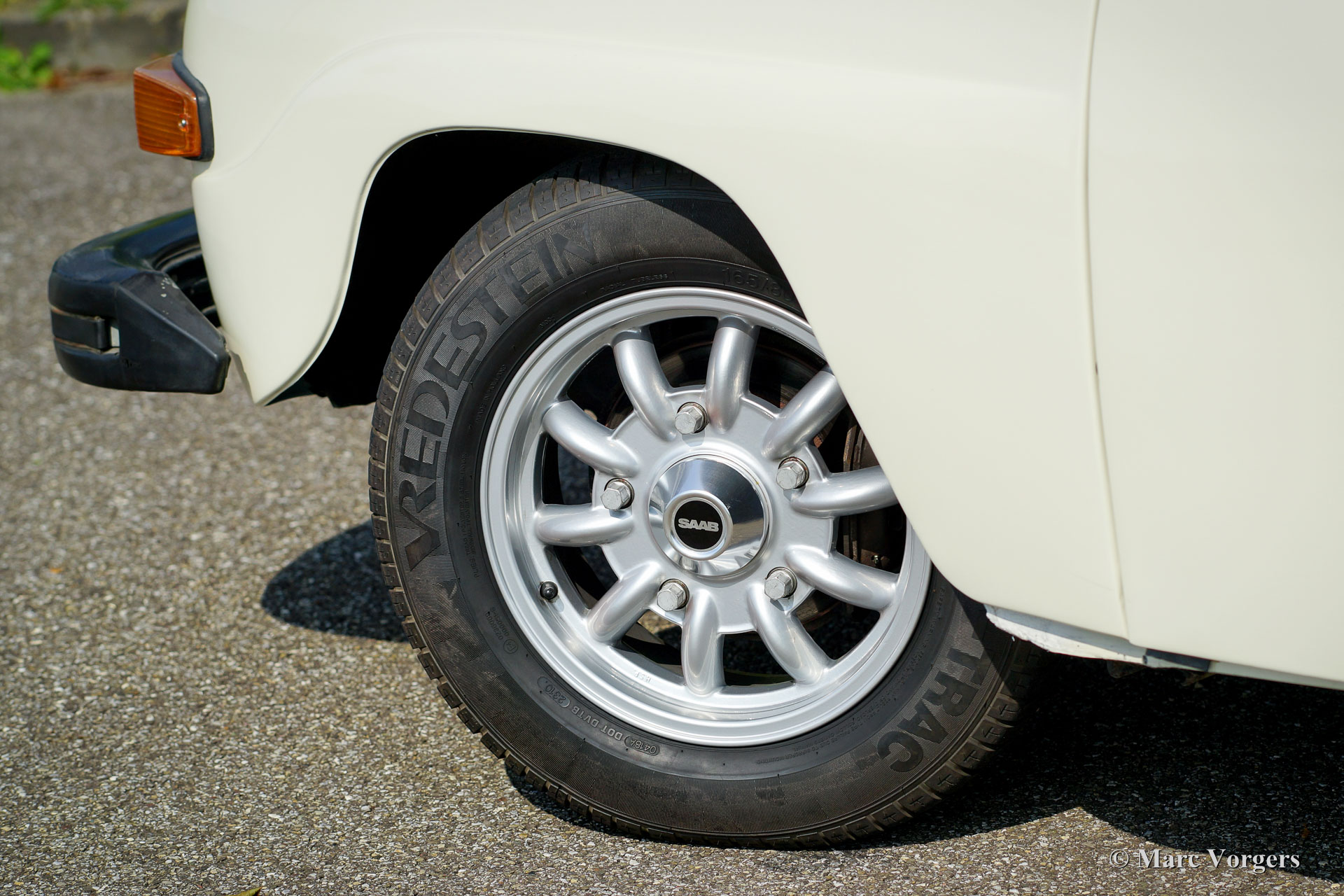 Saab 95 estate, year 1977. Colour white with a brown cloth/leathercloth interior and brown carpet. This characteristic Saab estate is in excellent condition and the car drives delightfully! The automobile features the rugged 1500 cc (Ford) V4 petrol engine which produces a very pleasant exhaust note. The power is transferred to the front wheels via a four speed manually operated gearbox with gear-change on the steering-column. The big rear door opens up to a spacious boot which can be enlarged by folding down the rear bench. The sporty Minilite-style wheels look splendid on this car! This is an excellent Saab 95 V4 estate; a delightfully eccentric Swedish classic!
