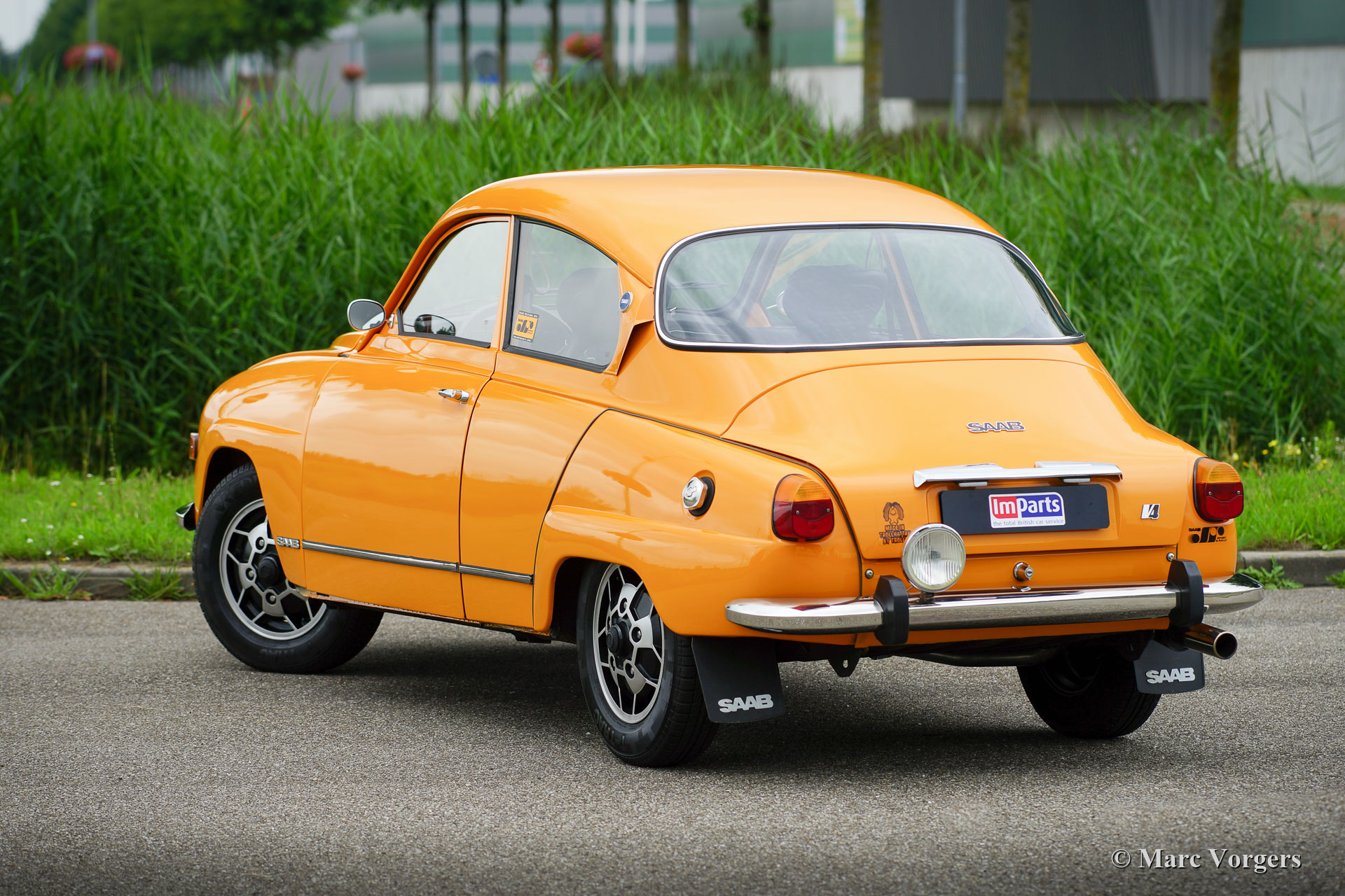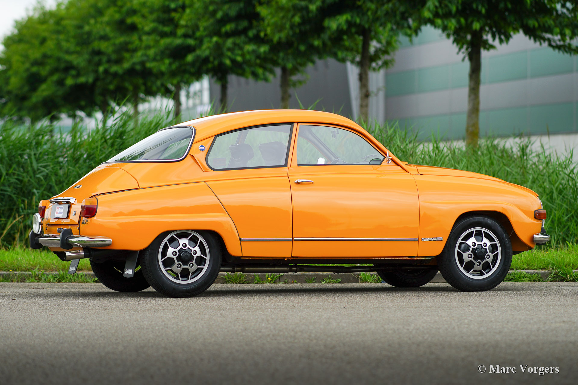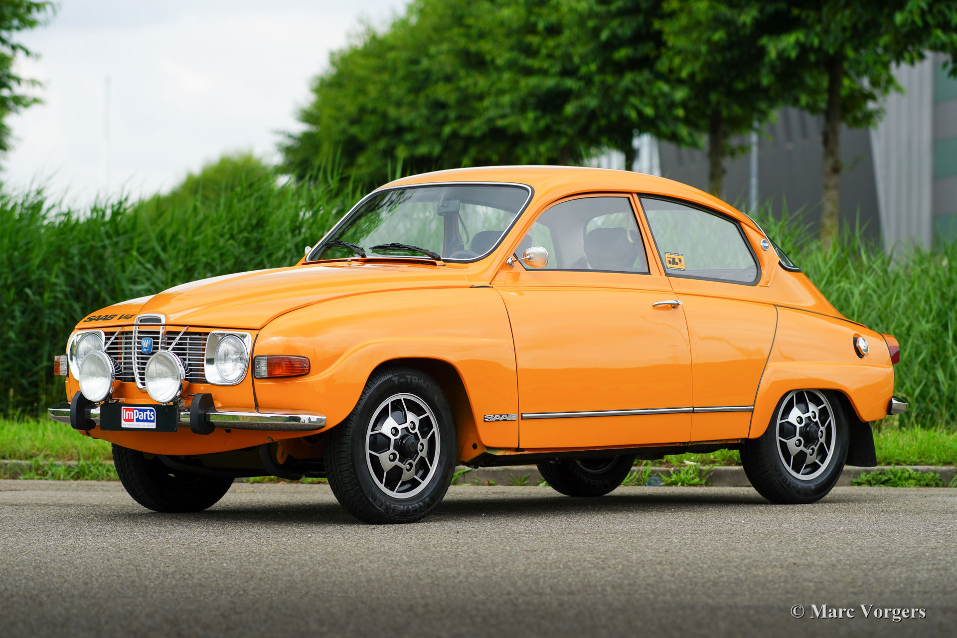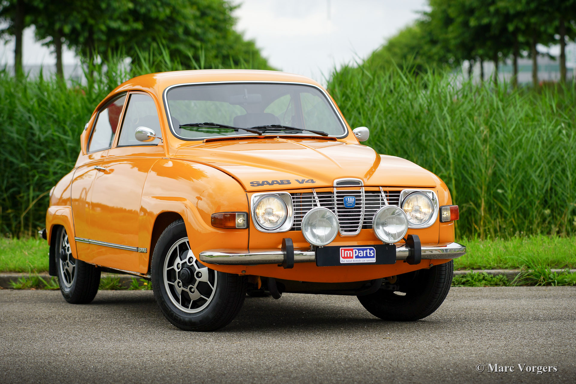 Saab 96 V4, year 1974. Colour Orange combined with a brown interior. This fantastic Saab 96 was beautifully restored and fitted with a tuned 1853 cc V4 engine! The engine delivers a mighty 130 bhp which makes this Saab 96 a true sports car! The road holding and handling are controlled by AVO shock absorbers around. The V4 exhaust note is fantastic because a special sports exhaust is fitted. This Saab is in excellent condition! The car features wonderful original Saab ‘Soccerball’ wheels shod with 165-80-15 tyres, Stainless Steel bumpers and a host of auxiliary lamps at the front: Two large Bosch spot lamps and two fog / cornering lamps. This is a highly enjoyable and very sporty Saab 96!