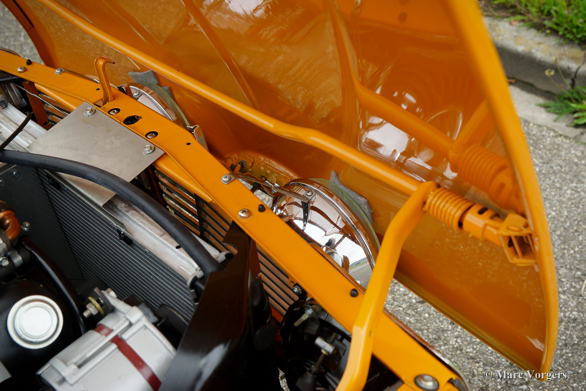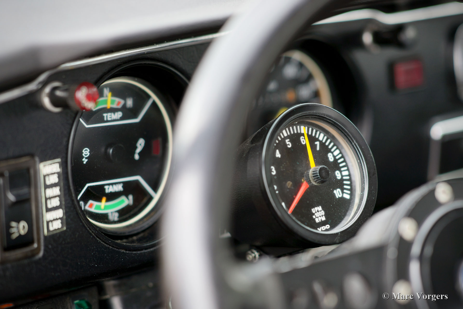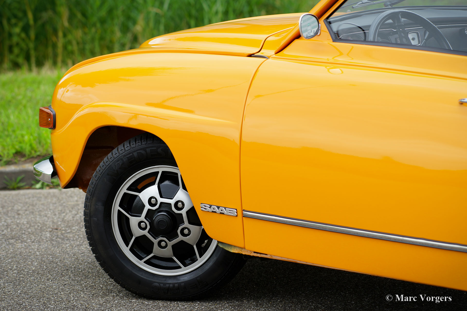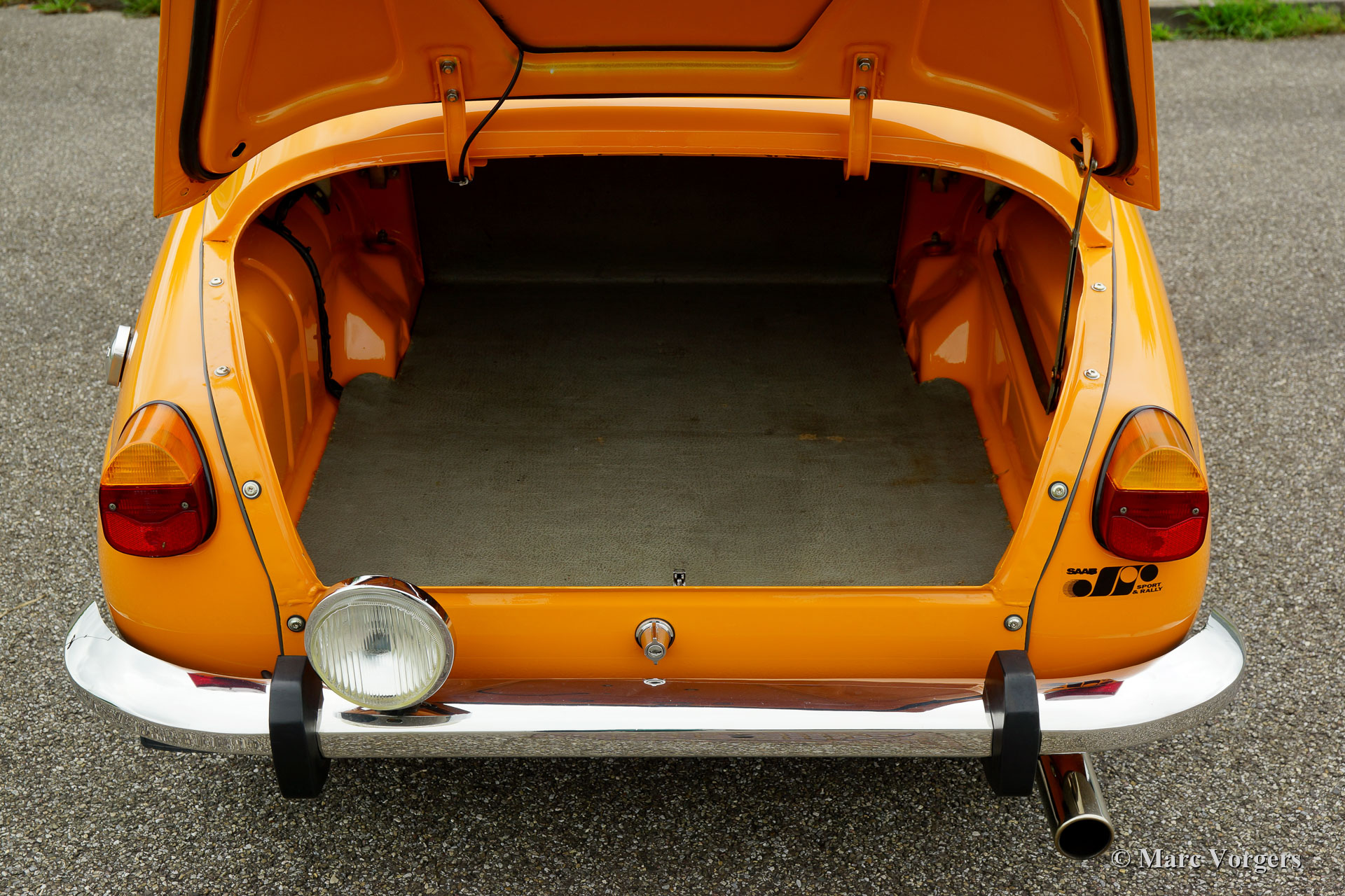 Saab 96 V4, year 1974. Colour Orange combined with a brown interior. This fantastic Saab 96 was beautifully restored and fitted with a tuned 1853 cc V4 engine! The engine delivers a mighty 130 bhp which makes this Saab 96 a true sports car! The road holding and handling are controlled by AVO shock absorbers around. The V4 exhaust note is fantastic because a special sports exhaust is fitted. This Saab is in excellent condition! The car features wonderful original Saab ‘Soccerball’ wheels shod with 165-80-15 tyres, Stainless Steel bumpers and a host of auxiliary lamps at the front: Two large Bosch spot lamps and two fog / cornering lamps. This is a highly enjoyable and very sporty Saab 96!