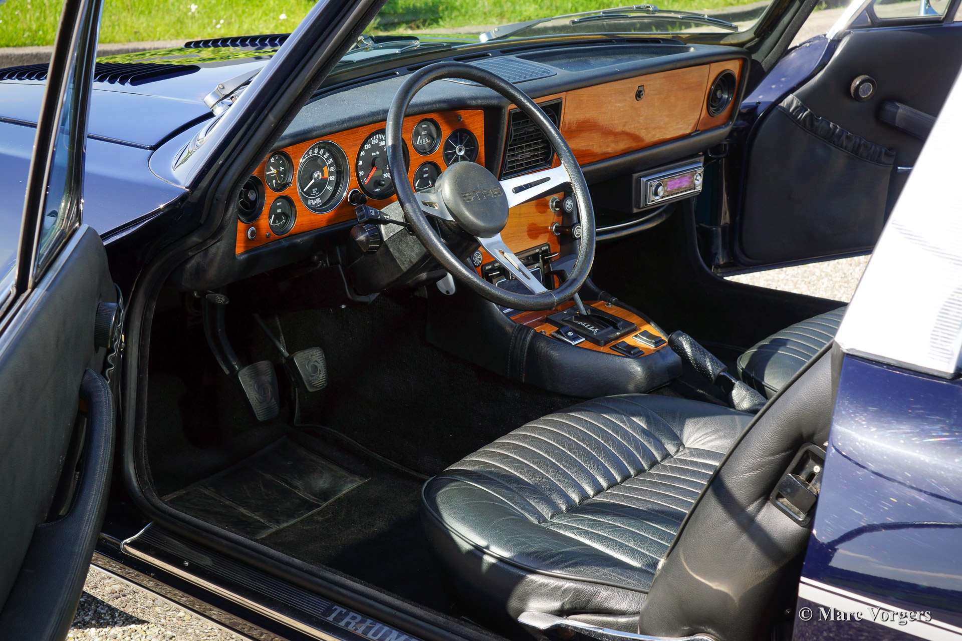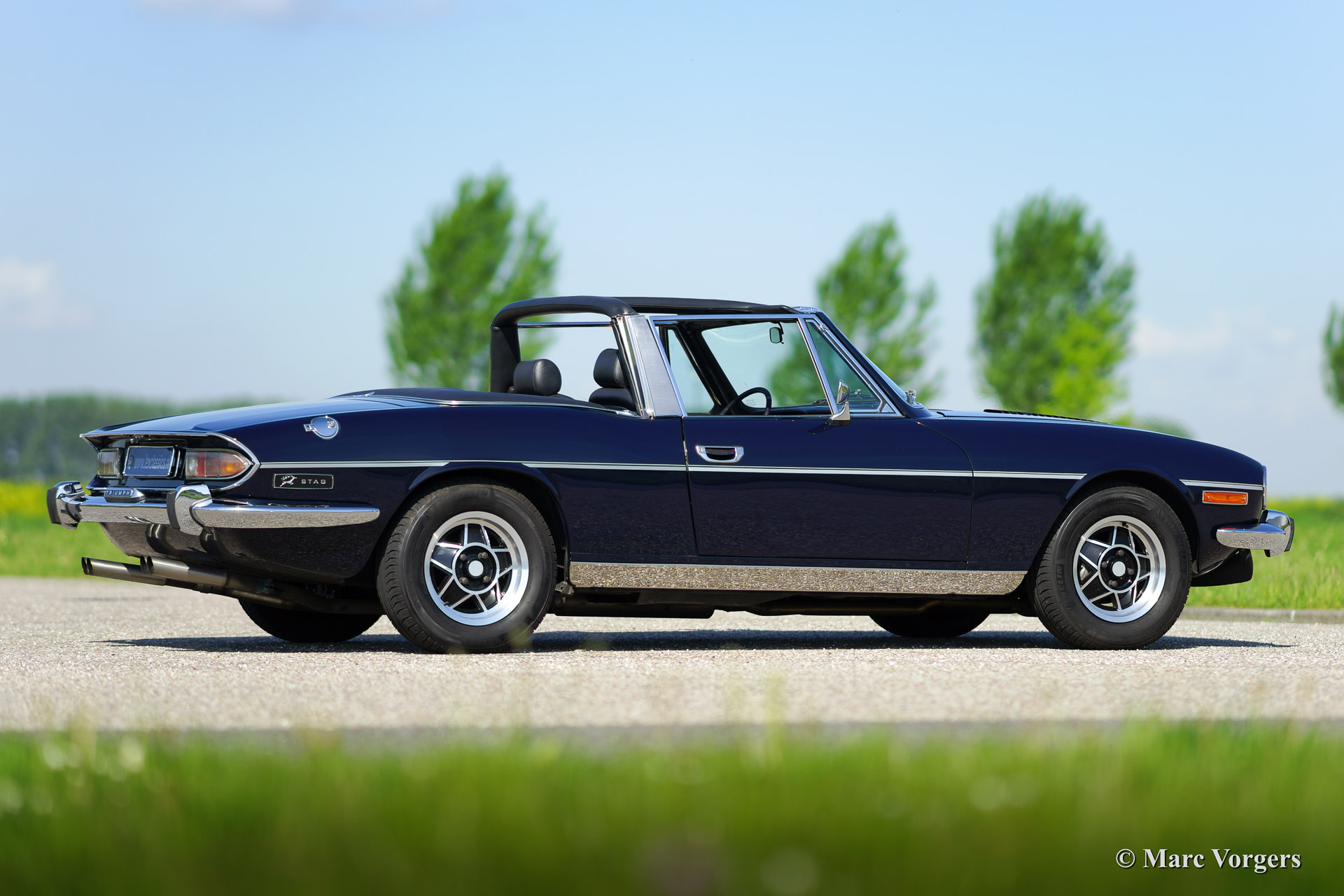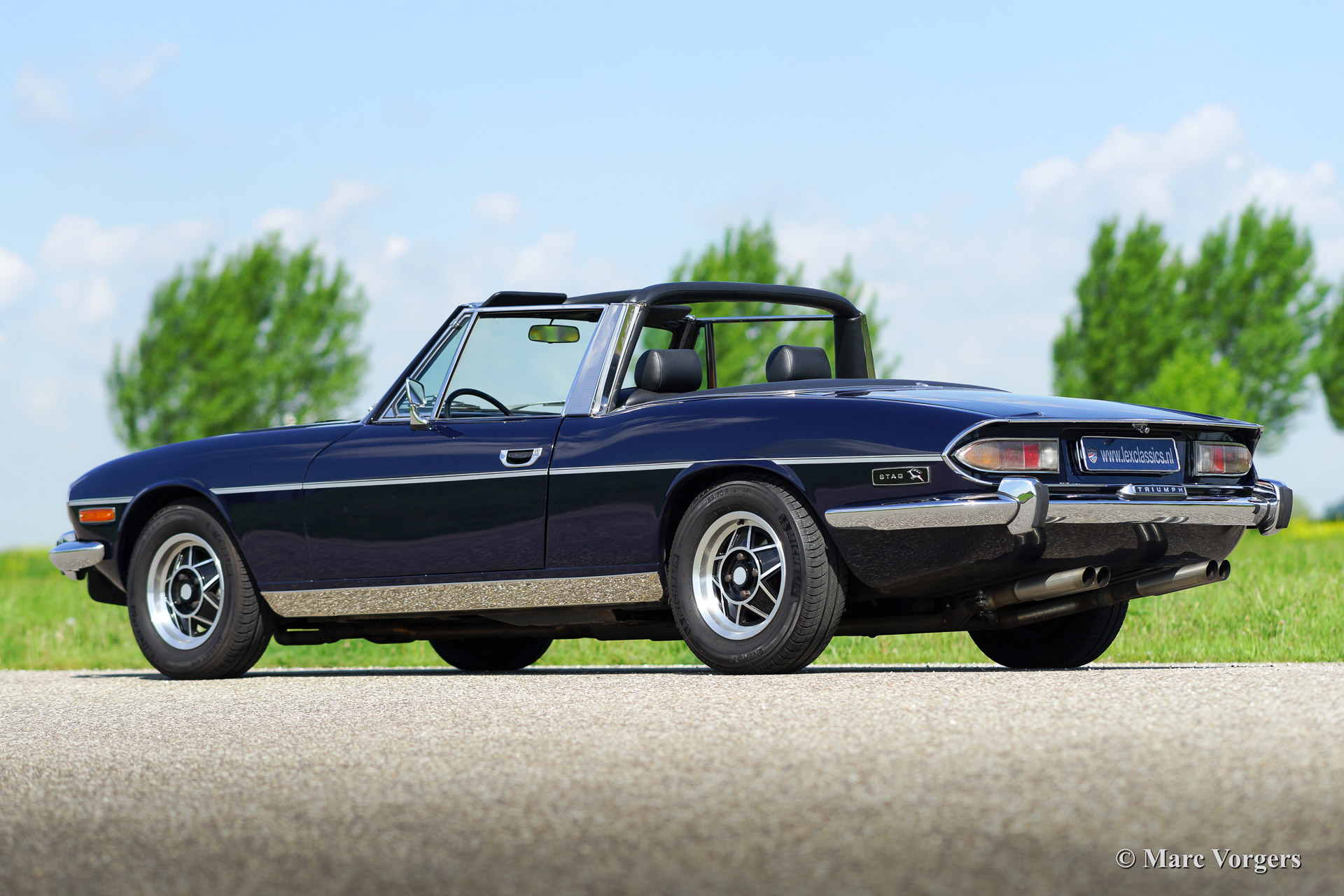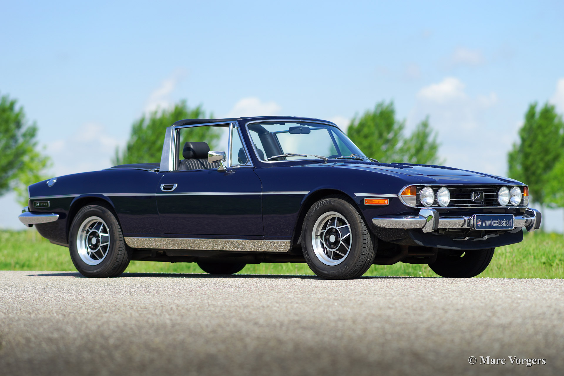 Triumph Stag, year 1971. Chassis number LD916XXX. Colour dark blue exterior, black leather interior with black carpet. Black soft top. This tremendous Trumph Stag has been serviced and maintained beautifully and the car is in very good to excellent condition. The car drives superbly and the exhaust note is truly addictive!
