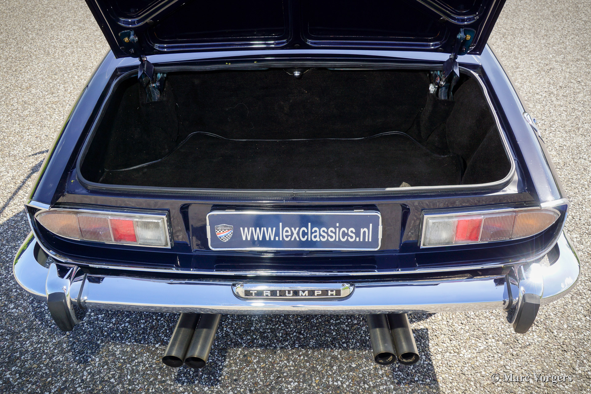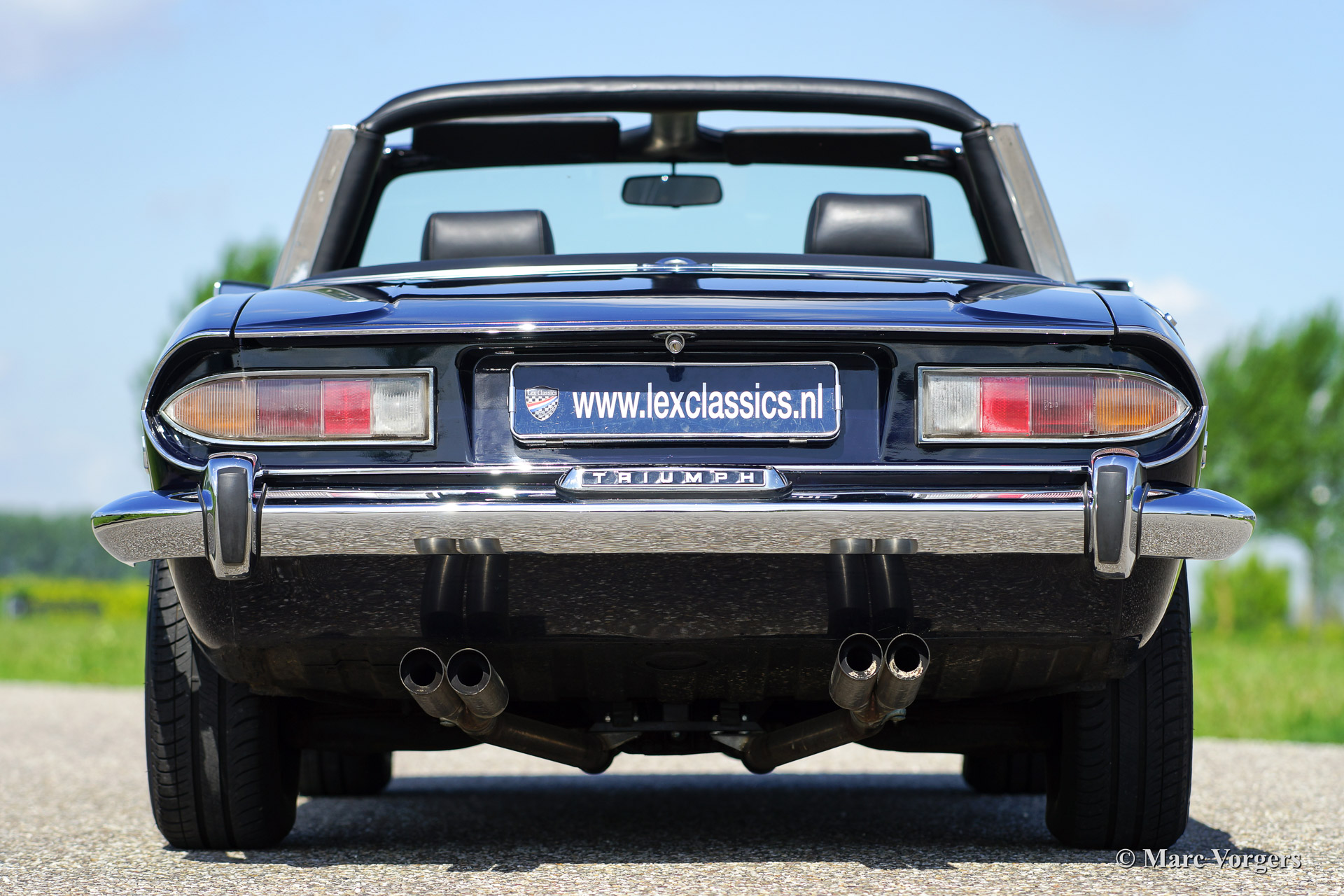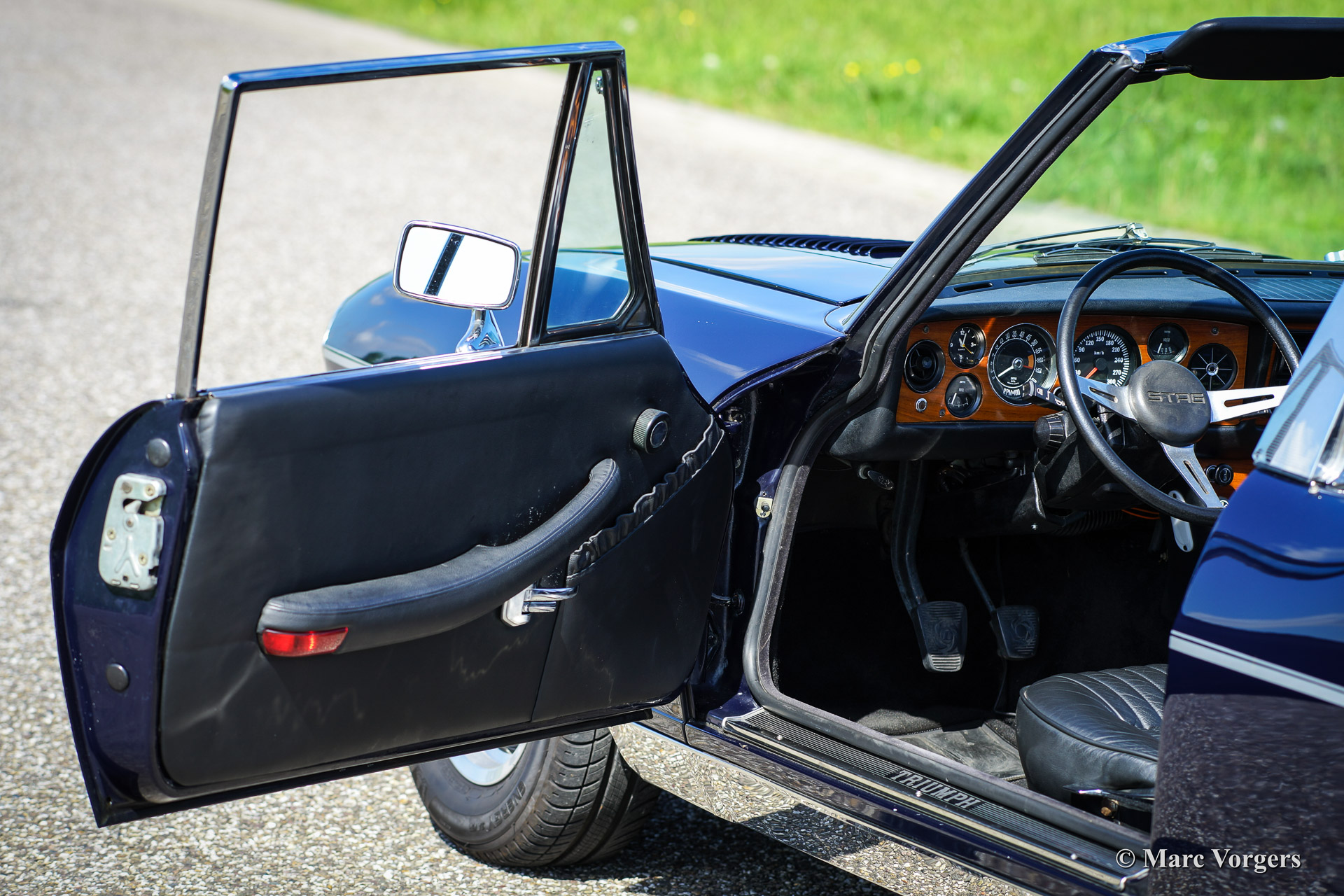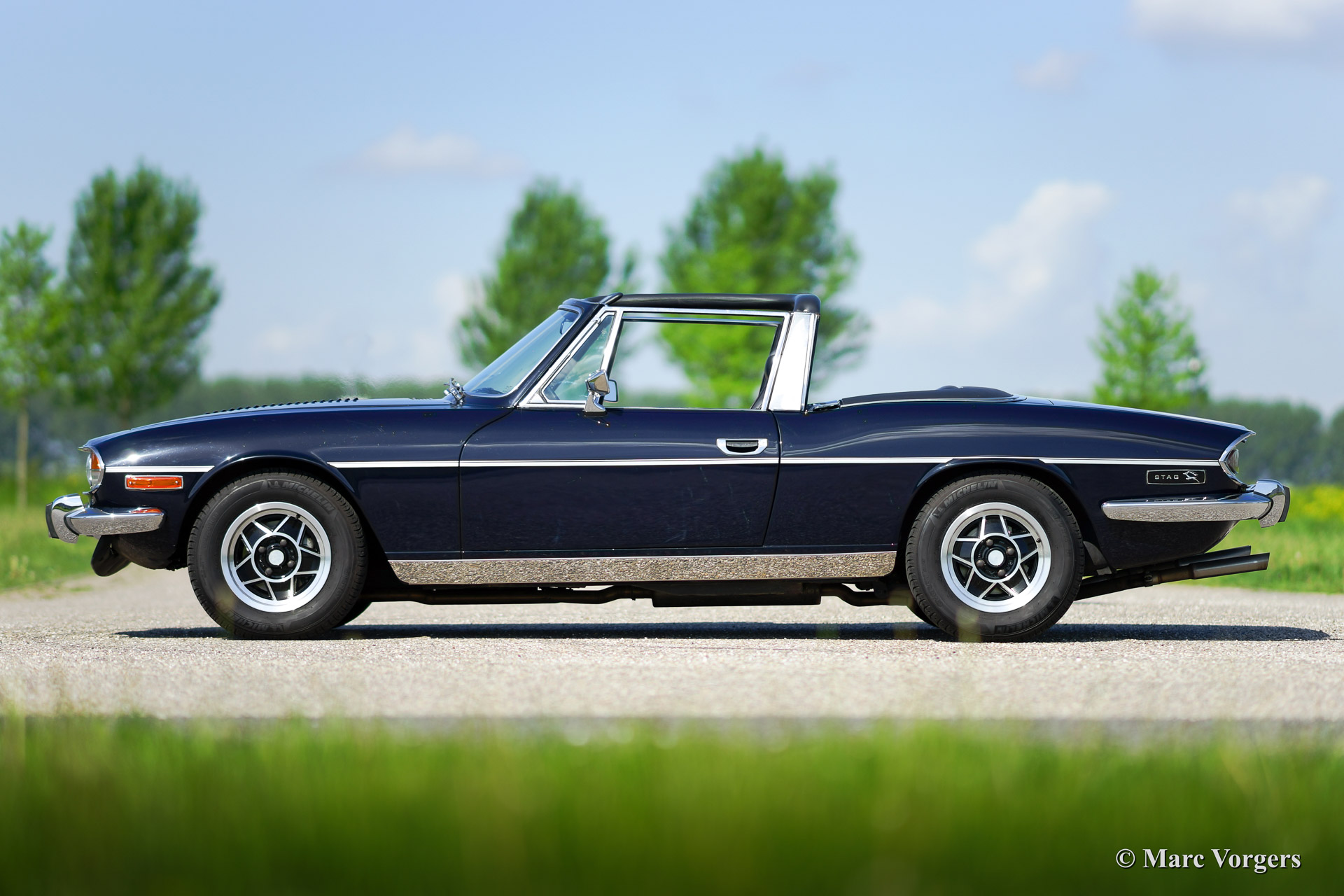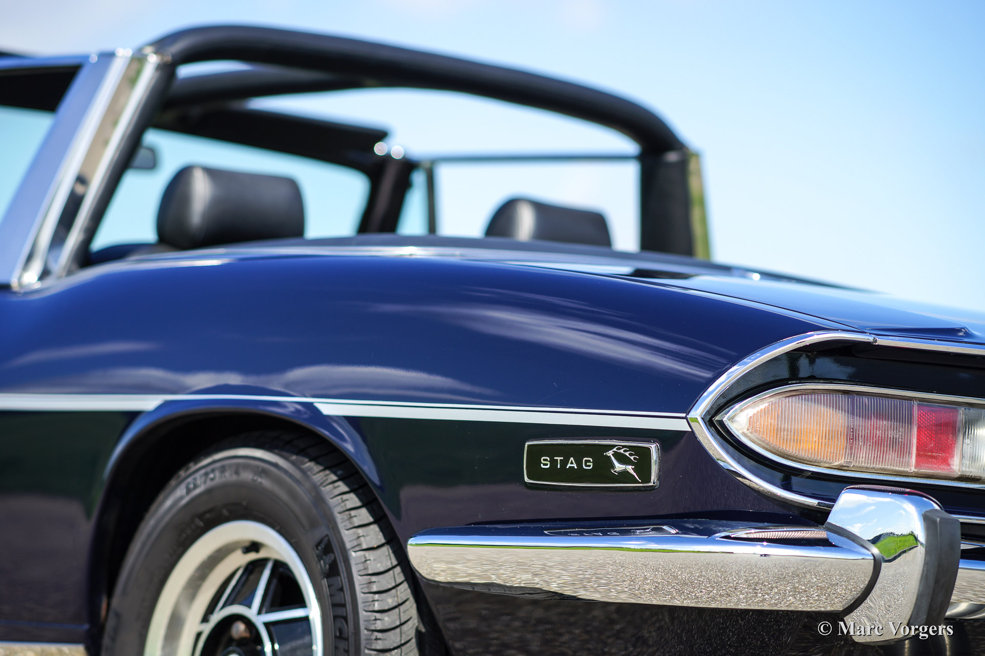Triumph Stag, year 1971. Chassis number LD916XXX. Colour dark blue exterior, black leather interior with black carpet. Black soft top. This tremendous Trumph Stag has been serviced and maintained beautifully and the car is in very good to excellent condition. The car drives superbly and the exhaust note is truly addictive!