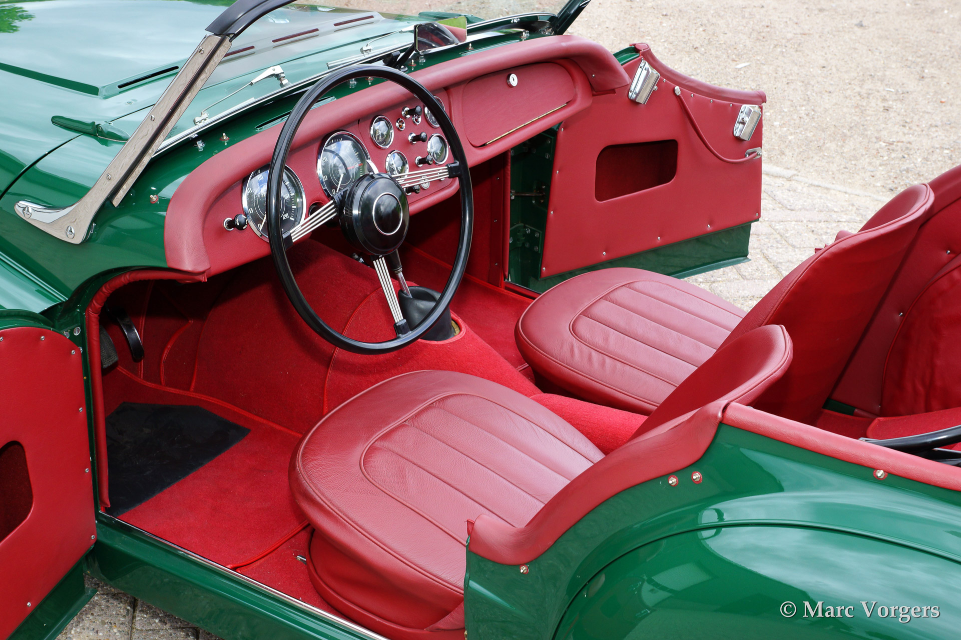 Triumph TR 2 'long door', year 1954. Colour green with a red leather interior. Black hood and side screens. This fantastic Triumph TR 2 was extensively and beautifully restored to original specifications, concours! This is an early and rare TR 2 'long door' model.