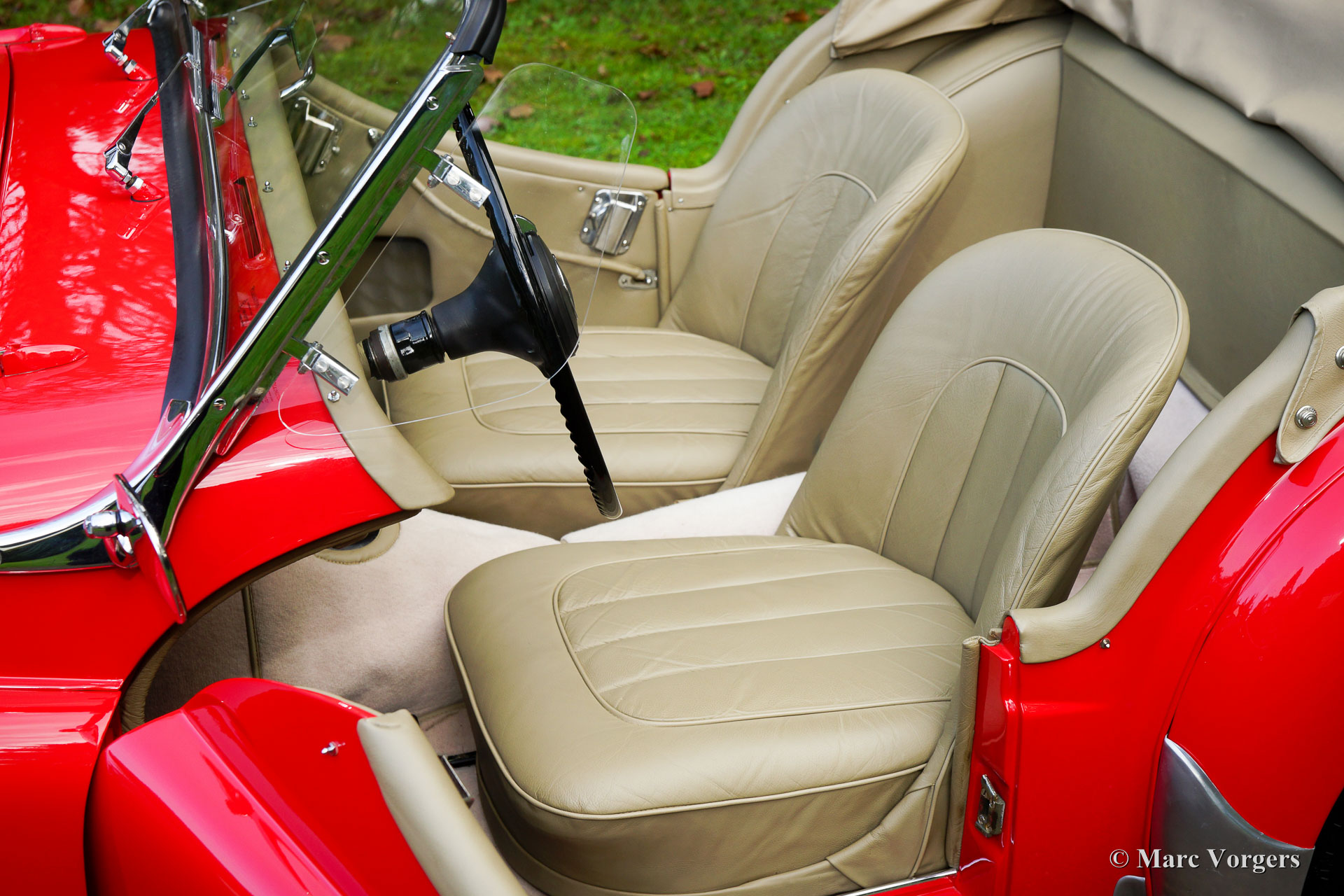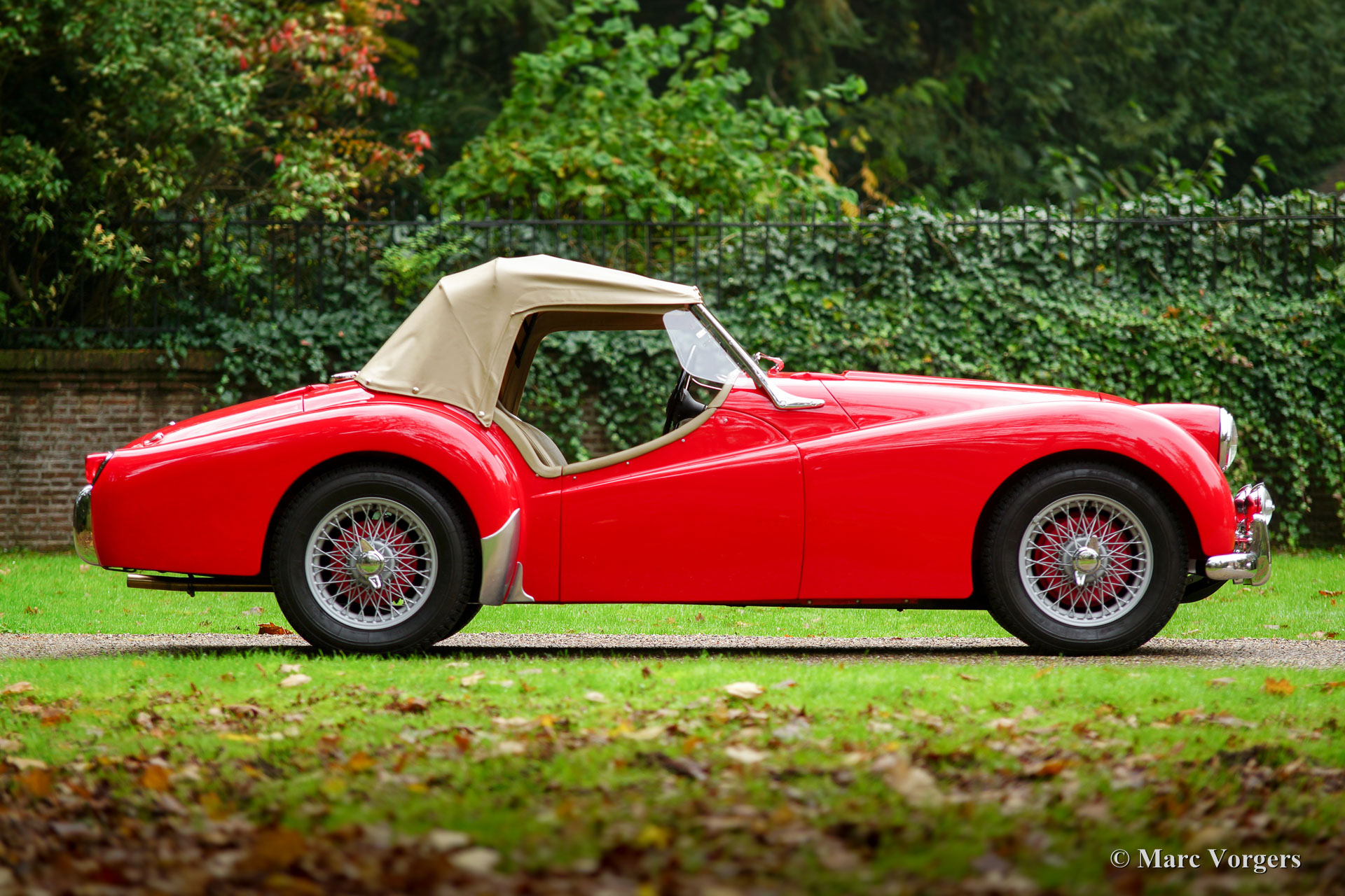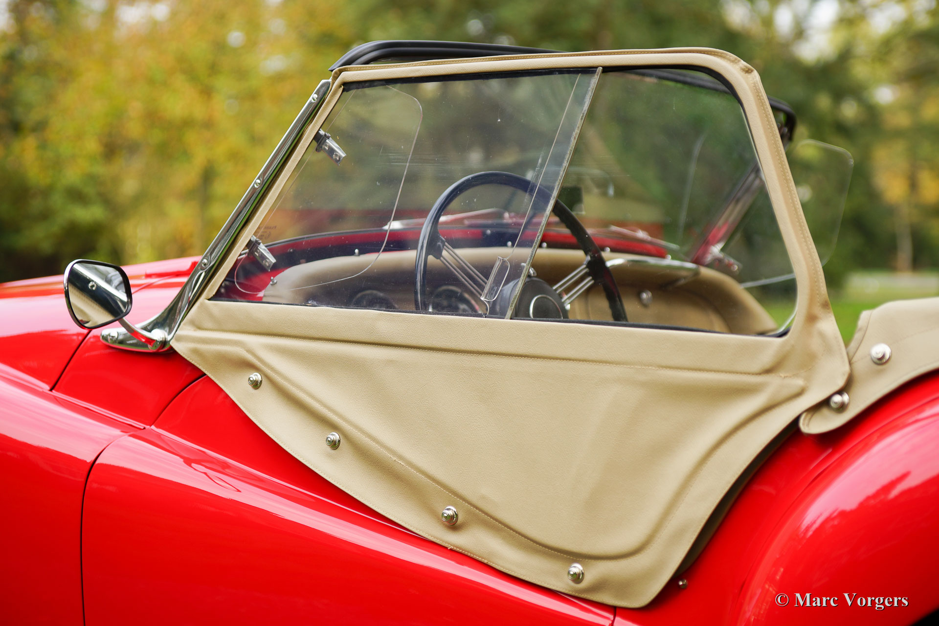 Triumph TR 2 ‘long door’, year 1954. Colour red with a beige leather interior and beige carpet and black rubber protective mats. Beige mohair soft-top, side-curtains and hood-cover. Chassis number TS355XX, the engine and gearbox are factory original to this car; ‘Matching numbers’. This gorgeous TR 2 is an early so called ‘long door’ model which features doors extending over the sills. The car was delivered new with wire wheels and heater fitted by the factory. This TR 2 was imported to the Netherlands in the year 1994. The car was extensively and perfectly ‘body-off’ restored. A file with many photos and invoices of the restoration is present as is a Heritage certificate. This fine Triumph TR 2 is in superb TOP-condition; Concours! Since the completion of the restoration the car has driven 7500 kilometres including 1400 kilometres on a holiday trip to and through the Italian Dolomites! The body was restored perfectly from the base up and primed with epoxy. The chassis and the suspension components were stove enamelled black. The engine was overhauled and dynamically balanced at a renowned Dutch specialist. The the gearbox and overdrive were also rebuilt. The overdrive was not factory fitted but was added during the restoration. This fantastic TR 2 ‘long door’ is a superbly driving specimen in perfect TOP condition! The car is currently registered in Belgium.