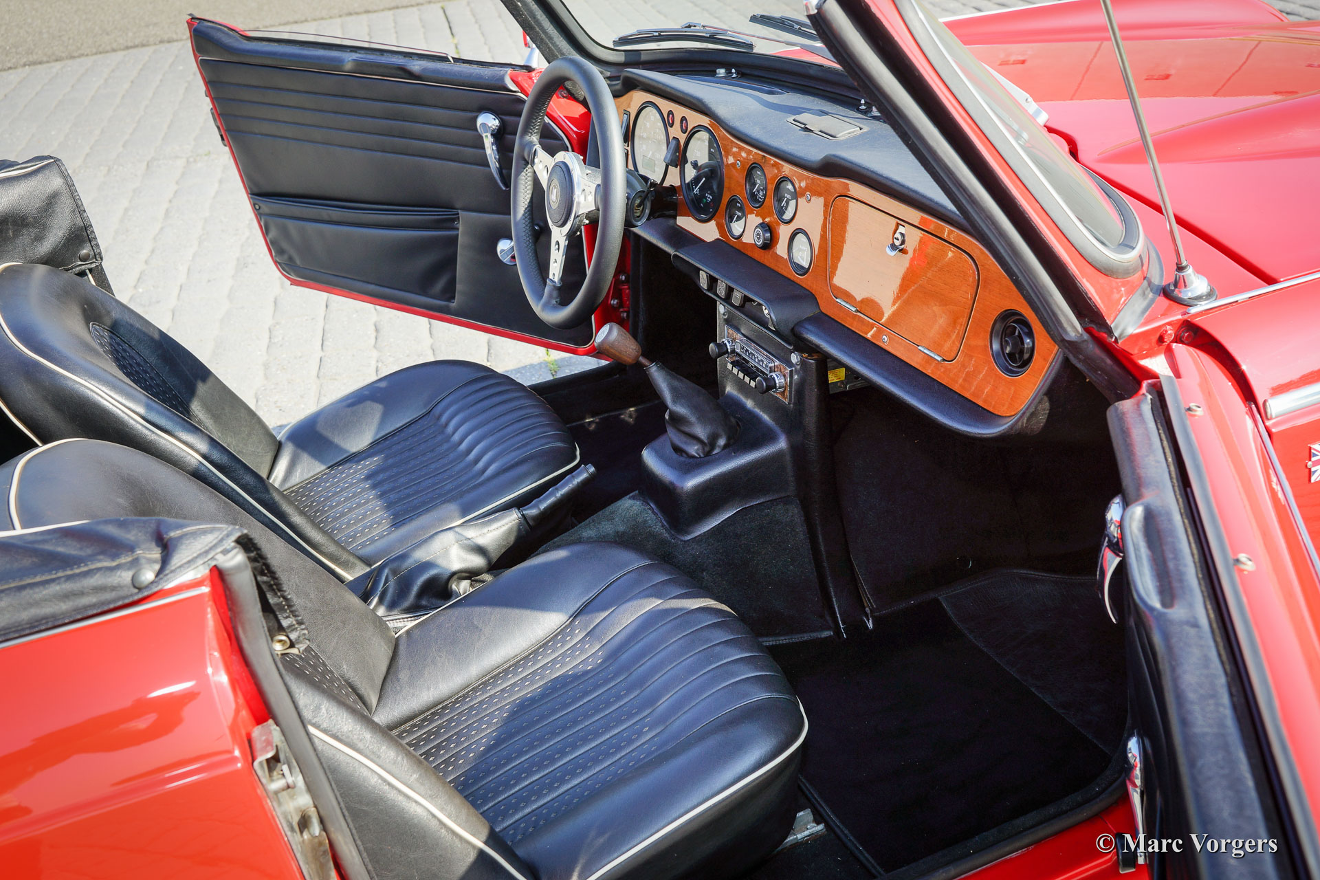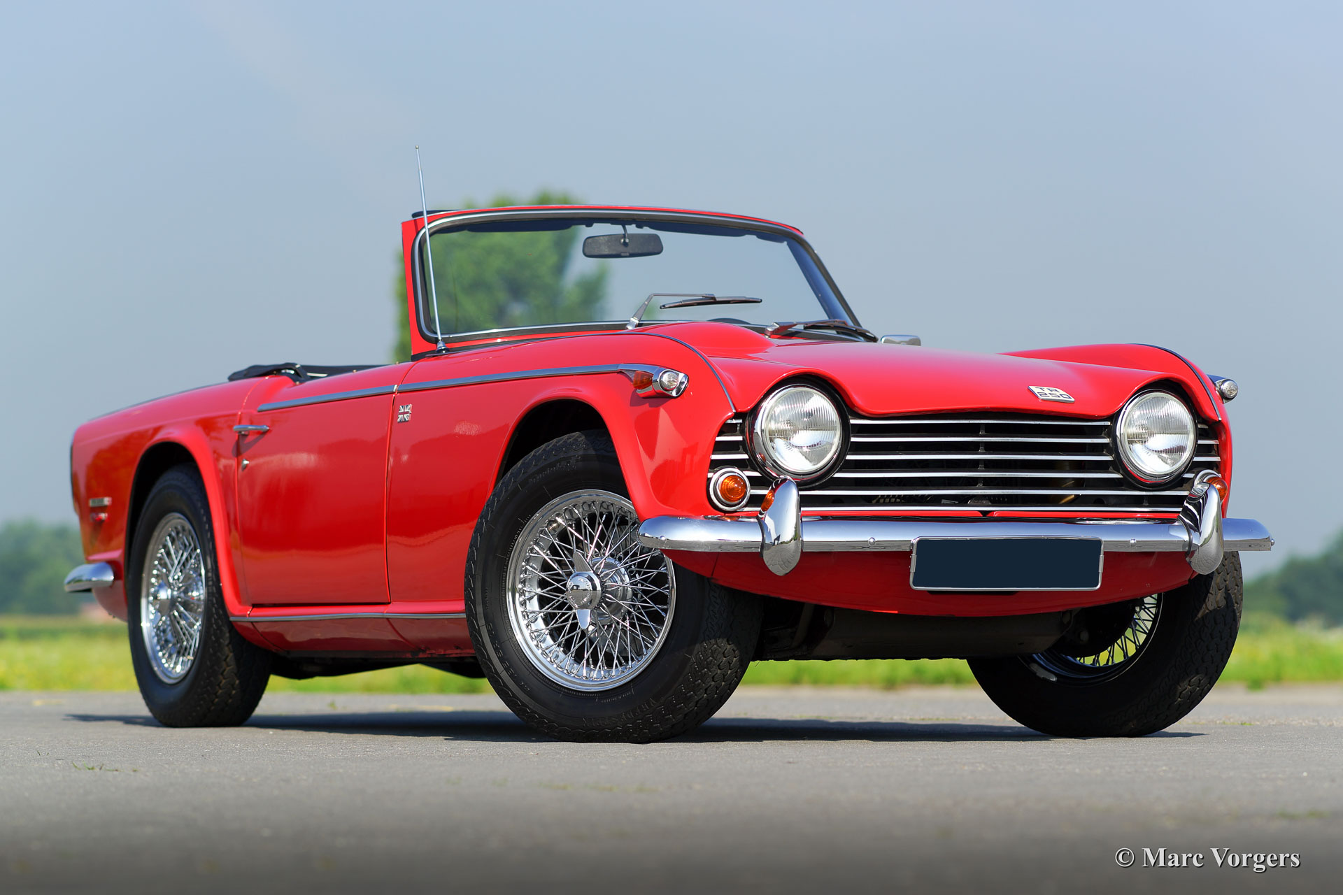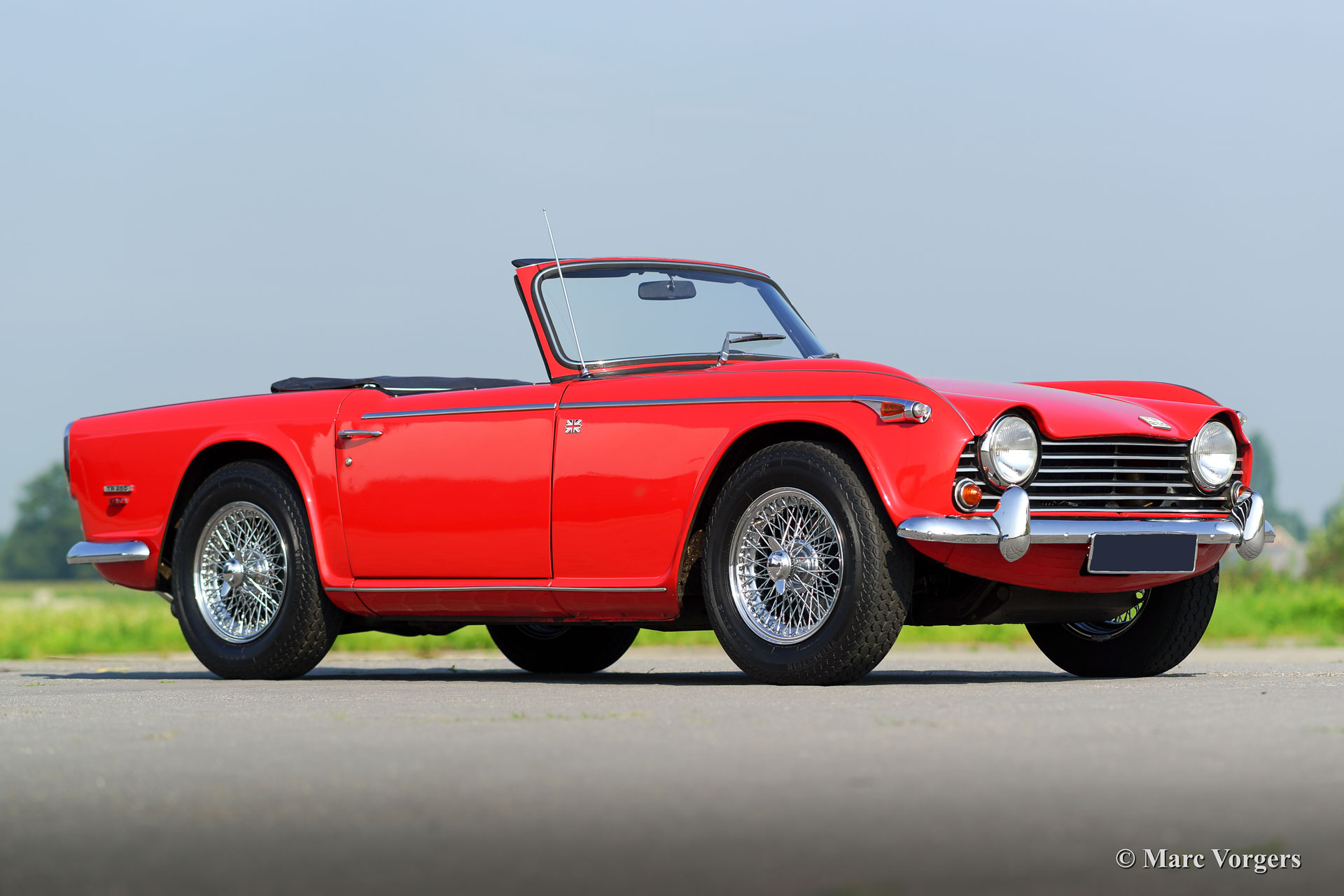 Triumph TR 250, year 1968. Colour red with a black leather interior trimmed with white piping. Black mohair soft-top and black vinyl hood cover. This fantastic Triumph TR 250 is in superb condition and the car drives perfectly! This TR 250 shows off many beautiful original details. The car was serviced and maintained perfectly. The soft top is new and less than a year ago new chrome wire wheels were fitted and new tires. The engine was modified to run on lead-free petrol. This TR 250 features two SU carburettors, a Stainless Steel sports exhaust and a leather rimmed Motolita sports steering wheel. Remarkable is the presence of the original booklet with dealer-delivery stamp in it. The Triumph TR 250 is one of the rarest TR models, the model was built in 1967 and 1968 only.