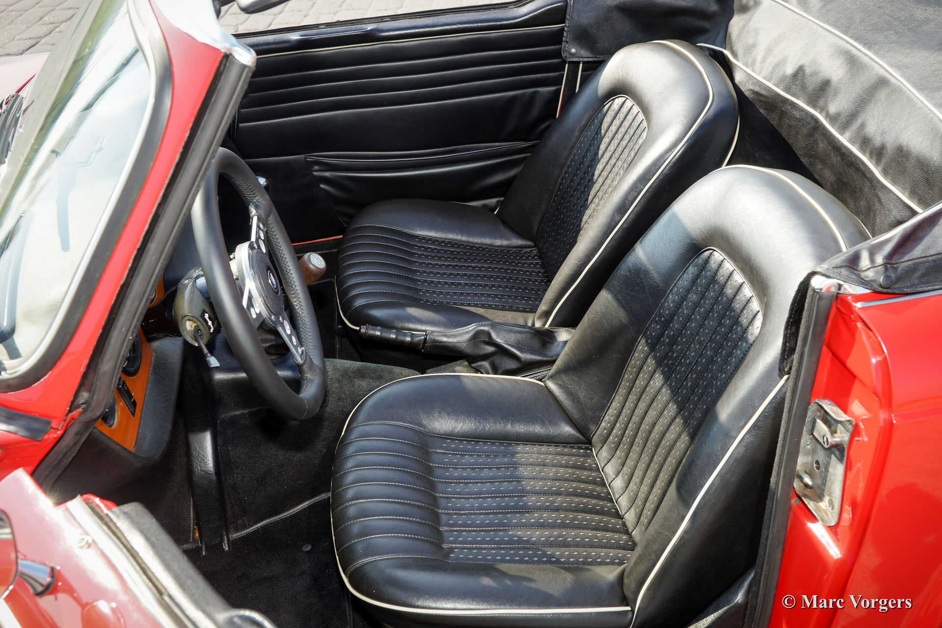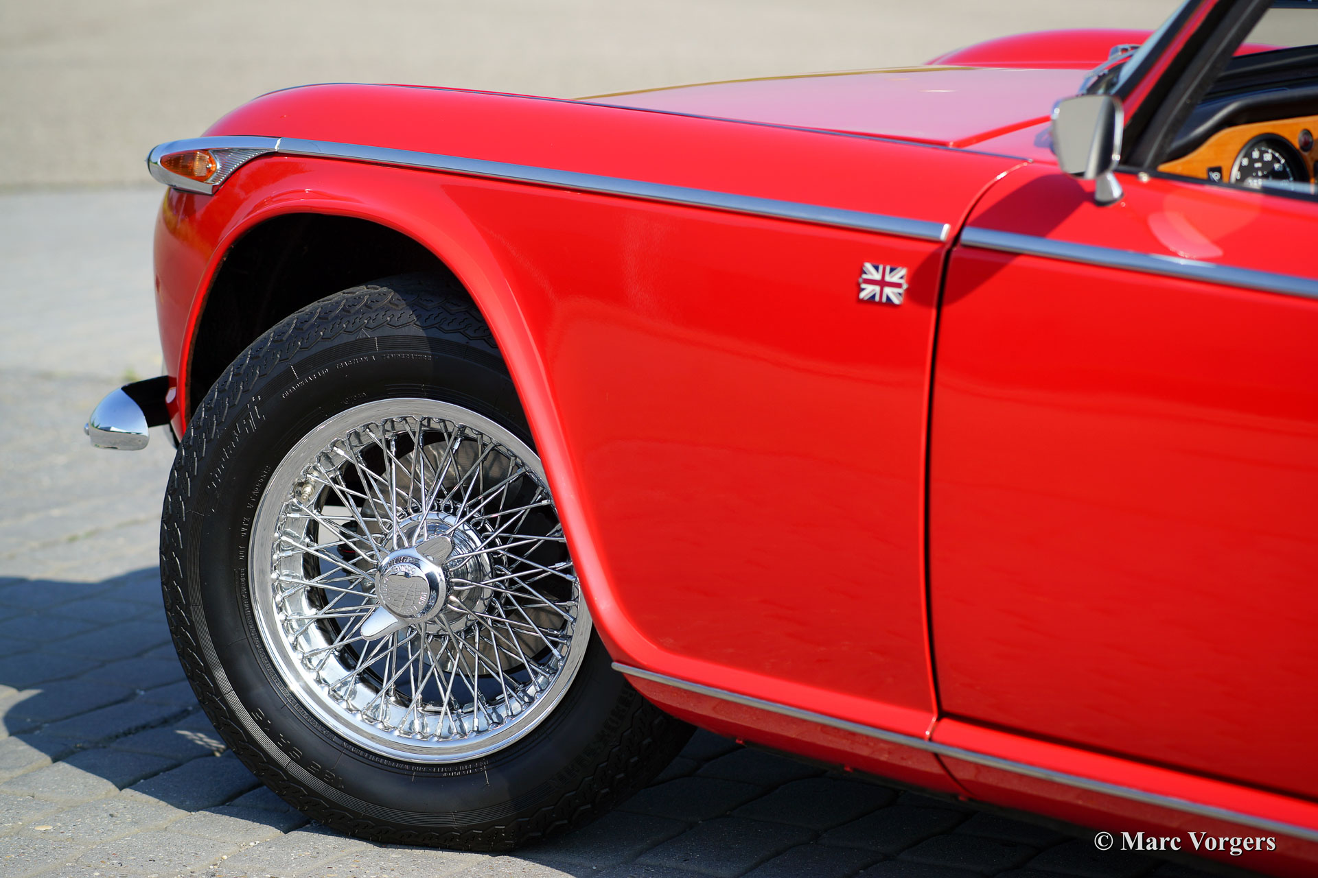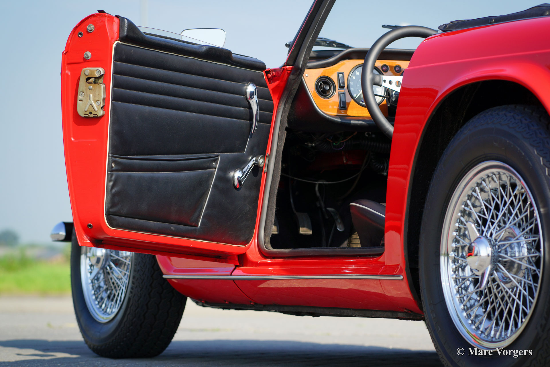 Triumph TR 250, year 1968. Colour red with a black leather interior trimmed with white piping. Black mohair soft-top and black vinyl hood cover. This fantastic Triumph TR 250 is in superb condition and the car drives perfectly! This TR 250 shows off many beautiful original details. The car was serviced and maintained perfectly. The soft top is new and less than a year ago new chrome wire wheels were fitted and new tires. The engine was modified to run on lead-free petrol. This TR 250 features two SU carburettors, a Stainless Steel sports exhaust and a leather rimmed Motolita sports steering wheel. Remarkable is the presence of the original booklet with dealer-delivery stamp in it. The Triumph TR 250 is one of the rarest TR models, the model was built in 1967 and 1968 only.
