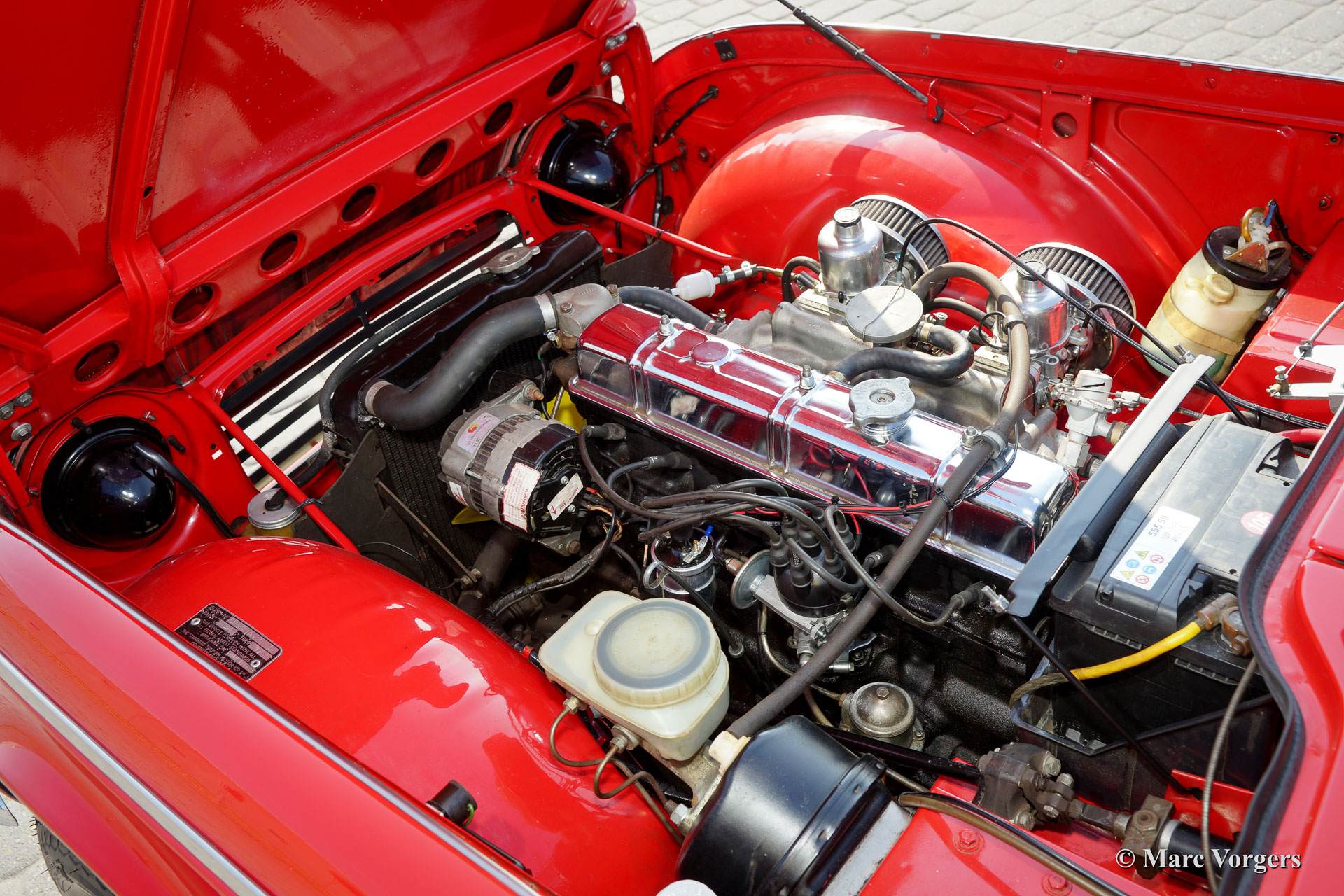 The six cylinder engine originally came from the Triumph 2000 saloon. For use in the TR 5/ TR 250 Triumph enlarged the cylinder capacity up to 2498 cc., fitted a more racy camshaft and petrol injection. Result was that they gained 60 bhp. (TR5) to the standard engine, enough for the engine to be used in a sports car like the TR 5/ TR 250.