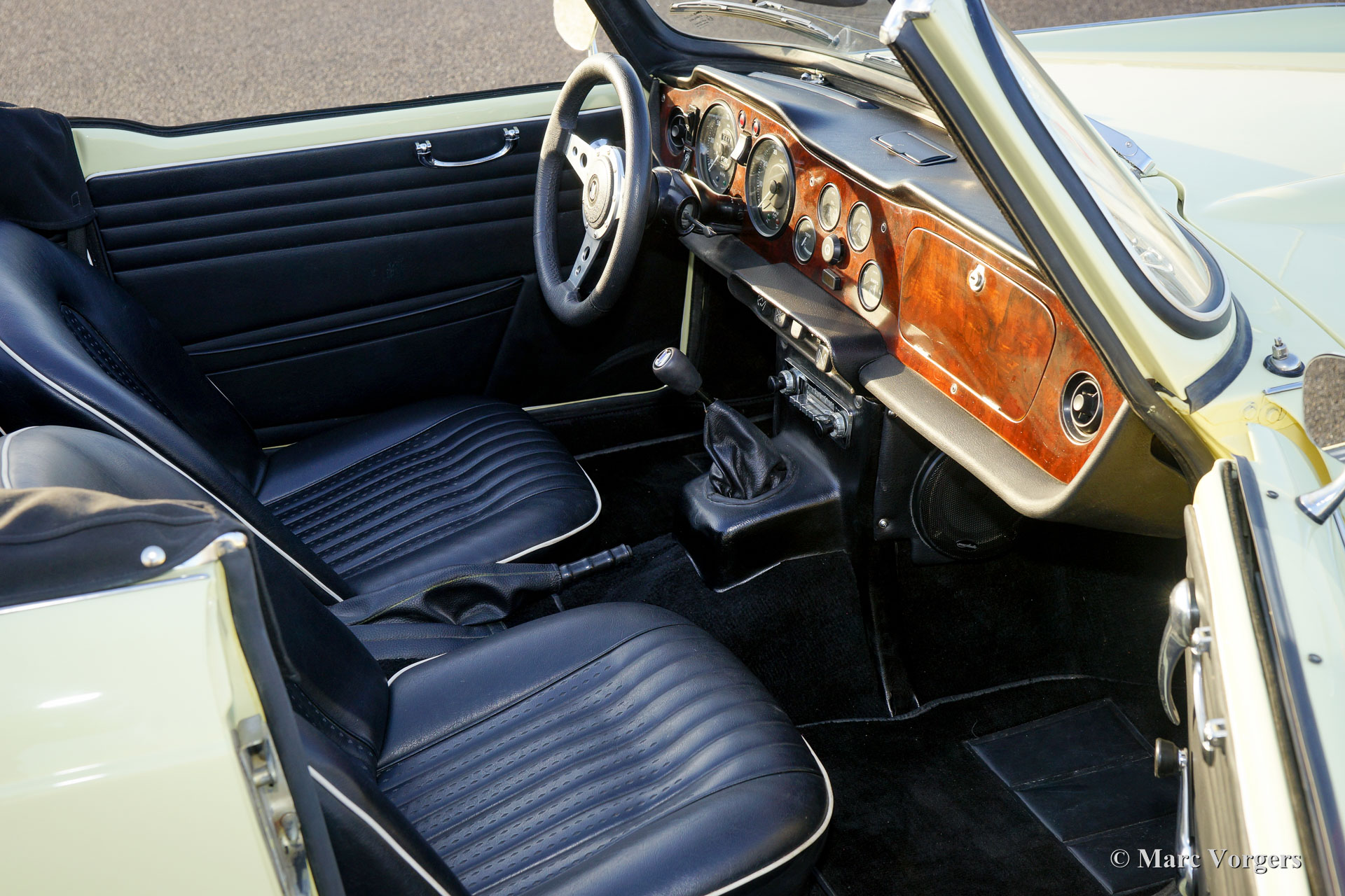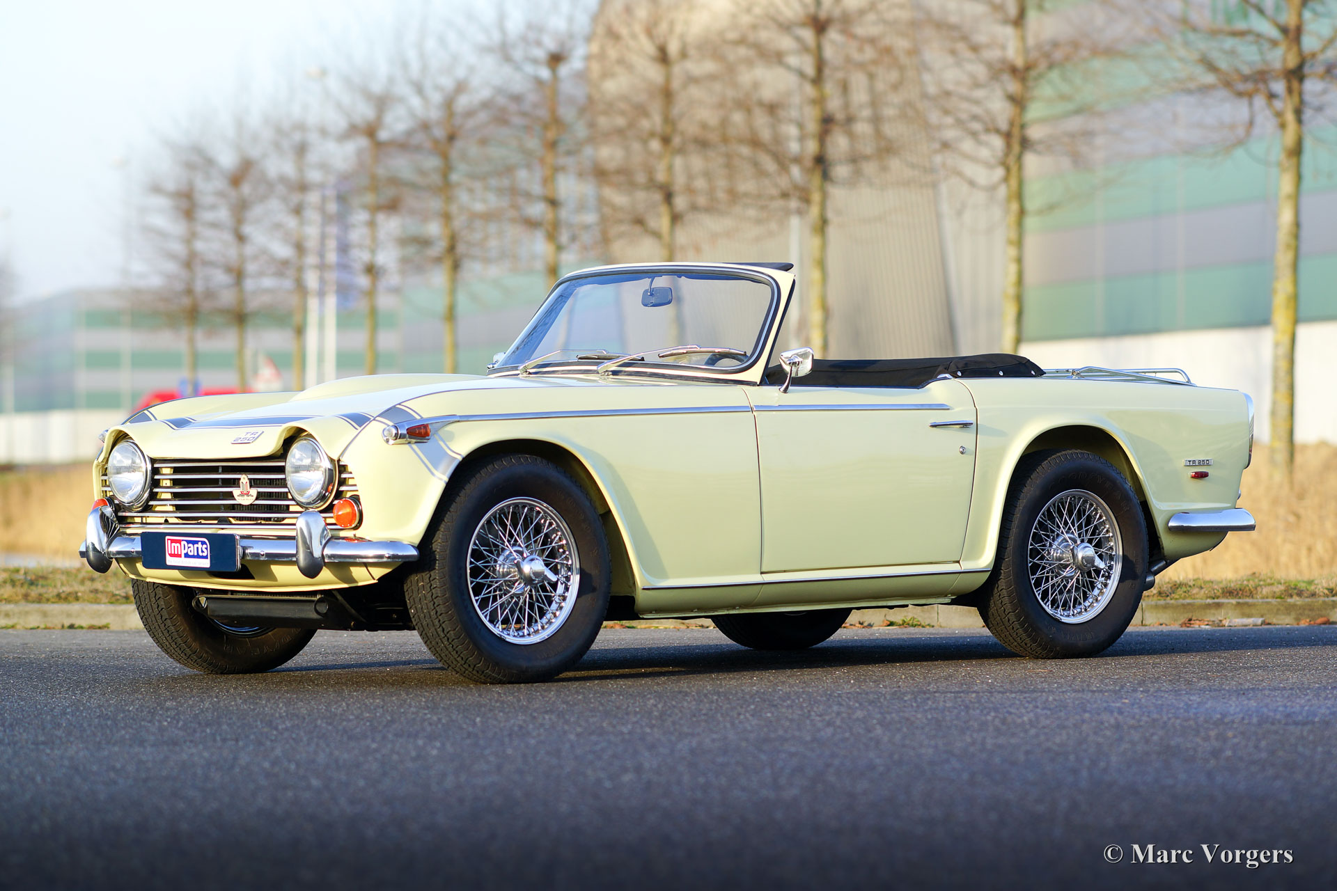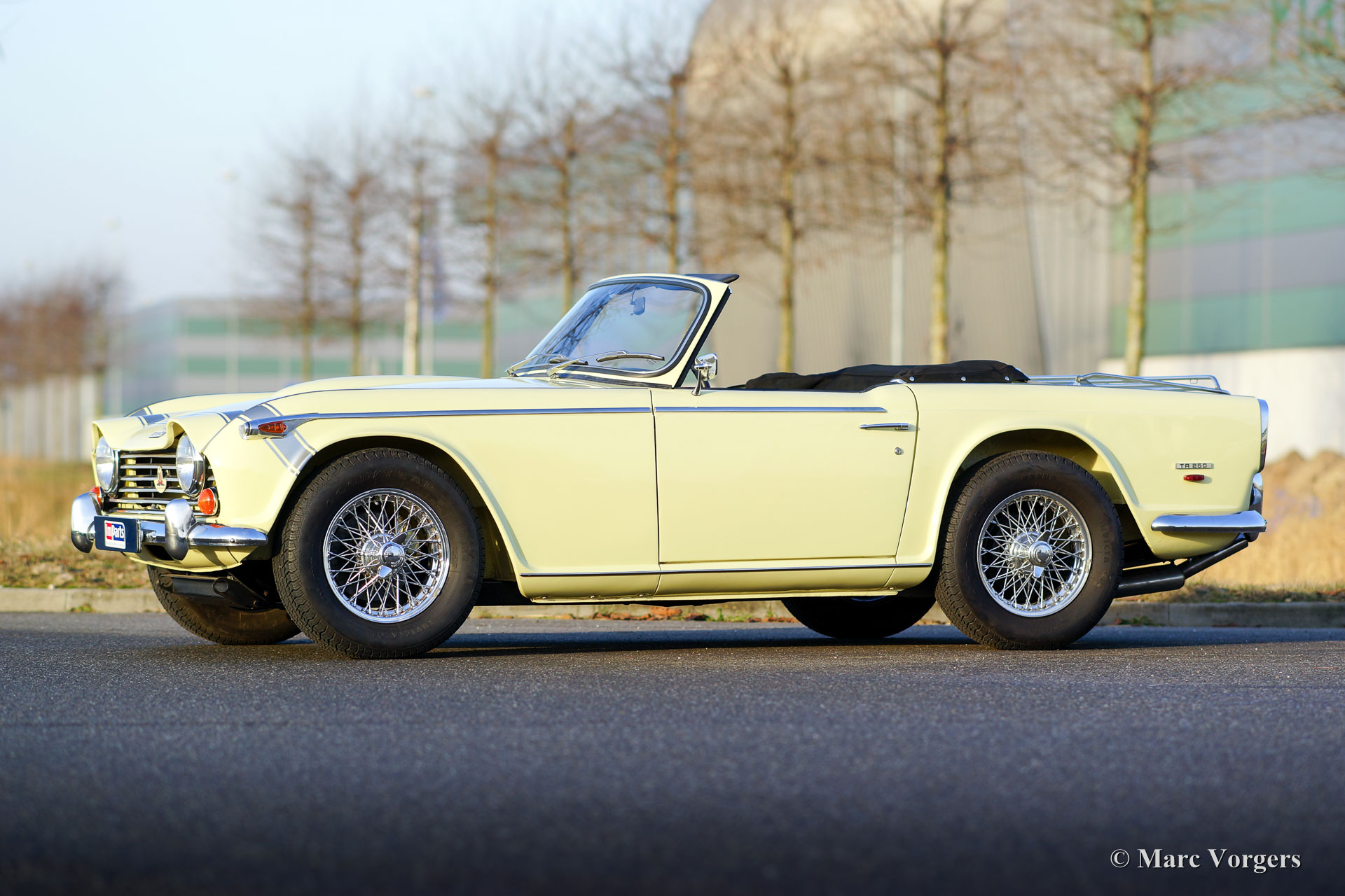 Triumph TR 250, year 1968. Colour Pale Yellow with a black leather interior trimmed with white piping. Black mohair soft-top and hood-cover. This gorgeous Triumph TR 250 was body off restored. The very good mechanicals were largely left original as can is confirmed by the alternator with the external regulator. This beautiful Triumph TR 250 is in excellent condition and the car drives perfectly. The automobile features chrome wire wheels, the original sports stripe across the bonnet, 205 series radial tyres, a Stainless-Steel exhaust system and OVERDRIVE! The TR 250 is a relatively rare Triumph model, only 8484 examples have been built.