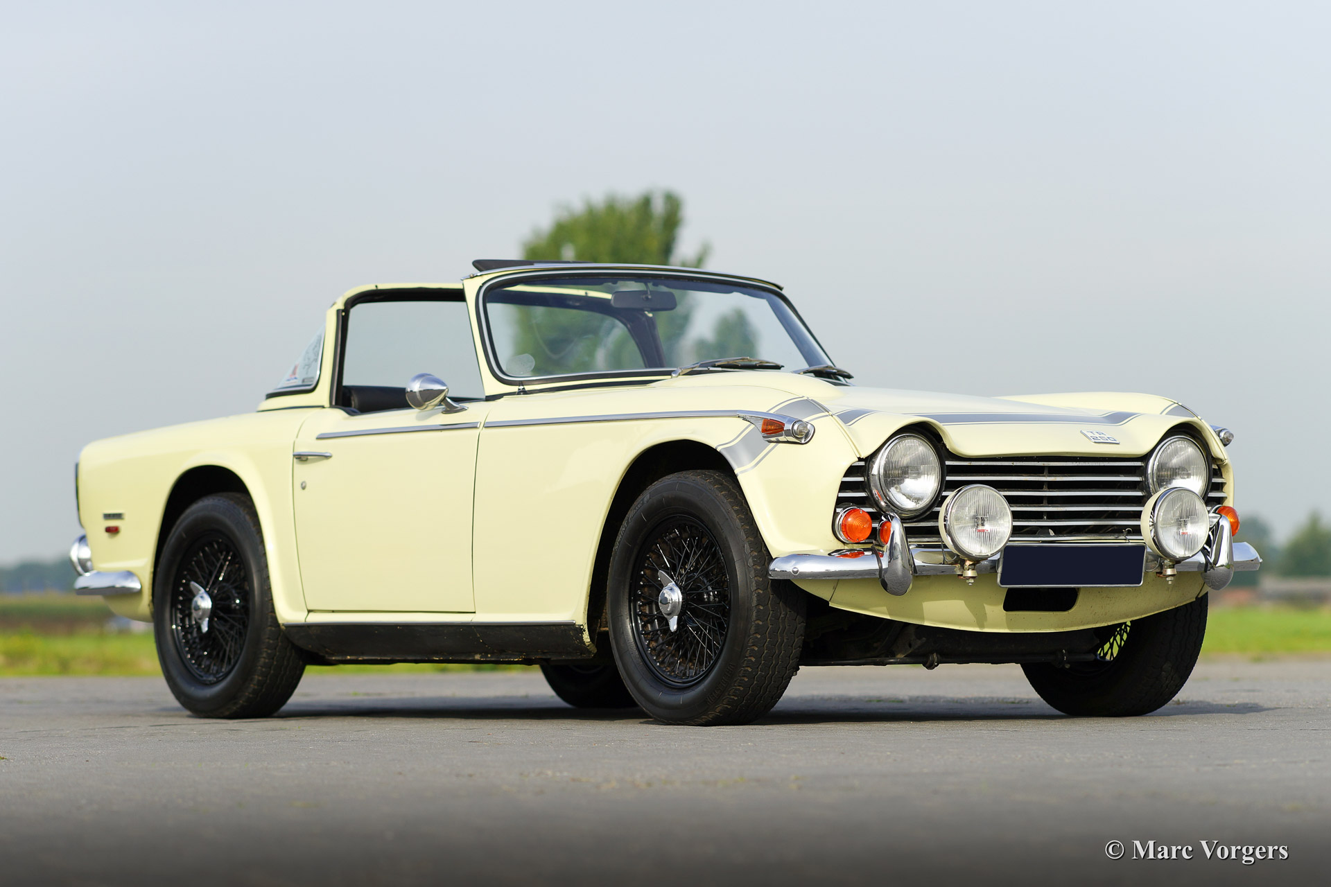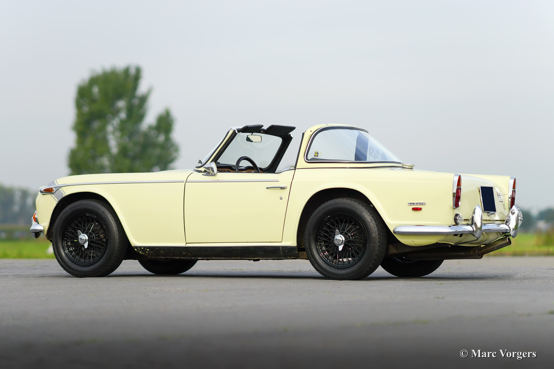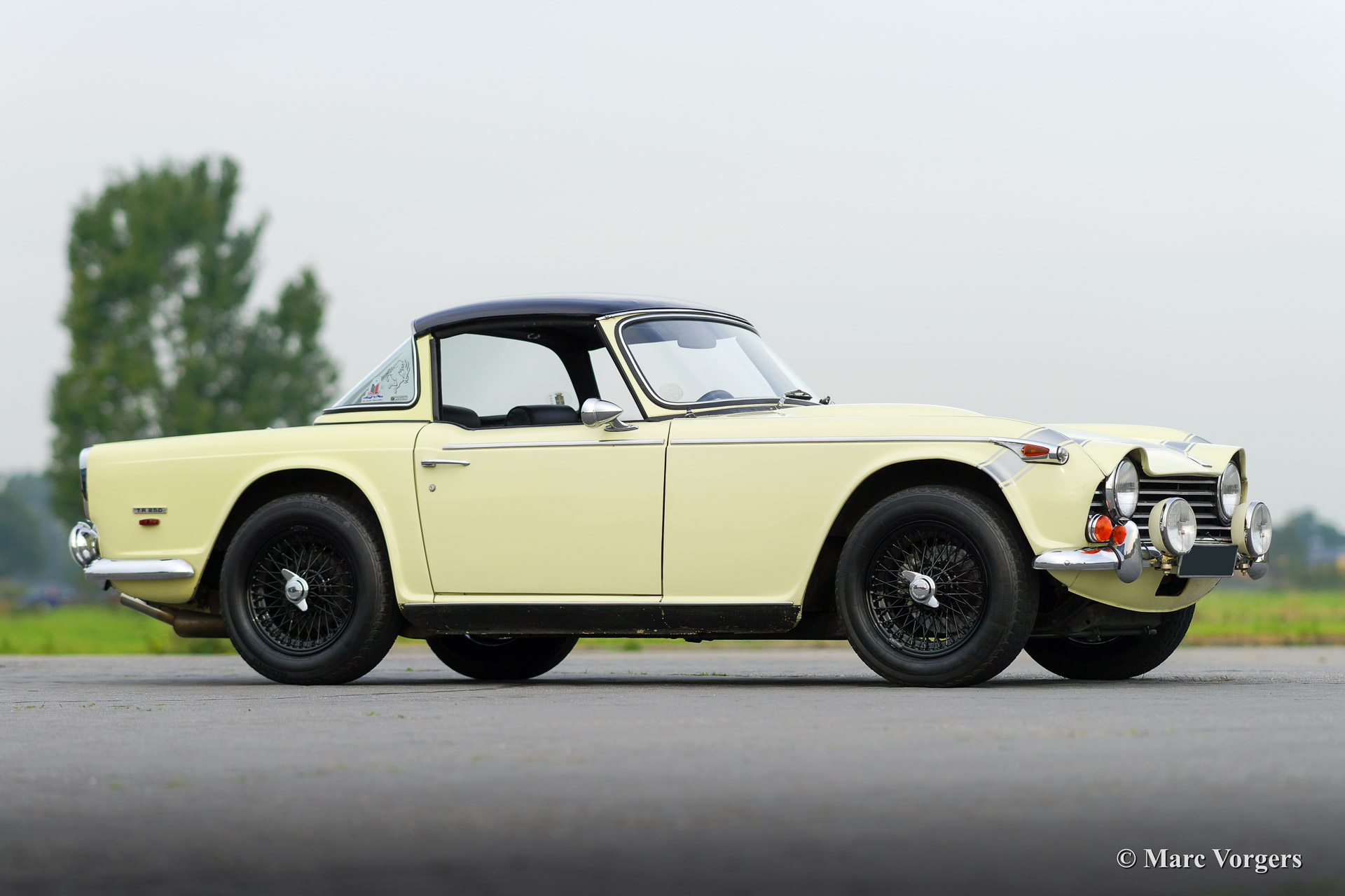 Triumph TR 250, year 1968. Colour primrose yellow with a black leather interior and black carpet. This sporty Triumph TR 250 is in very good condition. The engine was recently overhauled and tuned to about 140 bhp. The car features a sports exhaust and a fantastic 'Surrey top' complete with the two roof parts. One foldable (metal frame with black PVC cover fitting in the boot), and the rigid roof panel. Furthermore the car sports overdrive and black enamelled wire wheels. A true driver car with some signs of use and patina. Very suitable for historic (rally) events or holiday trips!