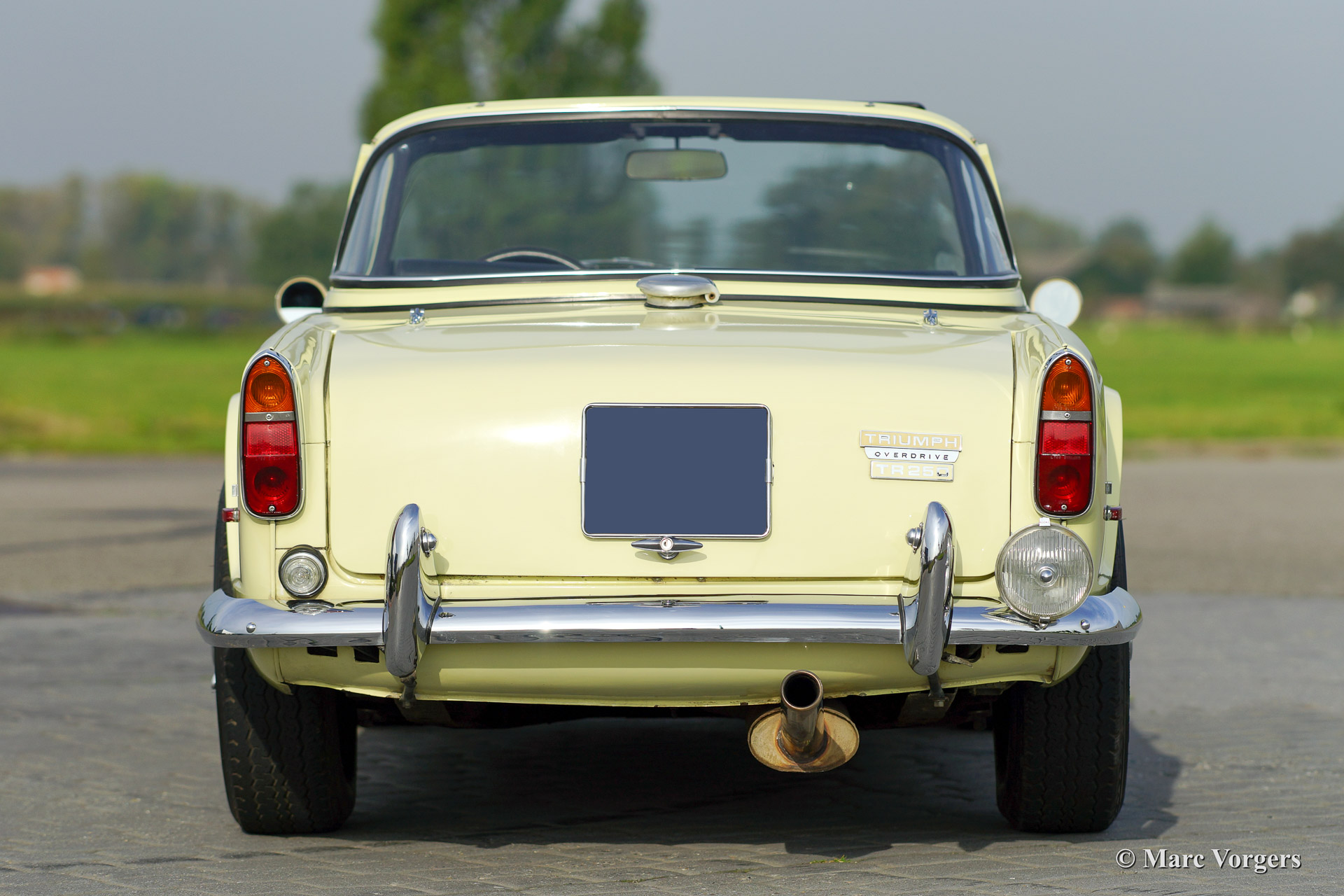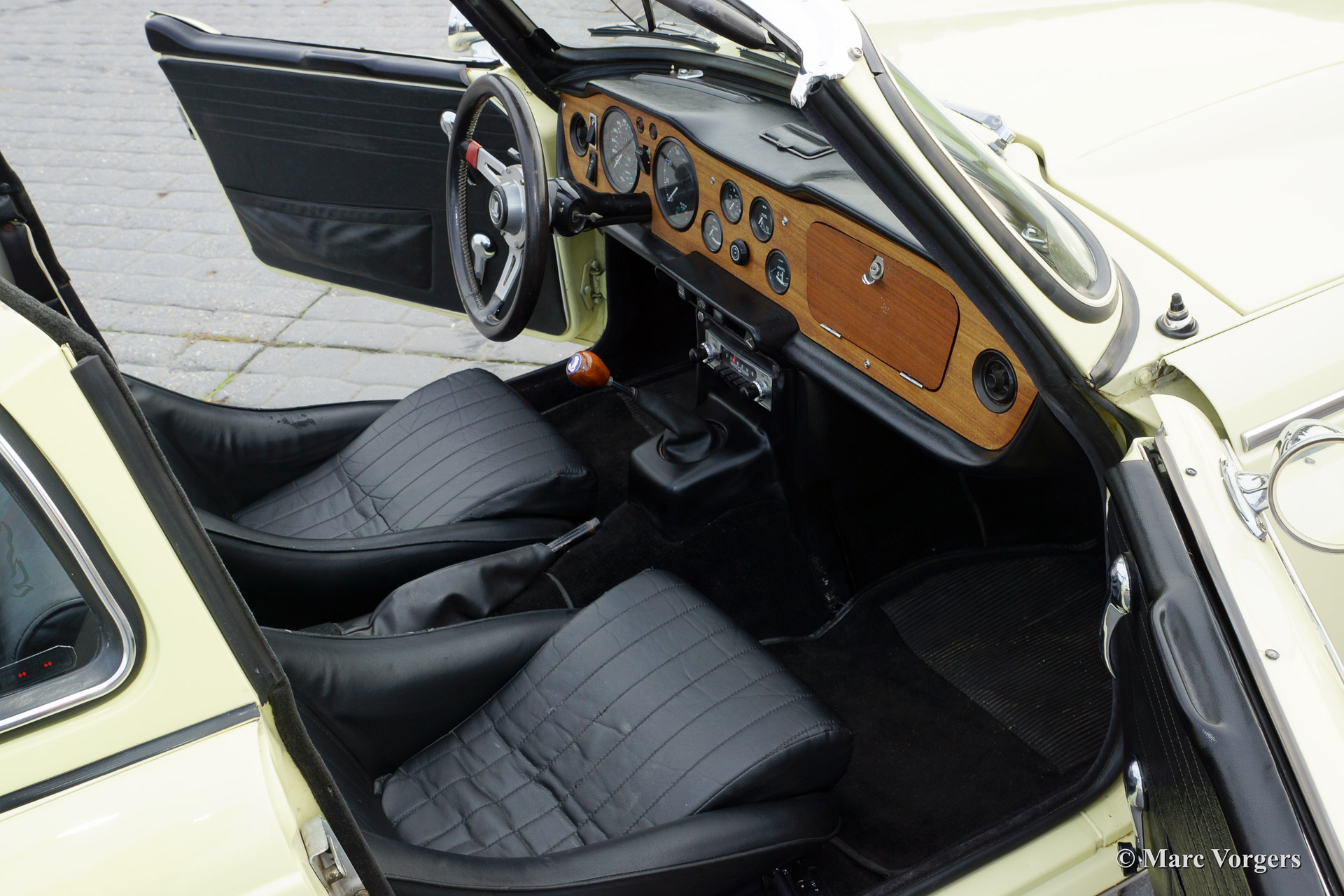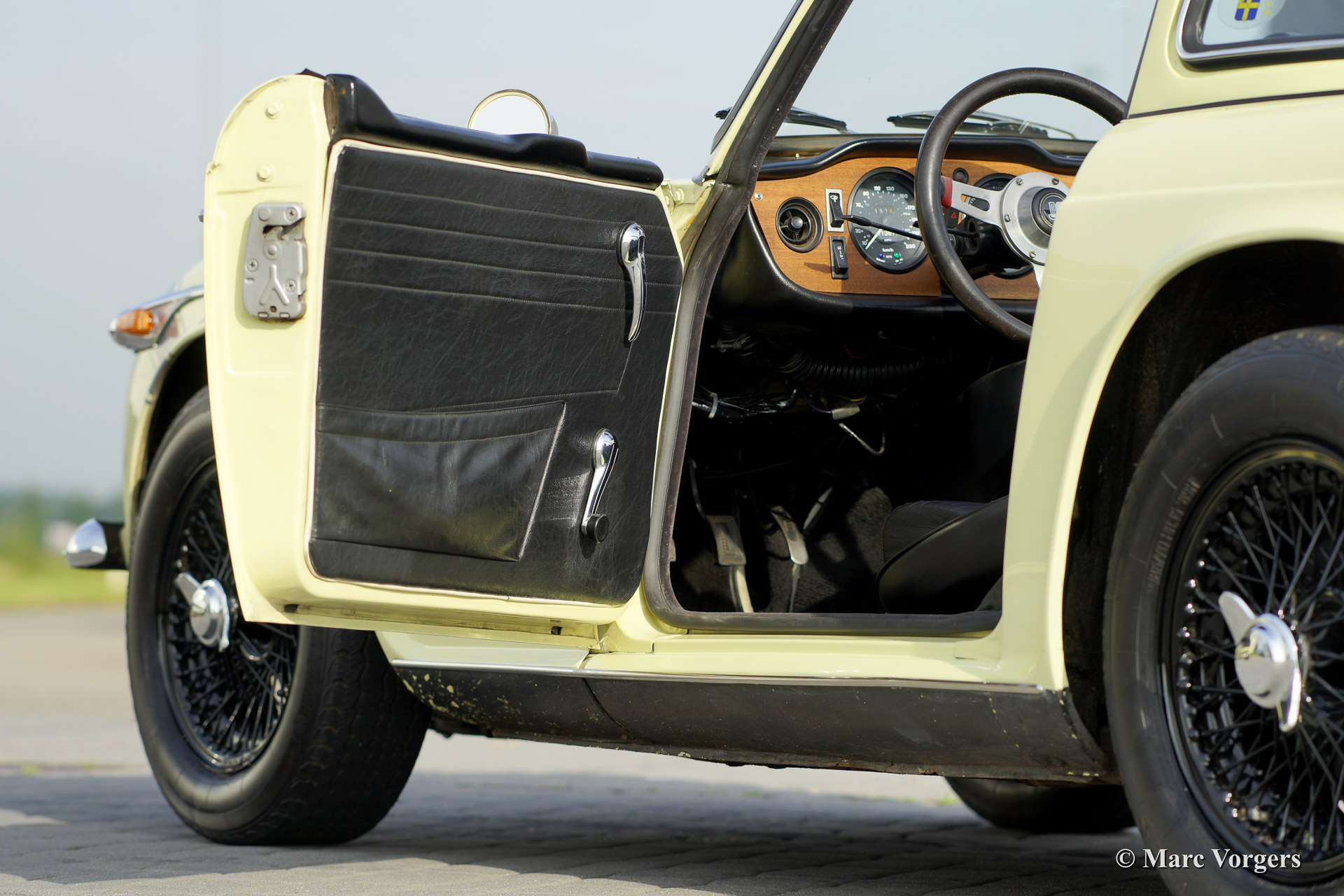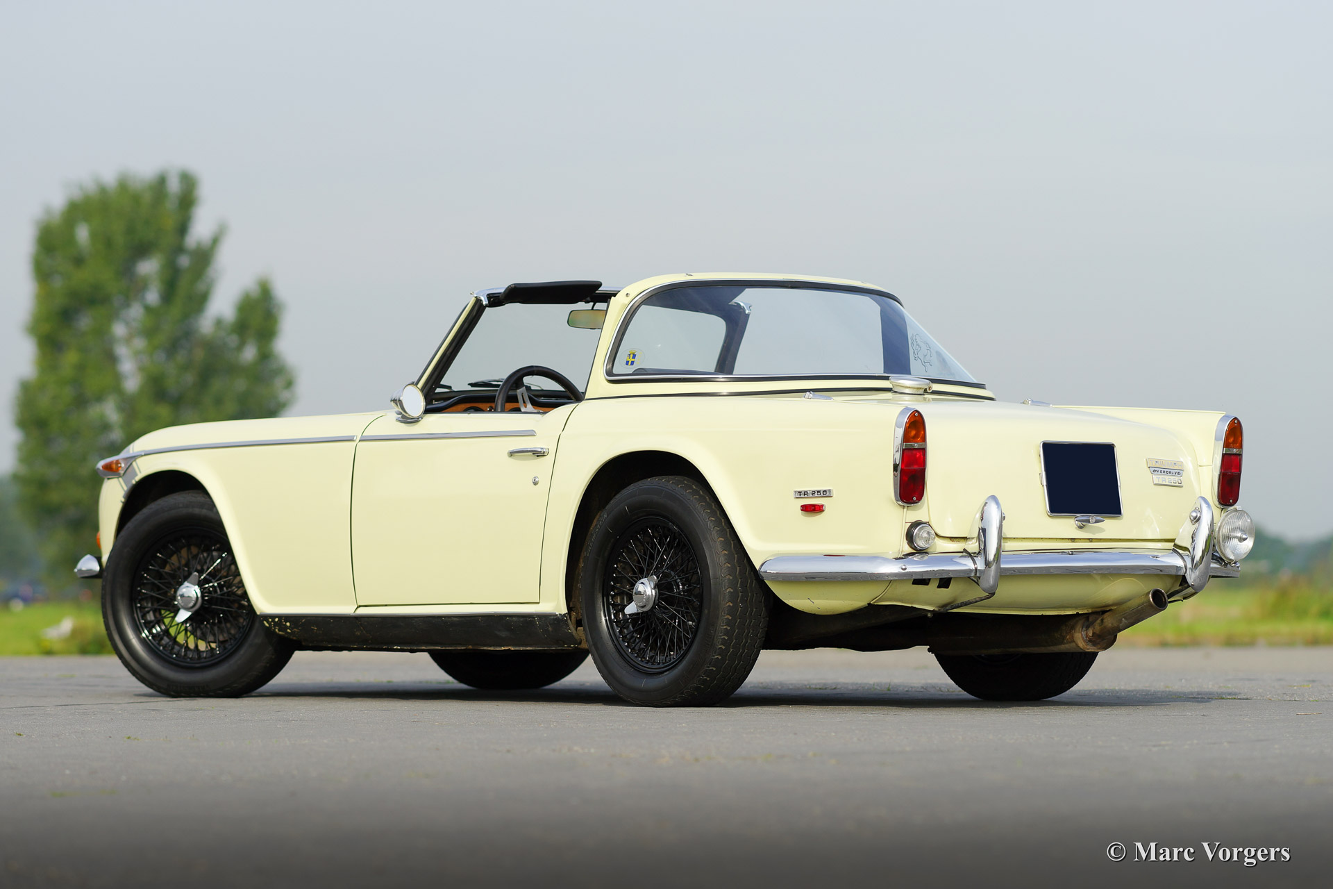 Triumph TR 250, year 1968. Colour primrose yellow with a black leather interior and black carpet. This sporty Triumph TR 250 is in very good condition. The engine was recently overhauled and tuned to about 140 bhp. The car features a sports exhaust and a fantastic 'Surrey top' complete with the two roof parts. One foldable (metal frame with black PVC cover fitting in the boot), and the rigid roof panel. Furthermore the car sports overdrive and black enamelled wire wheels. A true driver car with some signs of use and patina. Very suitable for historic (rally) events or holiday trips!