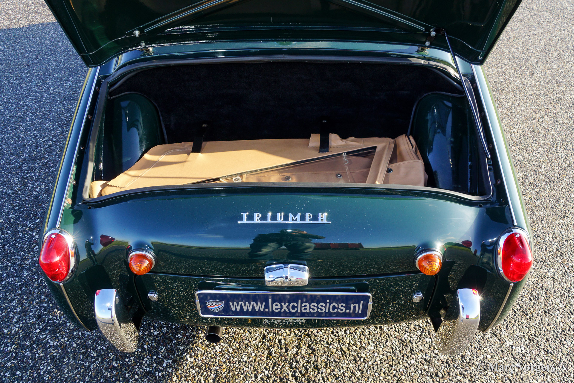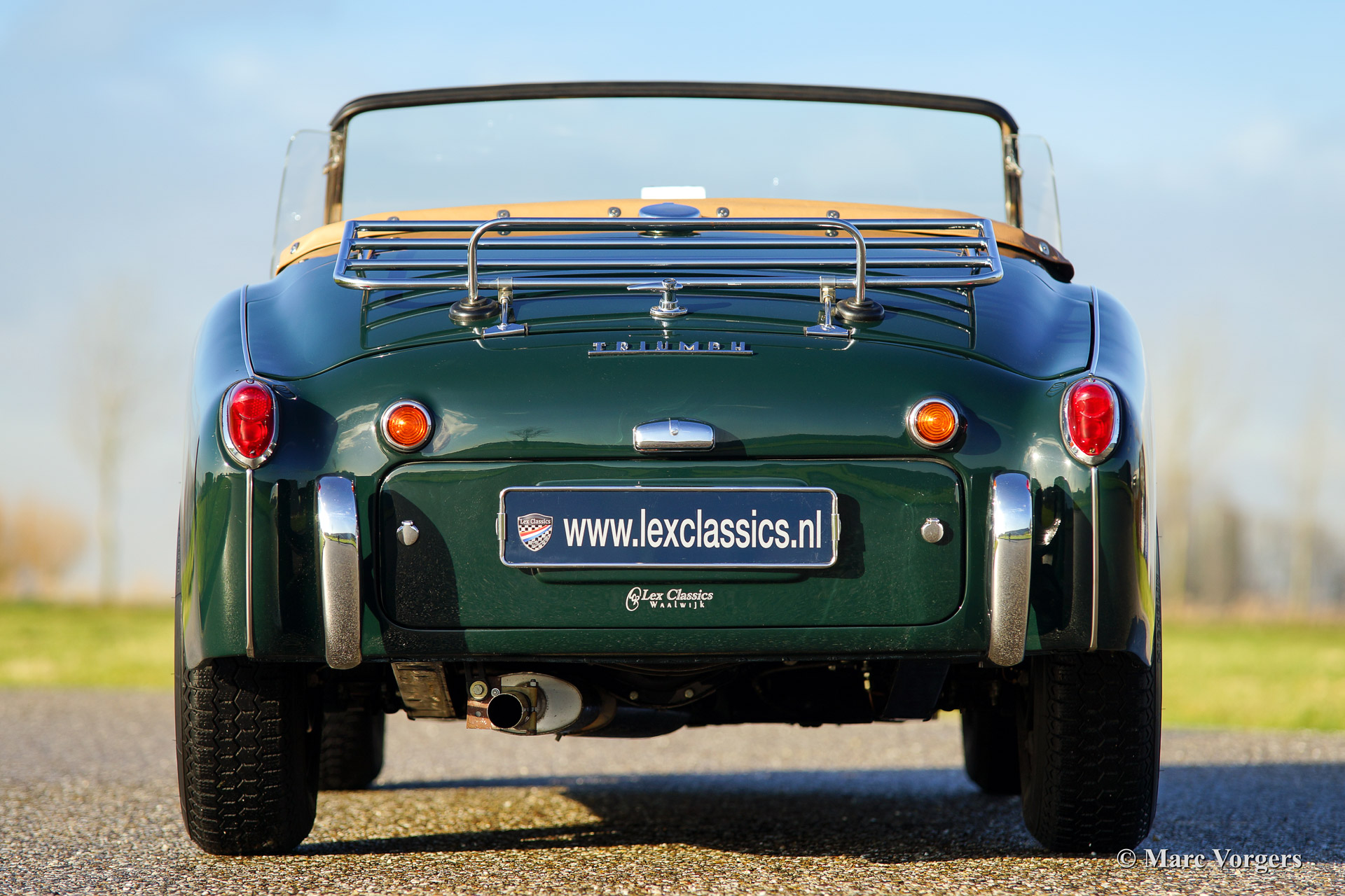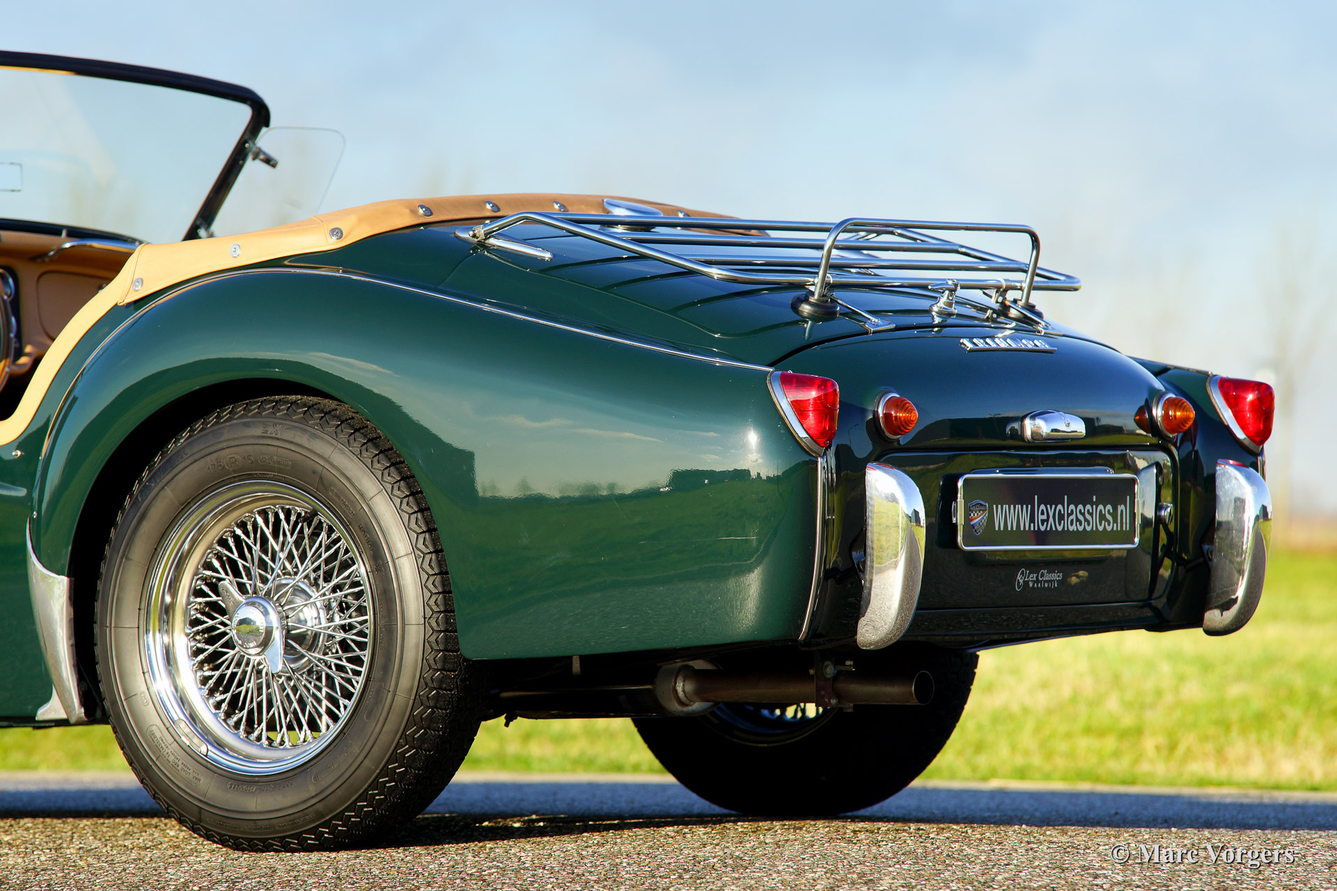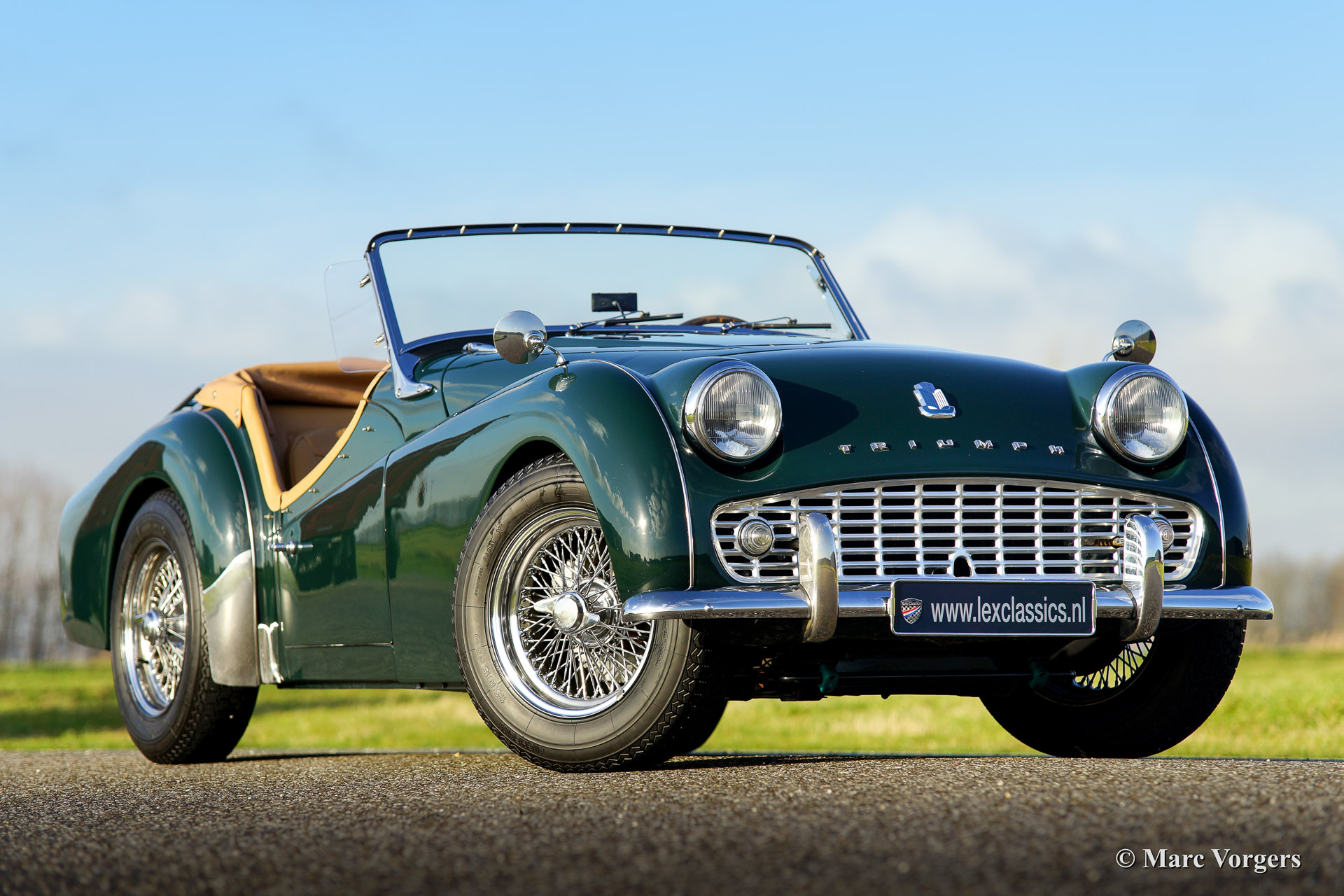 Triumph TR 3a, year 1958. Colour British Racing Green with a tan (beige) leather interior. Beige vinyl soft top, beige side screens, hood cover and a tonneau cover. This magnificent Triumph TR 3a was imported from the USA in the year 2001. The automobile was beautifully 'body off' restored in the Netherlands. Since the restoration the car has driven 9.187 miles. The car is in concour condition. This TR 3a sports wide chrome wire wheels, chrome 'eared' wheelnuts, sports steering wheel with wooden rim and a chrome luggage rack. A very beautiful and delightful driving Triumph TR!