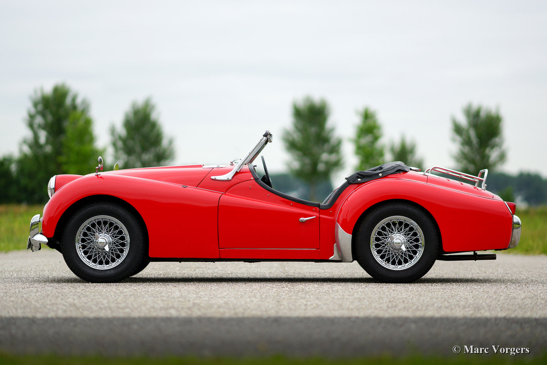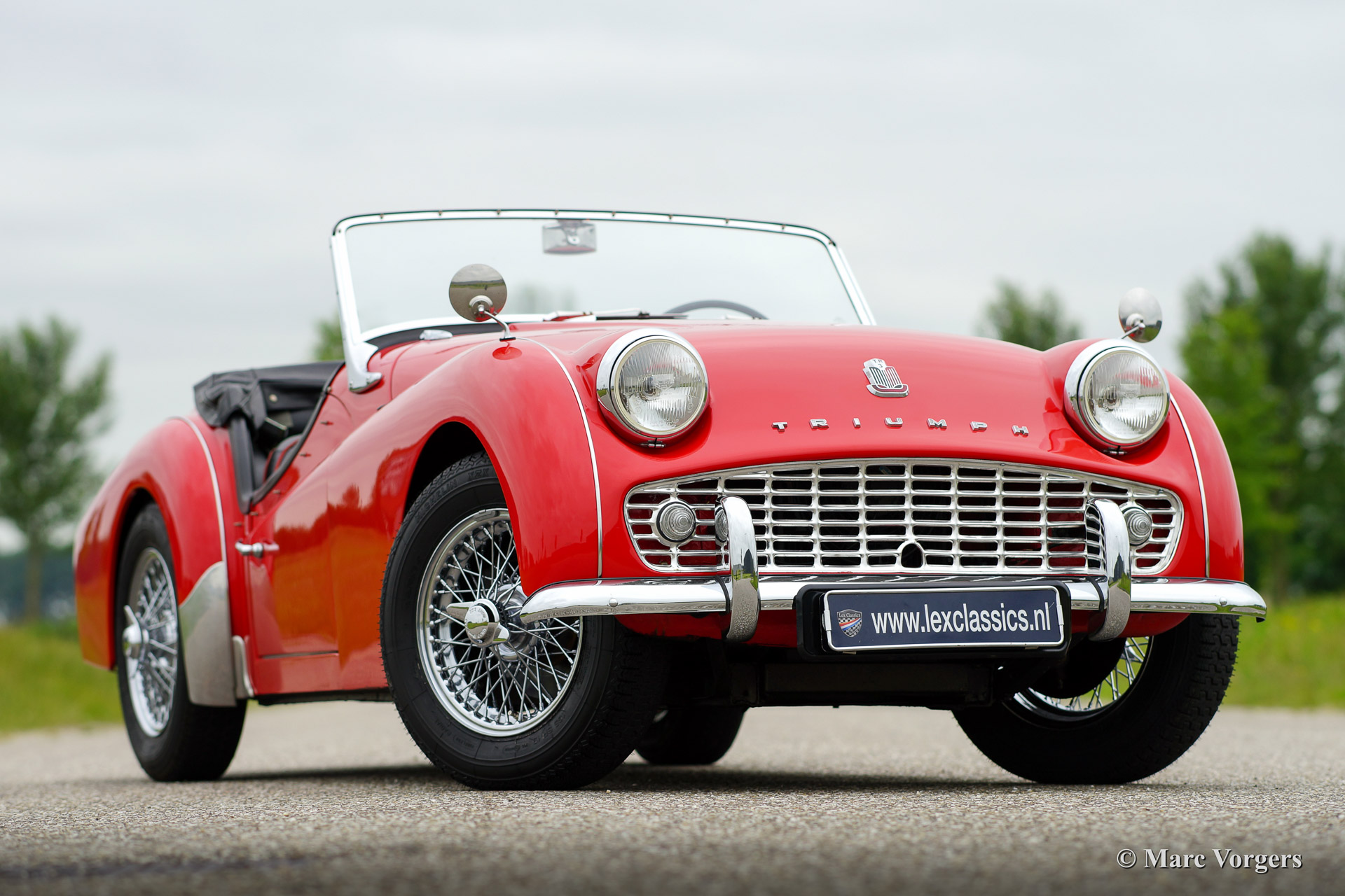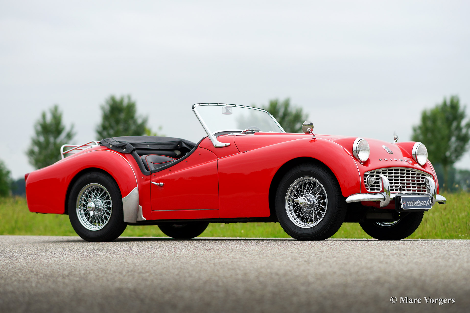 Triumph TR 3a, year 1959. Chassis number TS3359XXX, engine number TS233XX. Colour red with a black interior piped red. Black vinyl soft top, tonneau cover and black side screens. This beautiful Triumph TR 3a was imported to the Netherlands in the year 2000. Then the car was extensively restored. This Triumph TR 3a is in very good condition and the car drives perfectly. The car features silver enamelled wire wheels, a chrome luggage rack, oil filter modification, Kenlow electric cooling fan, high torque starter motor, Stainless Steel exhaust, Koni shock dampers and inertia reel safety harnesses. Recently the car received yearly service. The steering-box was renewed, CHROME wire wheels were fitted and the tires were renewed. This Triumph is currently not available in the Lex Classics showrooms. To inspect the car please schedule an appointment with Mr. Sjors Peters via the contact data provided below.