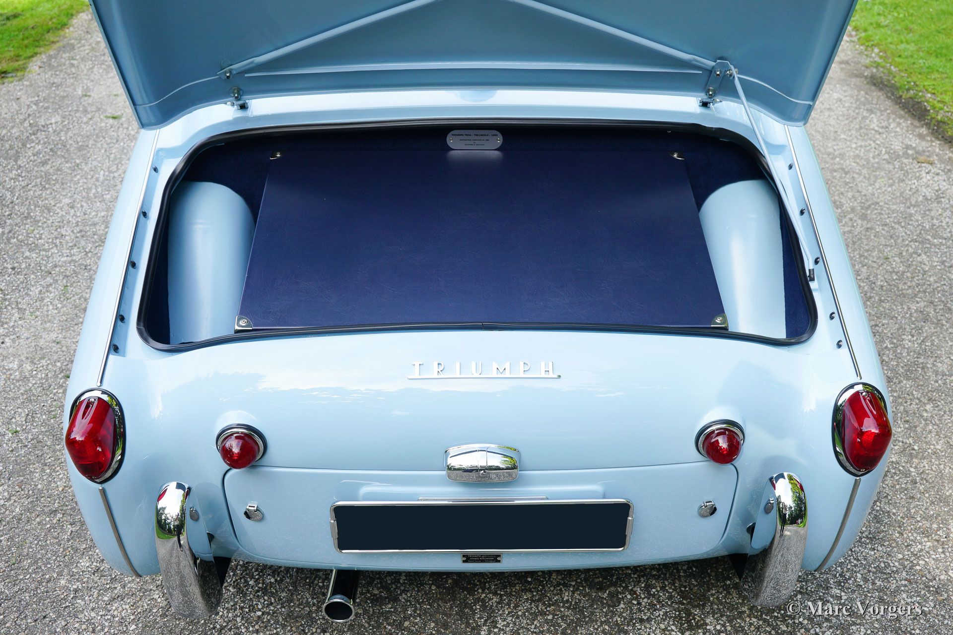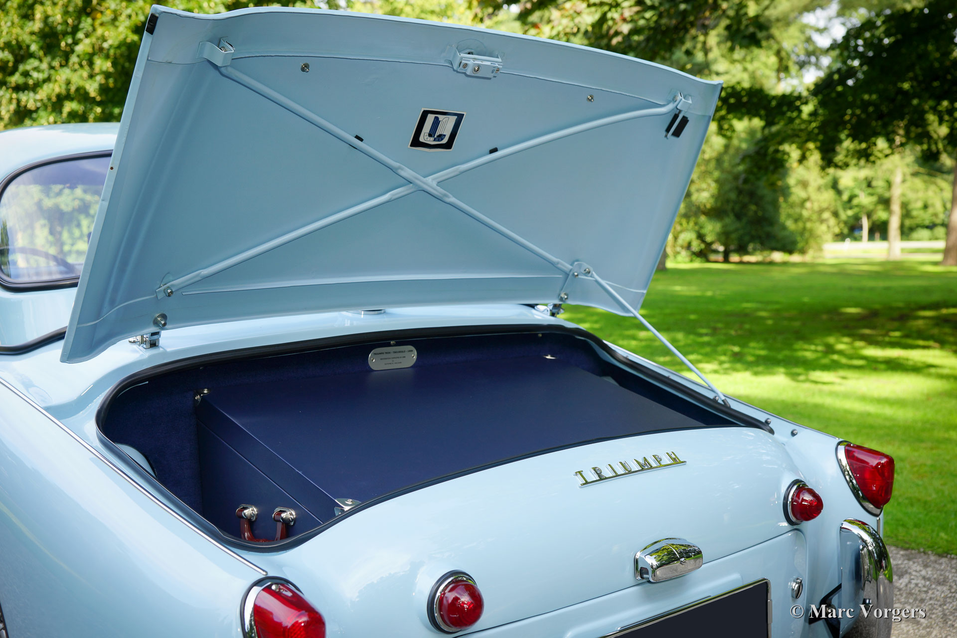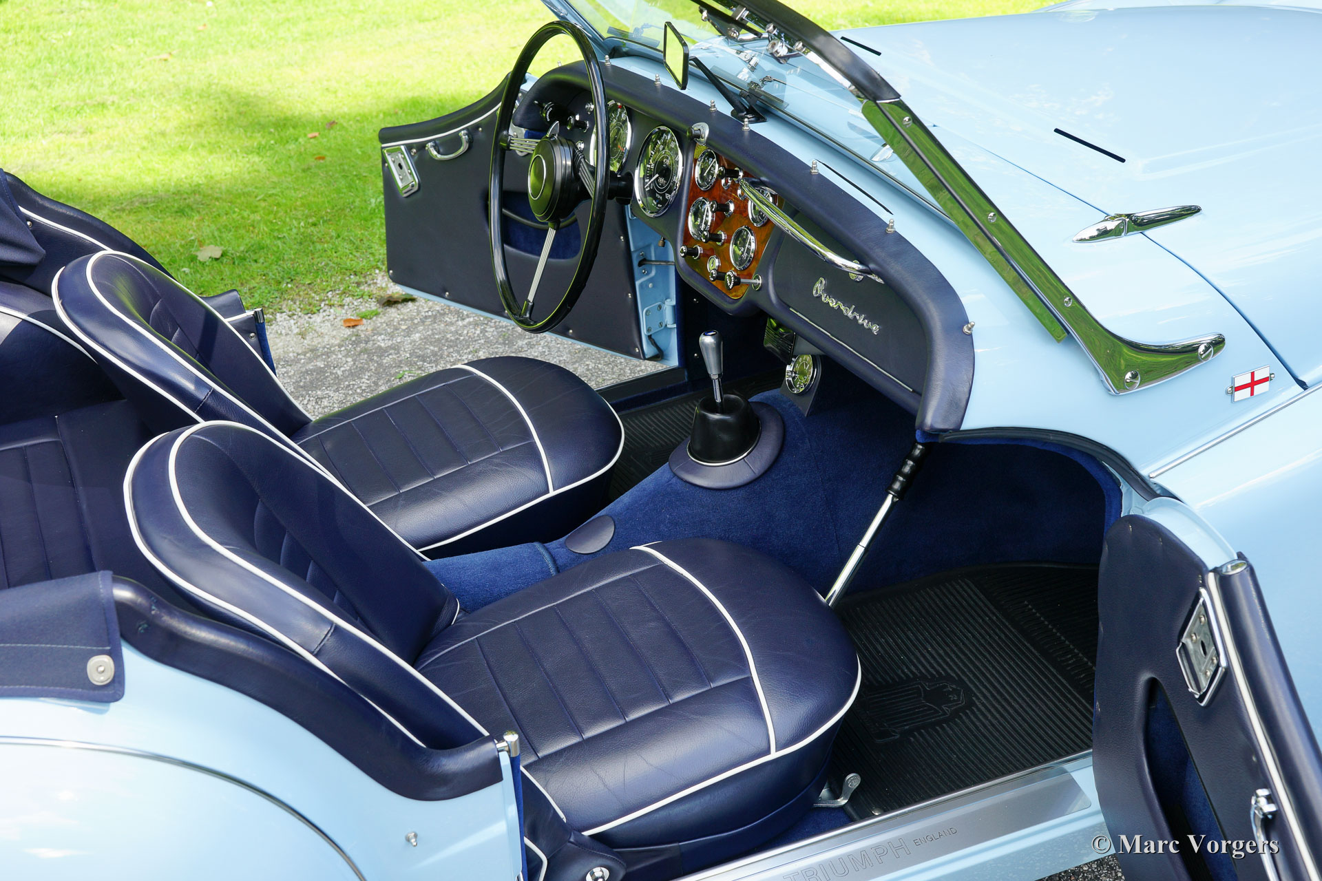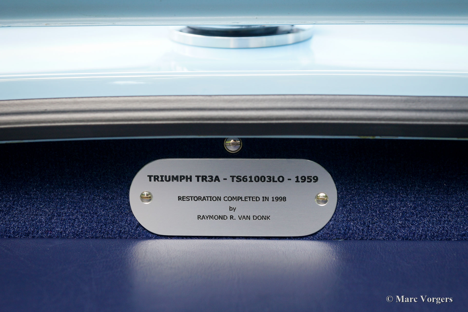 Triumph TR 3a, year 1959. Colour ‘Powder Blue’ with a dark blue leather interior and dark blue matching carpet. Dark blue mohair soft top, side screens and hood cover. The car comes with a terrific original hard top in body colour! This magnificent Triumph TR 3a left the factory on 29 October 1959. The car was sold new to the USA in the colours and specification as you see in the photos, matching numbers and colours.