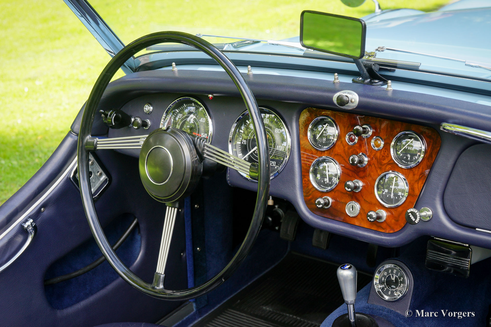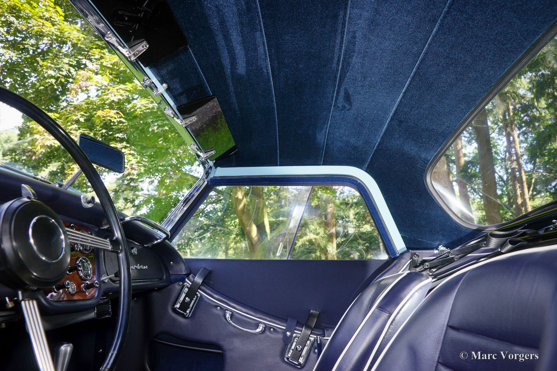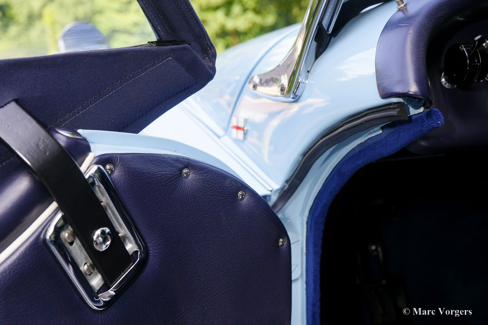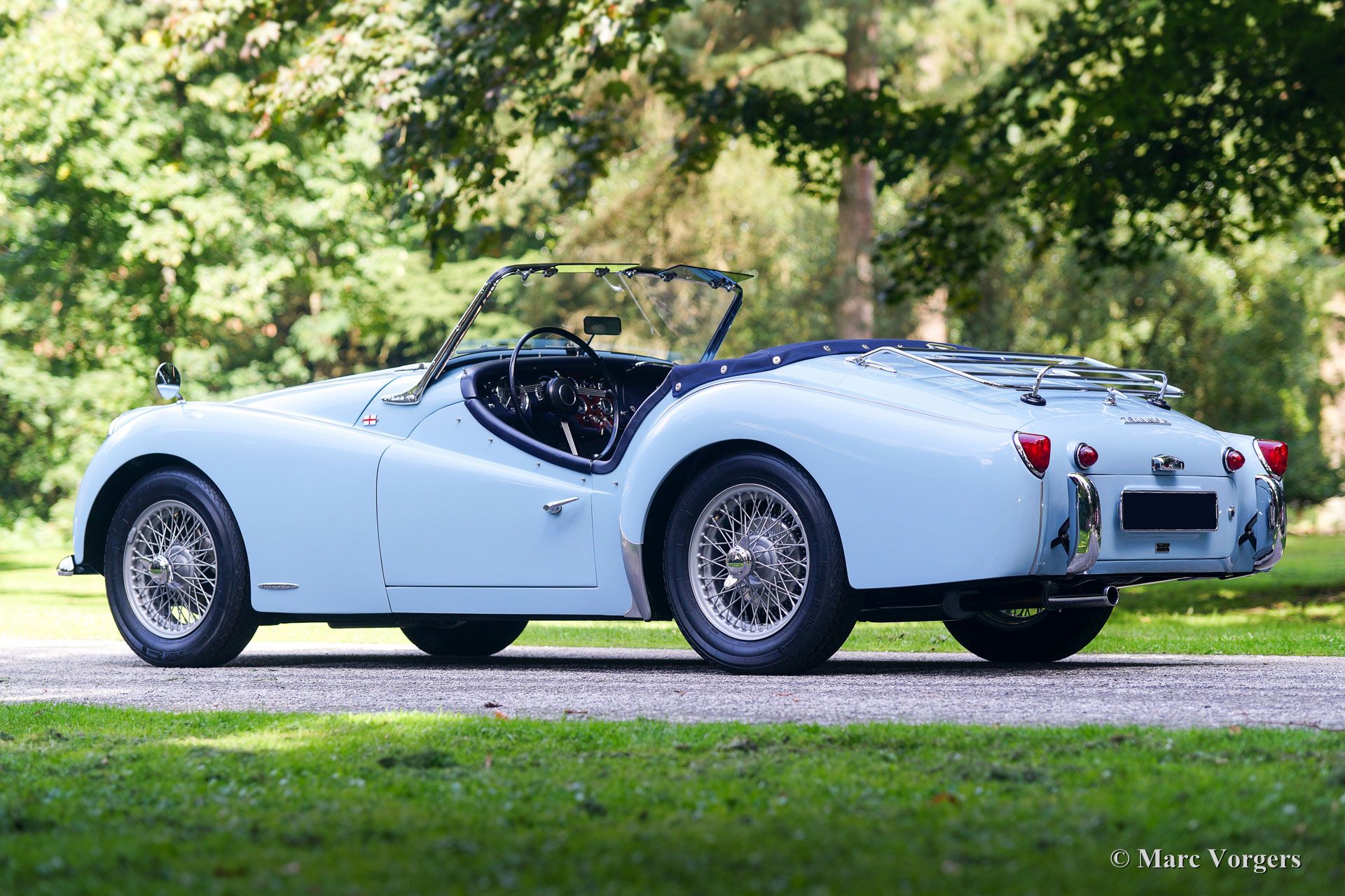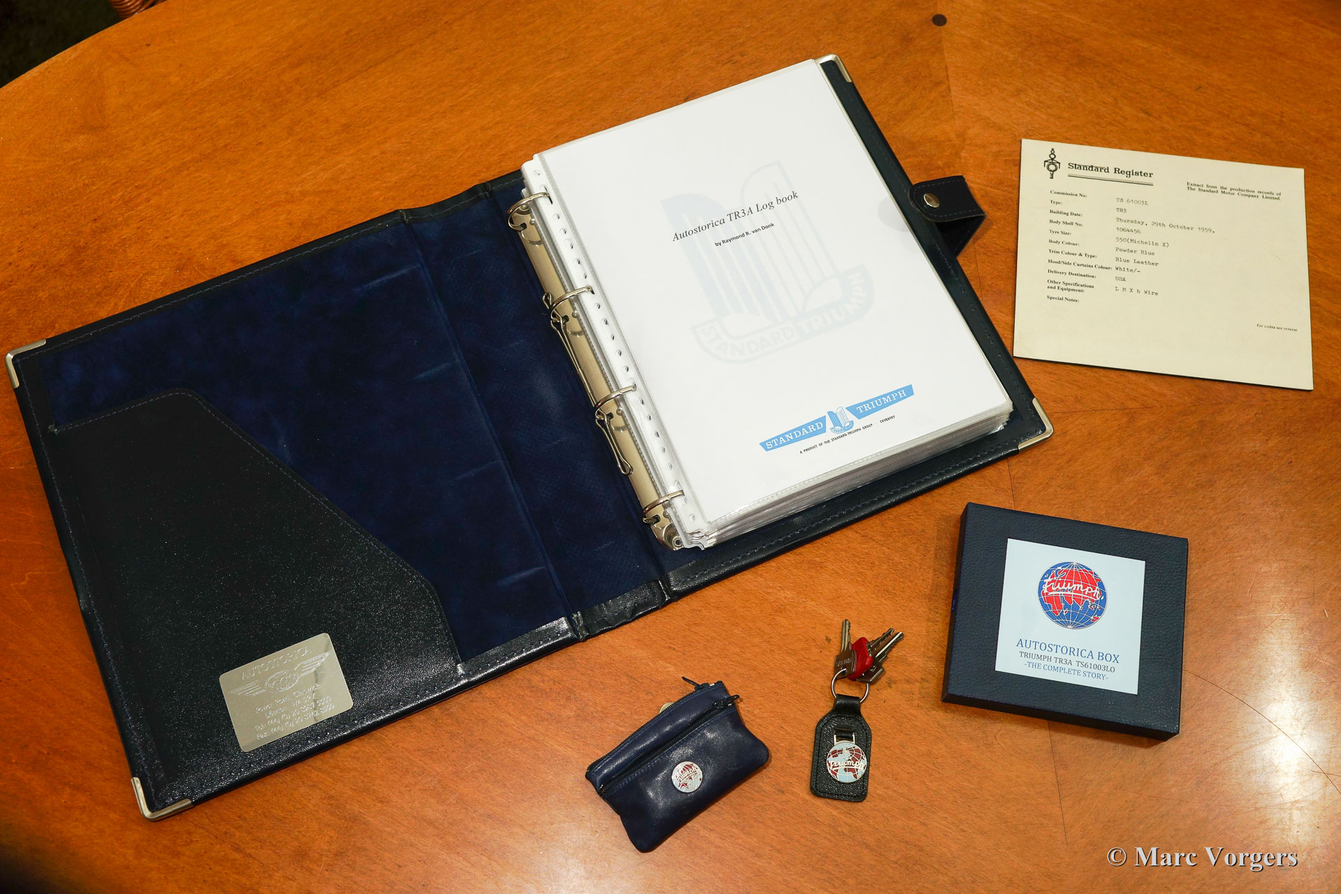 Triumph TR 3a, year 1959. Colour ‘Powder Blue’ with a dark blue leather interior and dark blue matching carpet. Dark blue mohair soft top, side screens and hood cover. The car comes with a terrific original hard top in body colour! This magnificent Triumph TR 3a left the factory on 29 October 1959. The car was sold new to the USA in the colours and specification as you see in the photos, matching numbers and colours.
