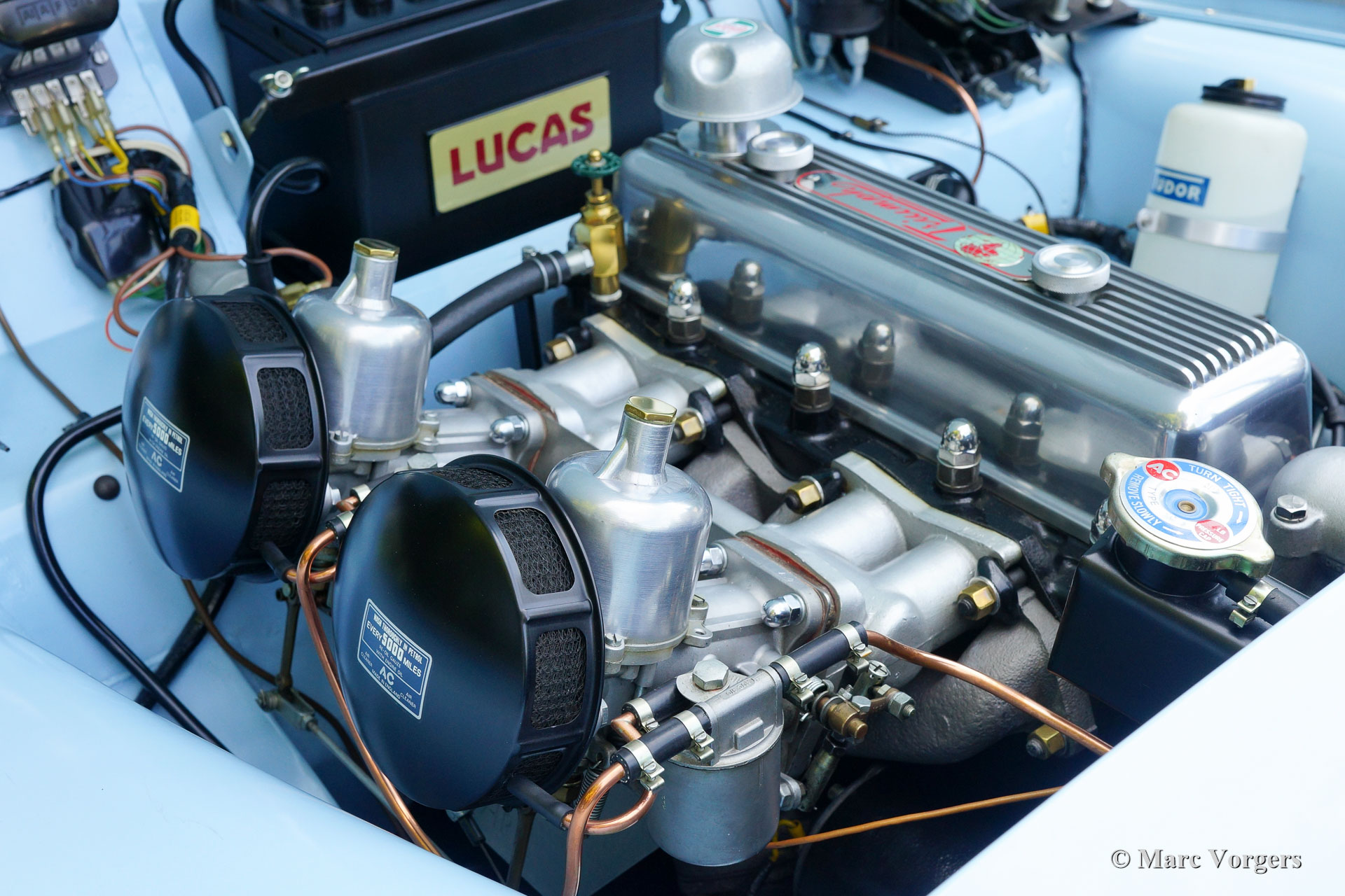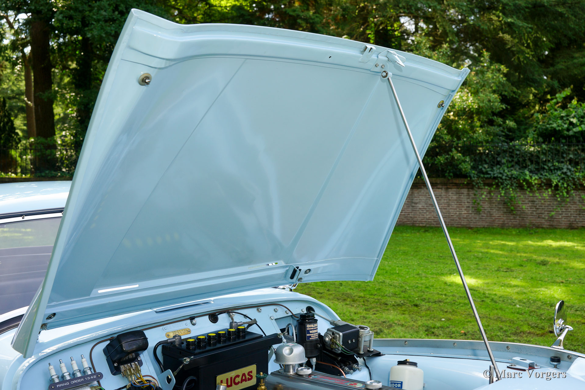 The Triumph TR 3 is a no nonsense sports car; very robust, simple and reliable, a true British sports car all over. The TR 3 was the first production car, off factory, equipped with disc brakes on the front-wheels. The engine was a Standard Vanguard based, cast-iron, long stroke, in-line four cylinder with a displacement of 1991cc. The TR 3 engine was equipped with two carburettors giving a power-output of almost 100 bhp.