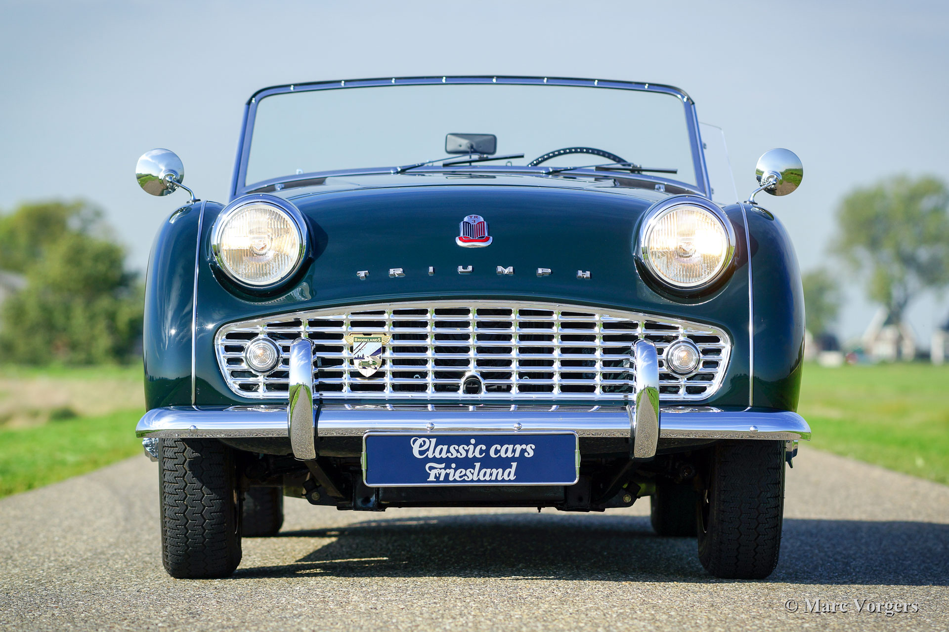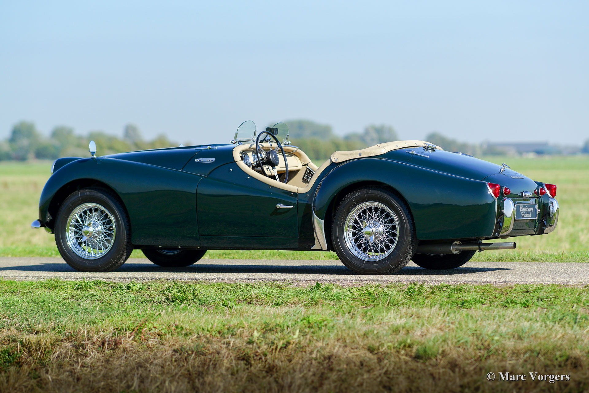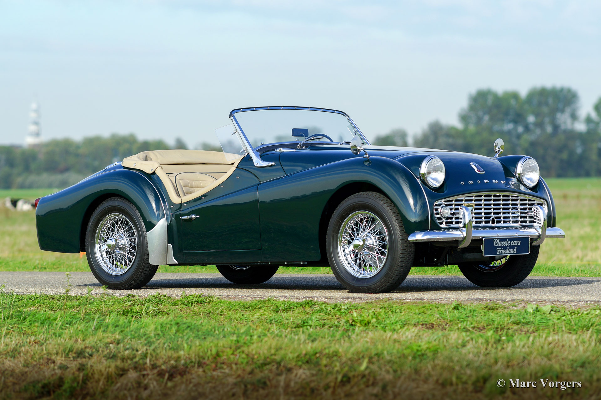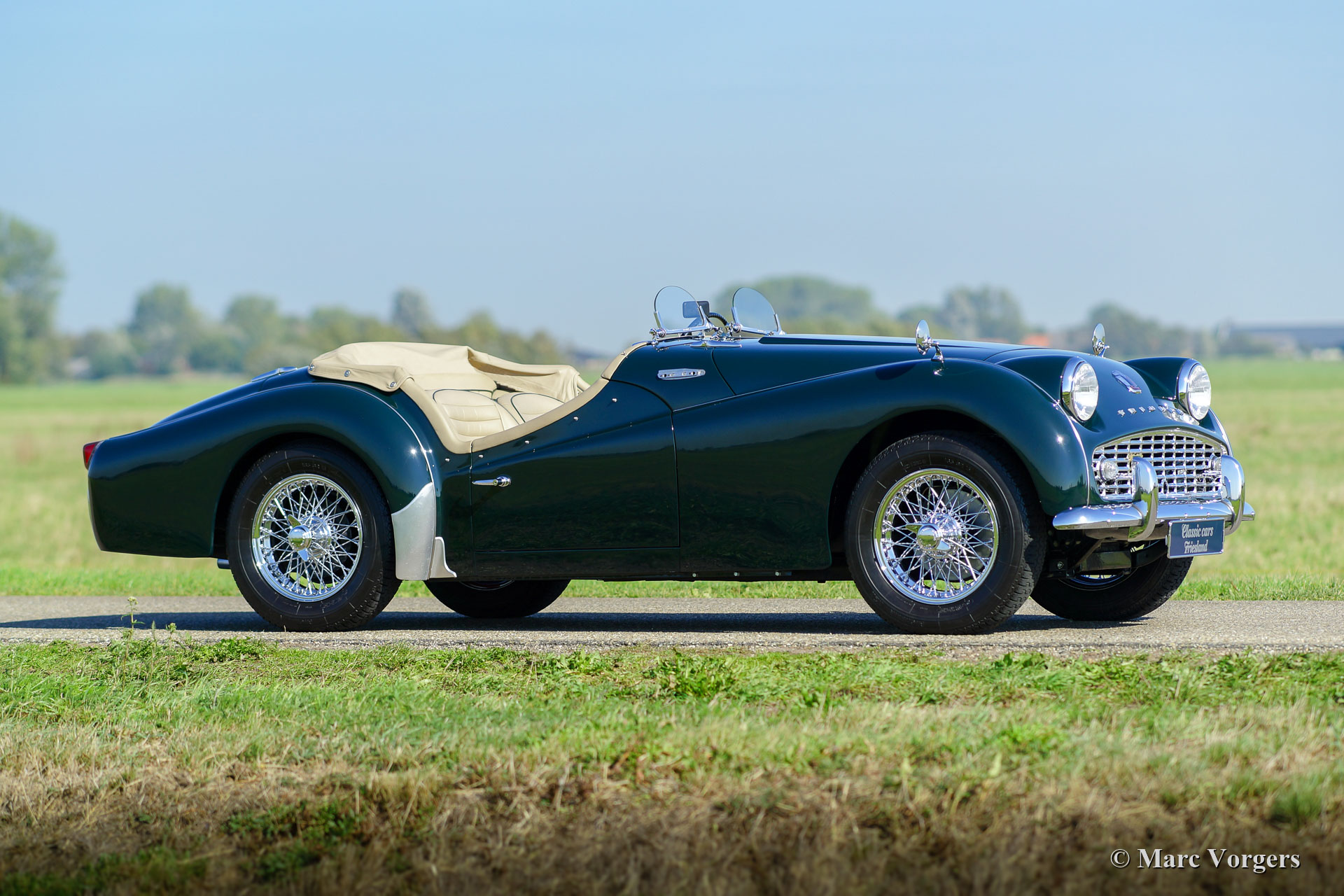 Triumph TR 3A, year 1959. Colour dark British Racing Green combined with a beige leather interior and green wool carpet. Beige mohair soft-top, side-screens and tonneau cover. This fantastic Triumph TR 3A was extensively and professionally restored to perfection in the Netherlands. Since completion of the restoration the car has driven only 3245 kilometres. This gorgeous TR 3A is in concours superb TOP condition: Concours! A restoration file with a photo report and invoices is present. The body was restored from the bare metal, the chassis was sand blasted and stove enamel coated. The engine, gearbox, overdrive, carburettors and suspension were overhauled. The cylinder head was modified for the use of lead-free petrol. Also, a new wiring loom was fitted. This very fine Triumph TR 3A features chrome wire wheels and Brooklands ‘aero-screens’. This Triumph TR 3A looks a picture and it drives perfectly! A top-class example!