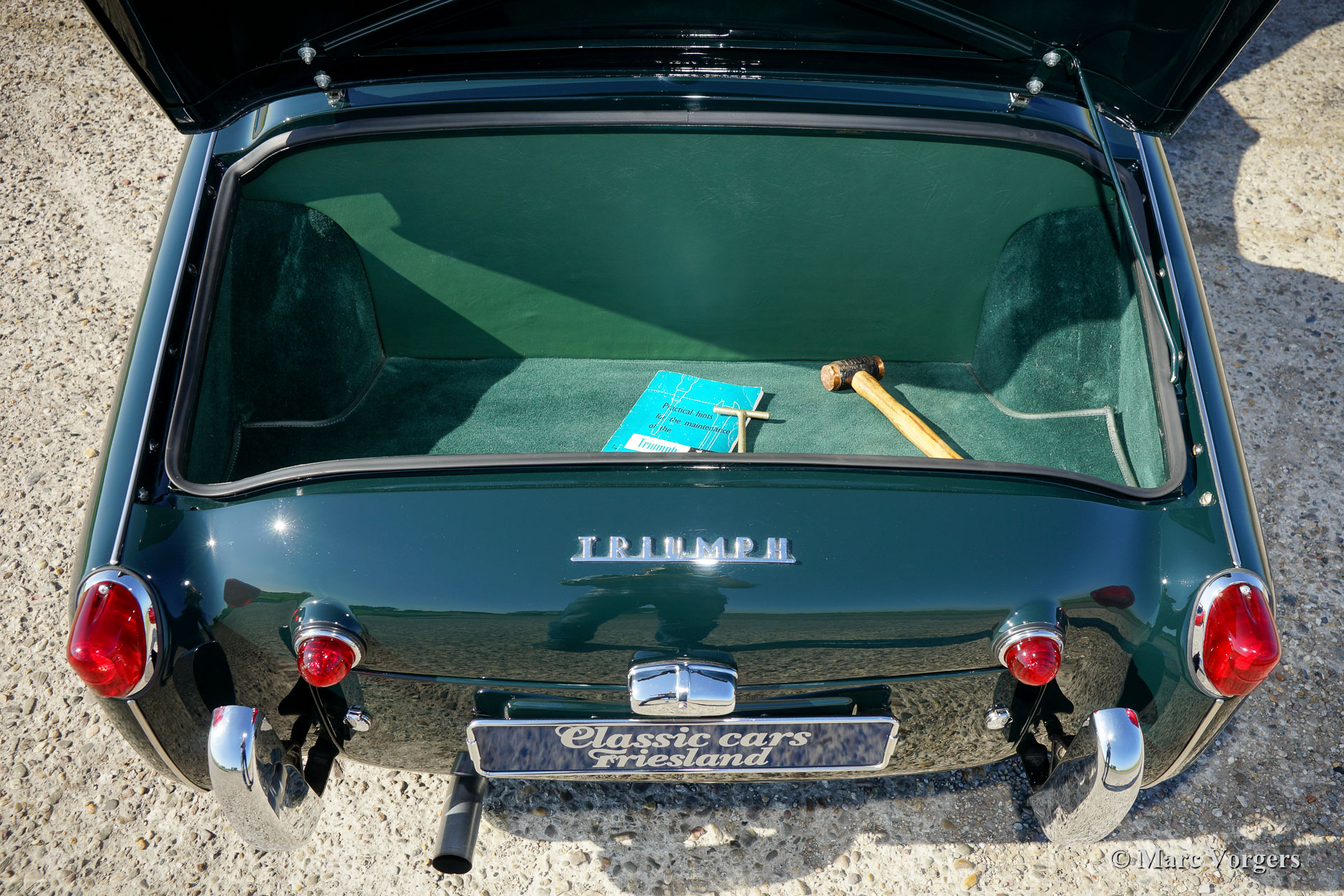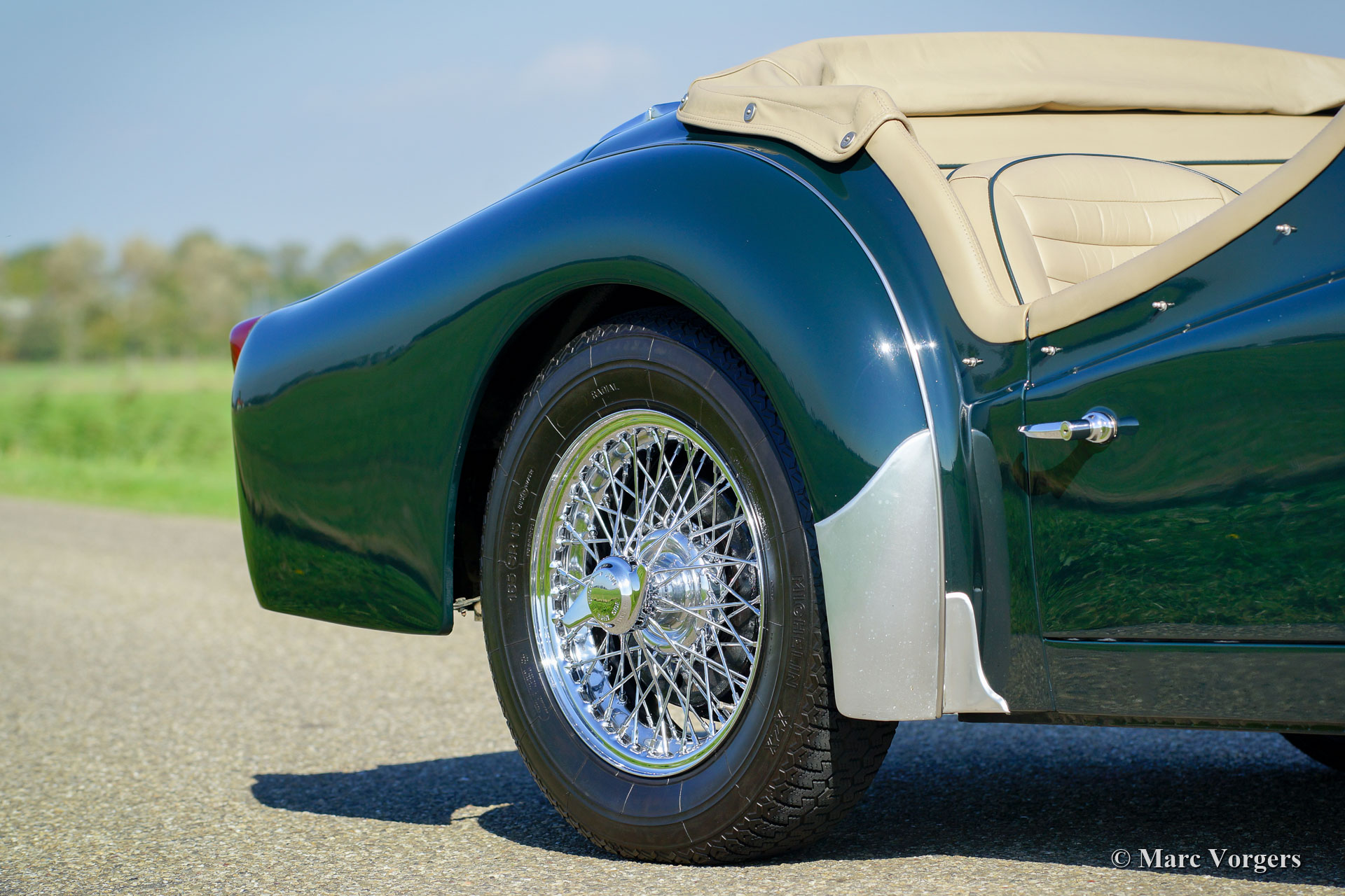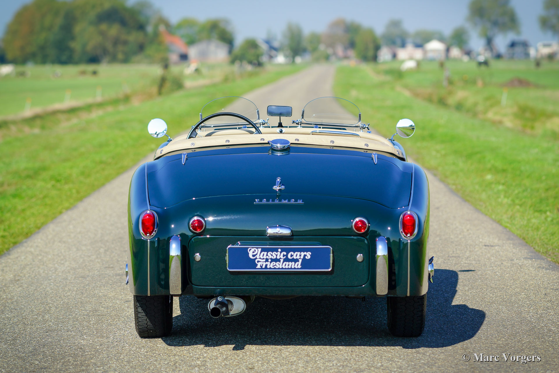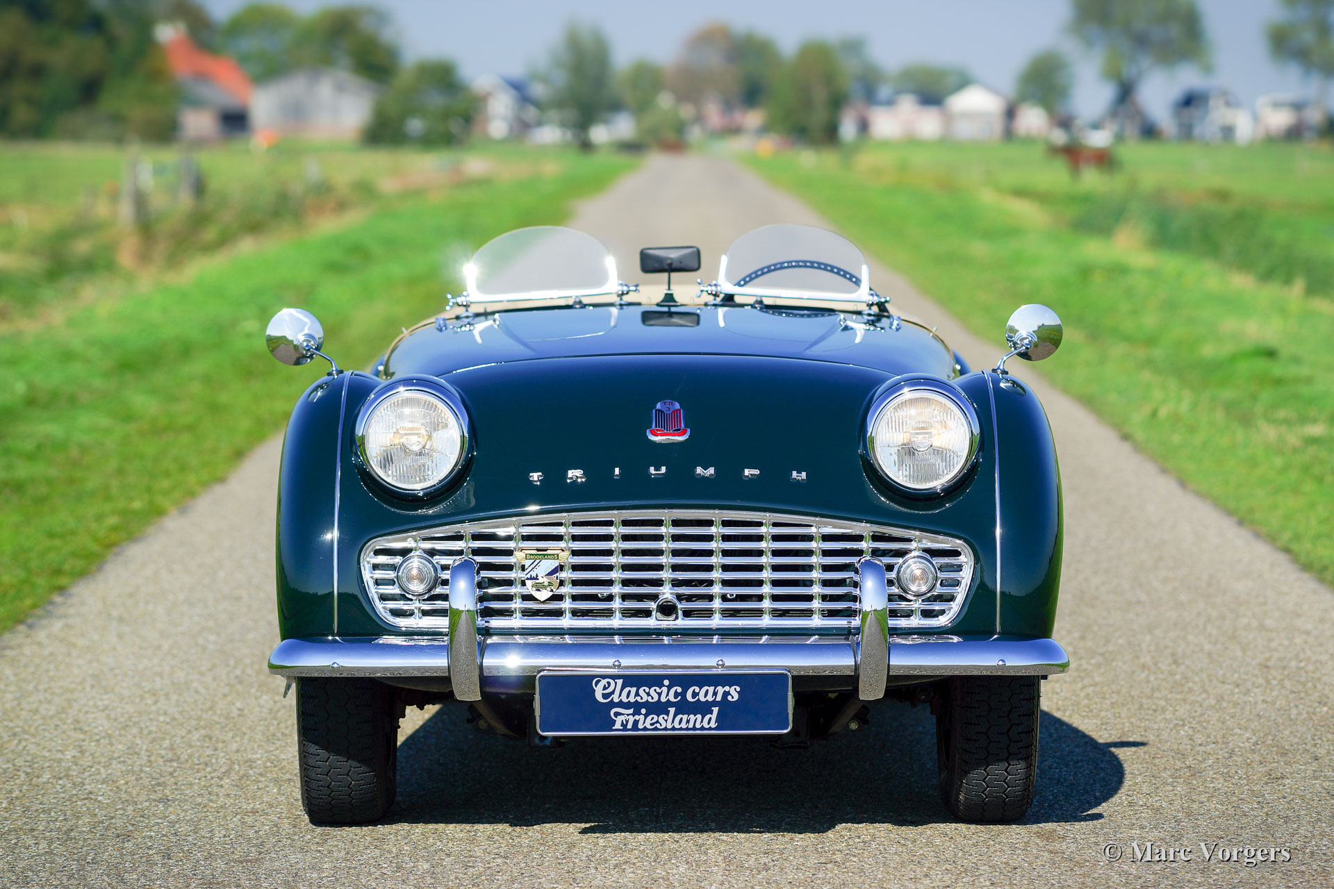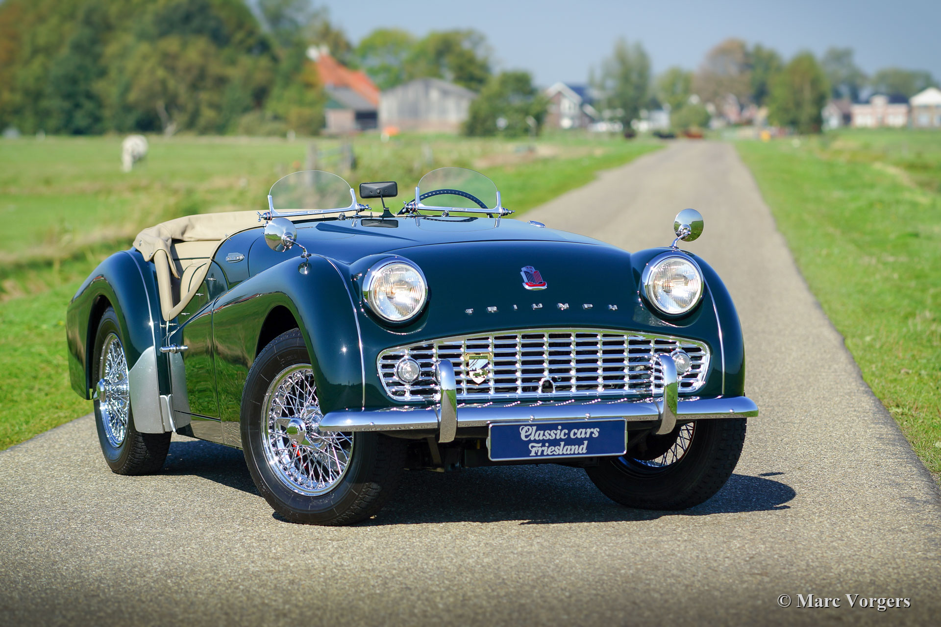 Triumph TR 3A, year 1959. Colour dark British Racing Green combined with a beige leather interior and green wool carpet. Beige mohair soft-top, side-screens and tonneau cover. This fantastic Triumph TR 3A was extensively and professionally restored to perfection in the Netherlands. Since completion of the restoration the car has driven only 3245 kilometres. This gorgeous TR 3A is in concours superb TOP condition: Concours! A restoration file with a photo report and invoices is present. The body was restored from the bare metal, the chassis was sand blasted and stove enamel coated. The engine, gearbox, overdrive, carburettors and suspension were overhauled. The cylinder head was modified for the use of lead-free petrol. Also, a new wiring loom was fitted. This very fine Triumph TR 3A features chrome wire wheels and Brooklands ‘aero-screens’. This Triumph TR 3A looks a picture and it drives perfectly! A top-class example!