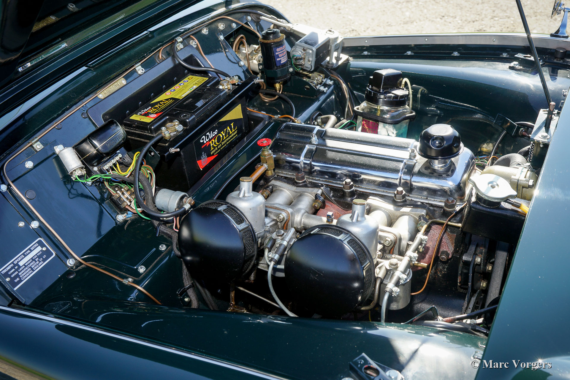 The Triumph TR 3 is a no nonsense sports car; very robust, simple and reliable, a true British sports car all over. The TR 3 was the first production car, off factory, equipped with disc brakes on the front-wheels. The engine was a Standard Vanguard based, cast-iron, long stroke, in-line four cylinder with a displacement of 1991cc. The TR 3 engine was equipped with two carburettors giving a power-output of almost 100 bhp.