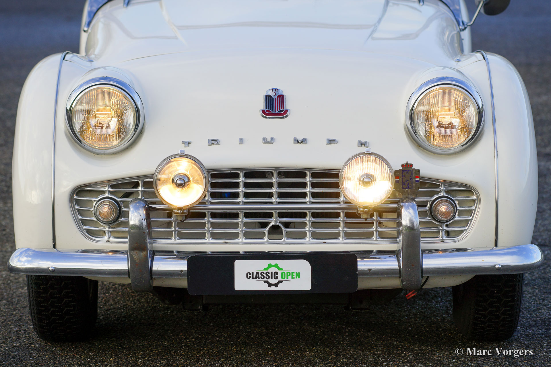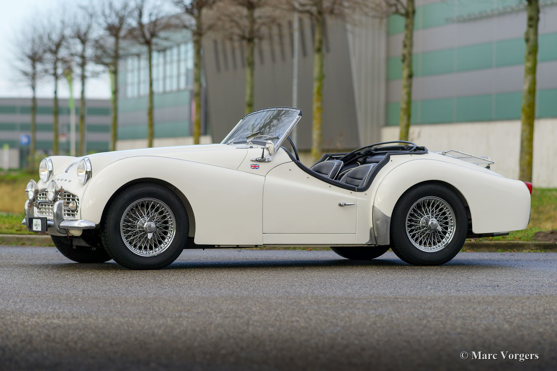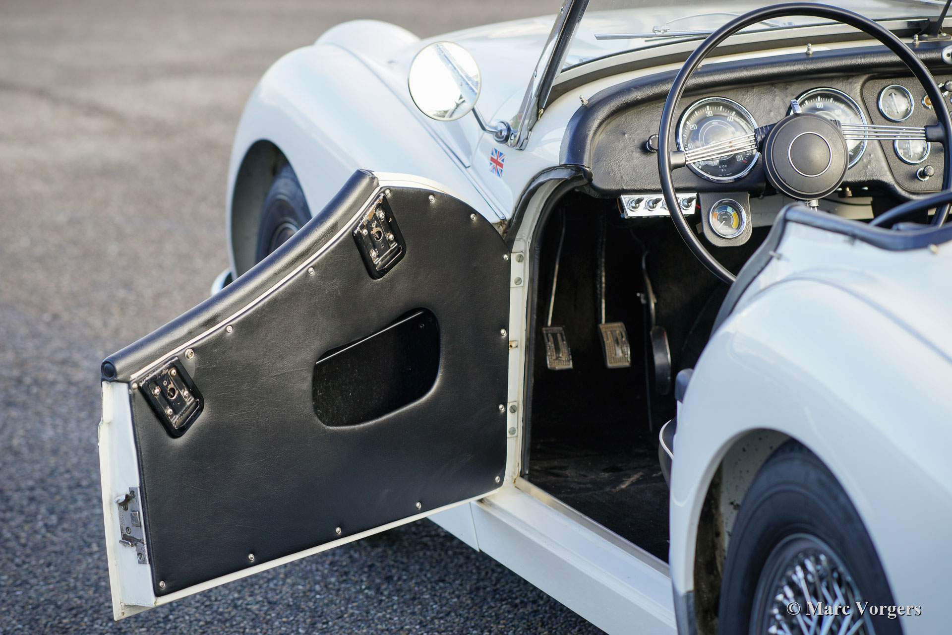 Triumph TR 3A, year 1959. Colour Pearl White combined with a black leather interior and black carpet. Black mohair hood and side-screens. This rugged and beautiful Triumph TR 3A was sold new in the USA. After the Triumph had arrived in the Netherlands, the car was extensively restored to factory original specifications. Documentation and a photo report of this restoration are present. This TR 3A is in a very good to excellent condition with minimal signs of previous use. The bodywork shows an excellent panel fit. All the original details are present. The car is fitted with extra options like a badge bar, a Lucas driving lamp set (SFT576 wide beam lamp and a SLR576 spot lamp), Kenlow electric cooling fan, wire wheels shod with Michelin XZX tyres, and a chrome baggage rack. Since the 1990’s this fantastic Triumph TR 3A has known only two caring owners. The car drives and handles perfectly, and it offers a magnificent classic open top driving experience. A very desirable Triumph roadster!
