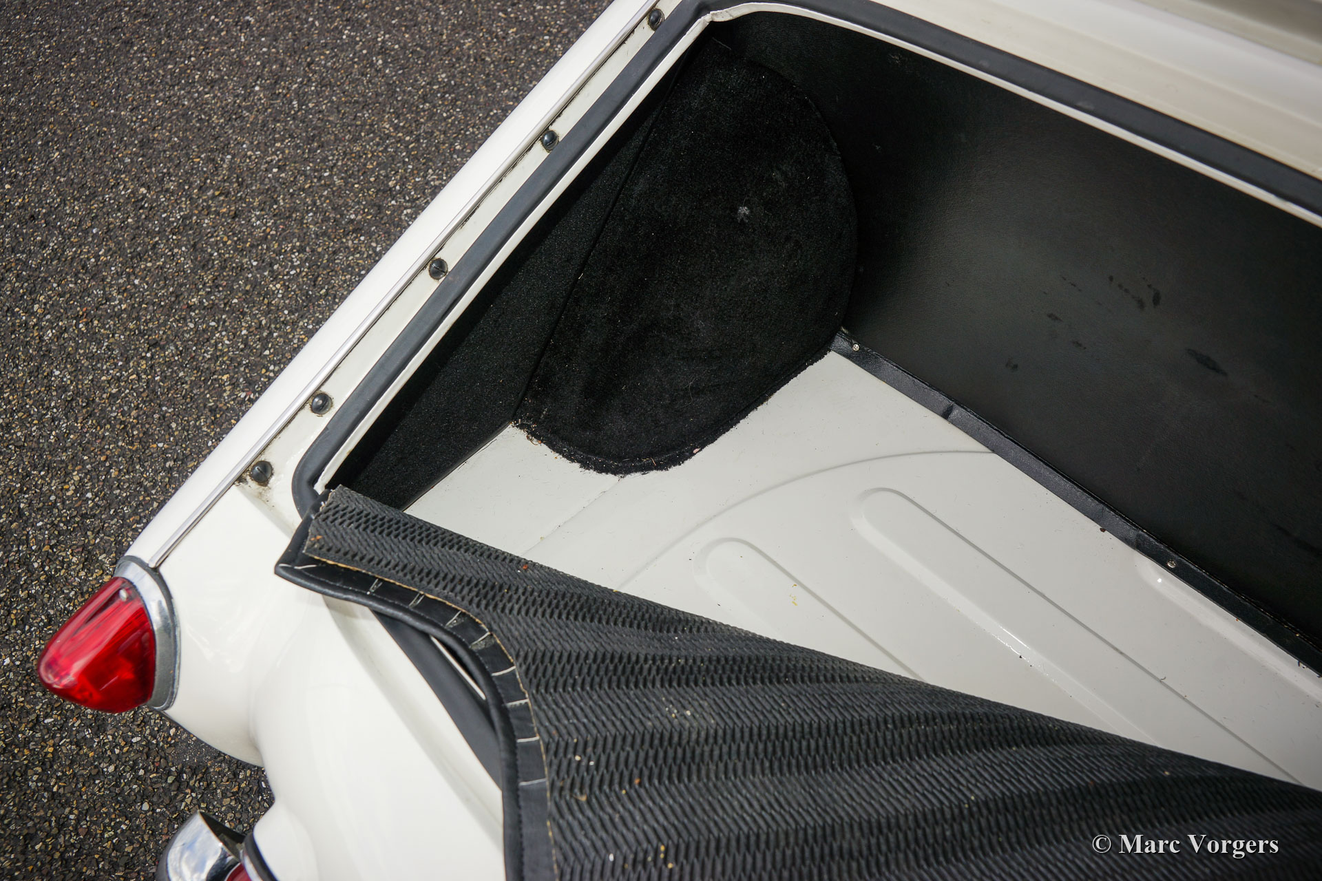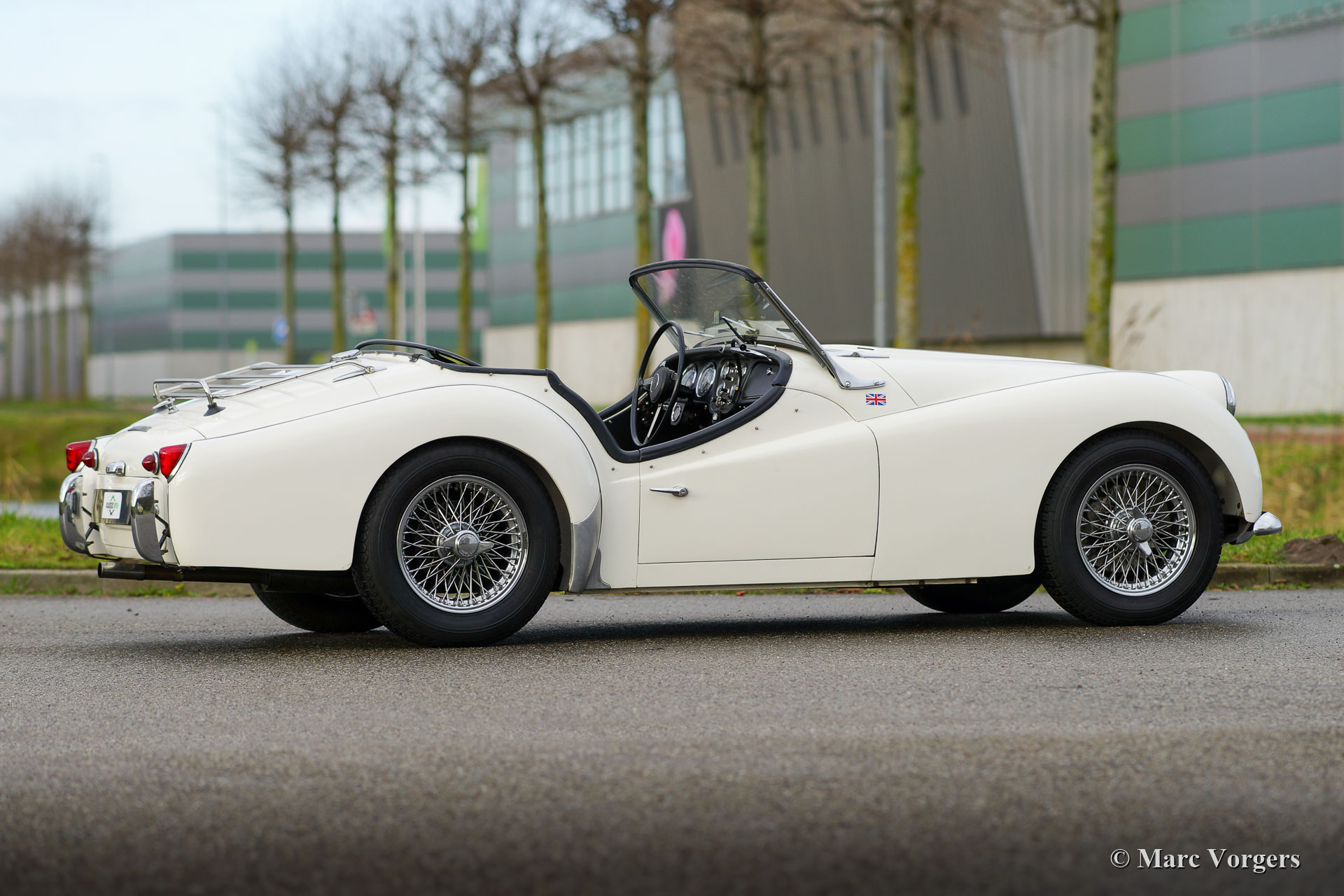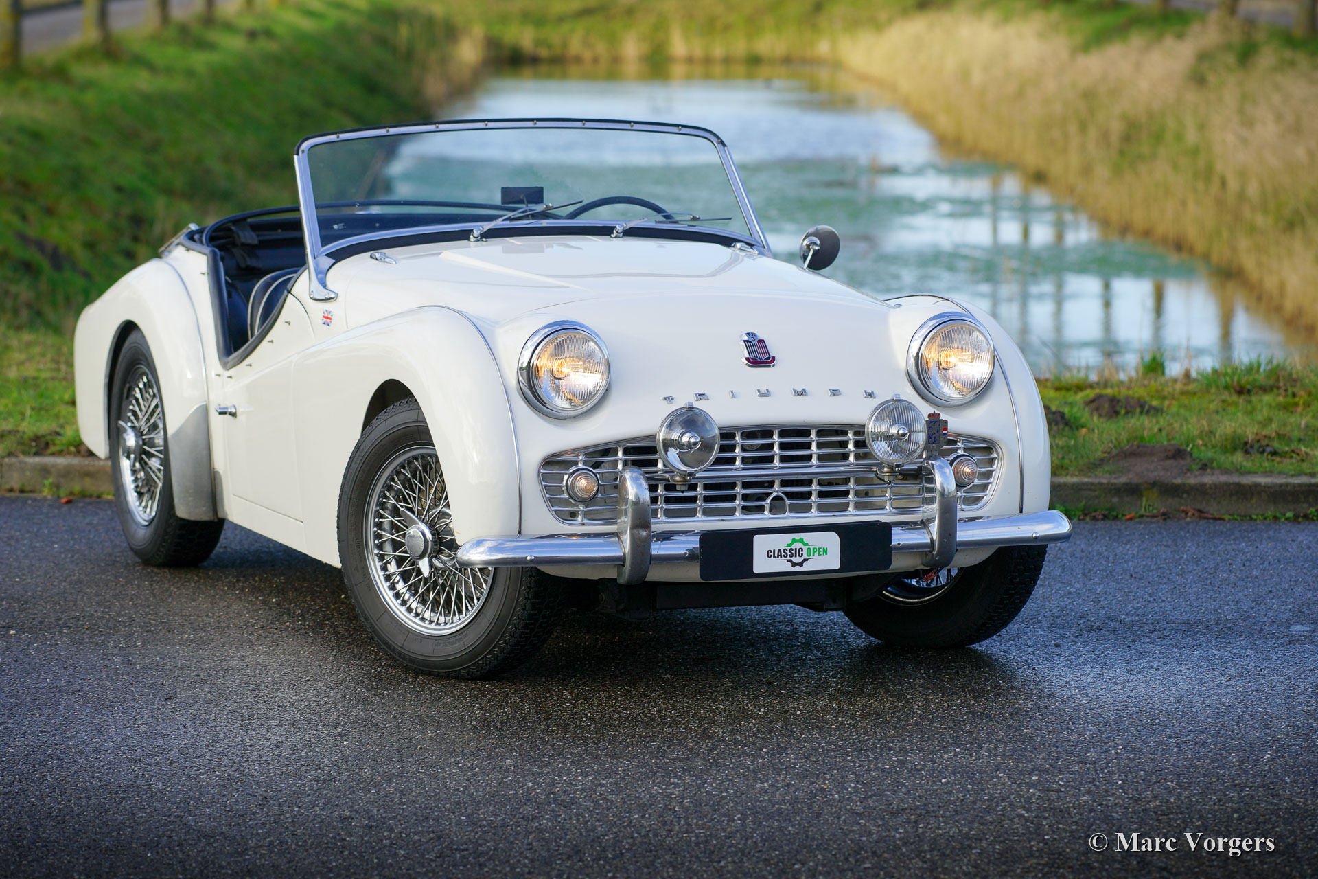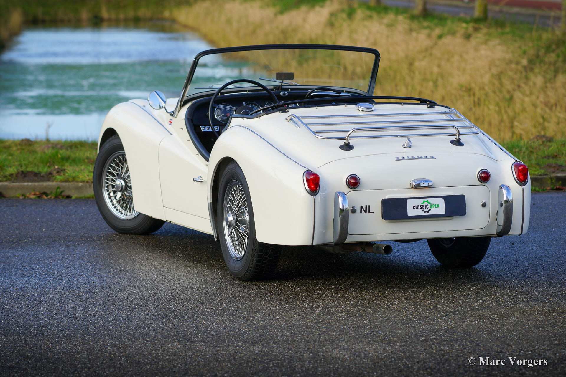 Triumph TR 3A, year 1959. Colour Pearl White combined with a black leather interior and black carpet. Black mohair hood and side-screens. This rugged and beautiful Triumph TR 3A was sold new in the USA. After the Triumph had arrived in the Netherlands, the car was extensively restored to factory original specifications. Documentation and a photo report of this restoration are present. This TR 3A is in a very good to excellent condition with minimal signs of previous use. The bodywork shows an excellent panel fit. All the original details are present. The car is fitted with extra options like a badge bar, a Lucas driving lamp set (SFT576 wide beam lamp and a SLR576 spot lamp), Kenlow electric cooling fan, wire wheels shod with Michelin XZX tyres, and a chrome baggage rack. Since the 1990’s this fantastic Triumph TR 3A has known only two caring owners. The car drives and handles perfectly, and it offers a magnificent classic open top driving experience. A very desirable Triumph roadster!