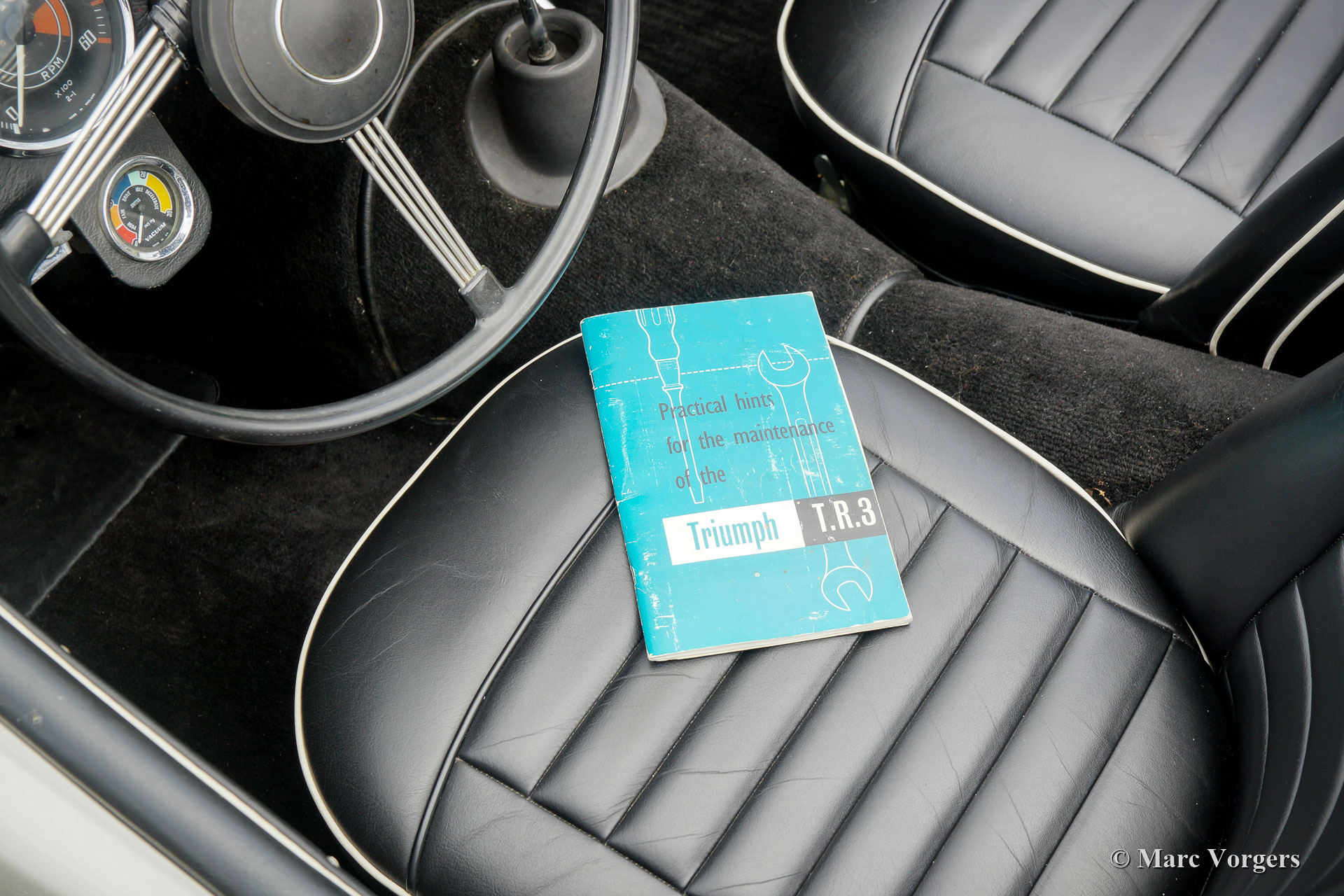 The Triumph TR 3 was uprated twice during the entire production period. In 1957 the car became a wider grille, door handles on the outside and slightly recessed headlamps and was named TR 3a then. In 1960-61 the cylinder capacity was enlarged to 2138 cc. giving a capacity of 104 bhp. and extra torque. Also the fully synchronized TR4 gearbox was incorporated. The car was then named TR 3b. The TR 3 is a pure two-person roadster, a classic generously giving you the fifties British sports car feeling, rough but honest. It comes with a simple soft-top for weather protection. Separate clip-on side screens can additionally be attached to the doors.