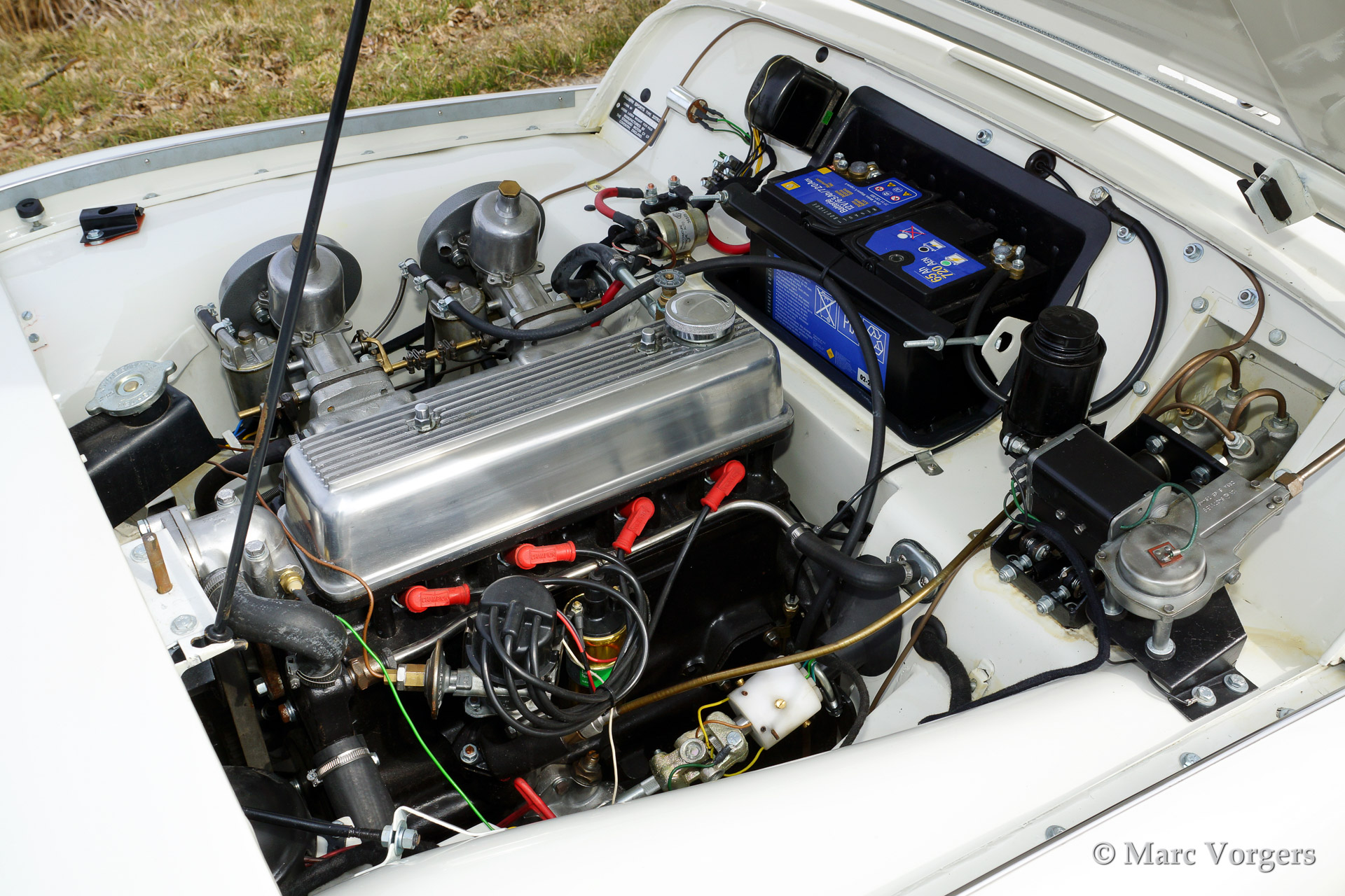 The Triumph TR 3 is a no nonsense sports car; very robust, simple and reliable, a true British sports car all over. The TR 3 was the first production car, off factory, equipped with disc brakes on the front-wheels. The engine was a Standard Vanguard based, cast-iron, long stroke, in-line four cylinder with a displacement of 1991cc. The TR 3 engine was equipped with two carburettors giving a power-output of almost 100 bhp.