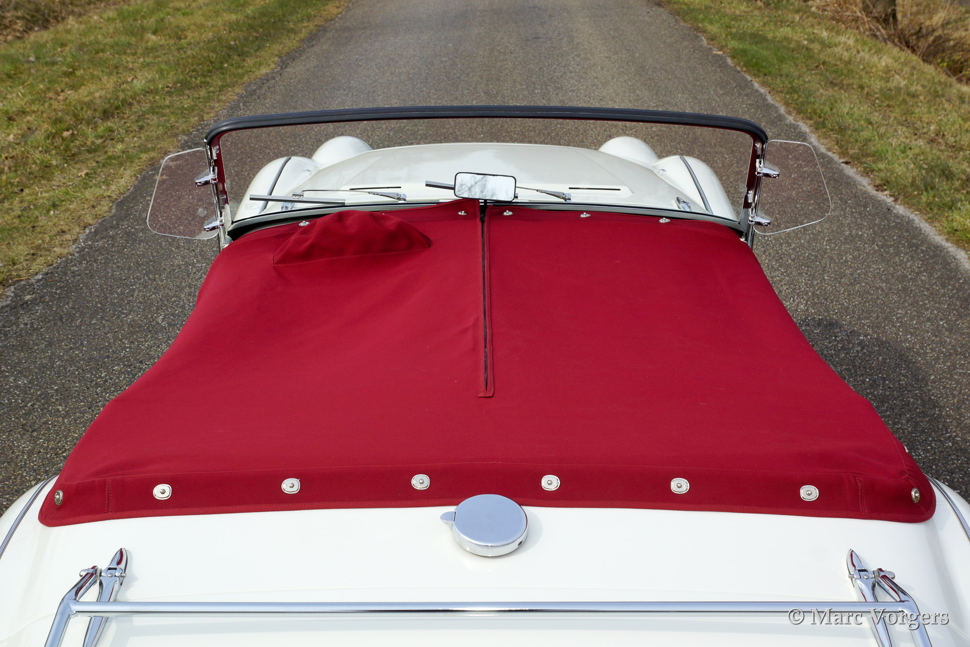 The Triumph TR 3 was uprated twice during the entire production period. In 1957 the car became a wider grille, door handles on the outside and slightly recessed headlamps and was named TR 3a then. In 1960-61 the cylinder capacity was enlarged to 2138 cc. giving a capacity of 104 bhp. and extra torque. Also the fully synchronized TR4 gearbox was incorporated. The car was then named TR 3b. The TR 3 is a pure two-person roadster, a classic generously giving you the fifties British sports car feeling, rough but honest. It comes with a simple soft-top for weather protection. Separate clip-on side screens can additionally be attached to the doors.