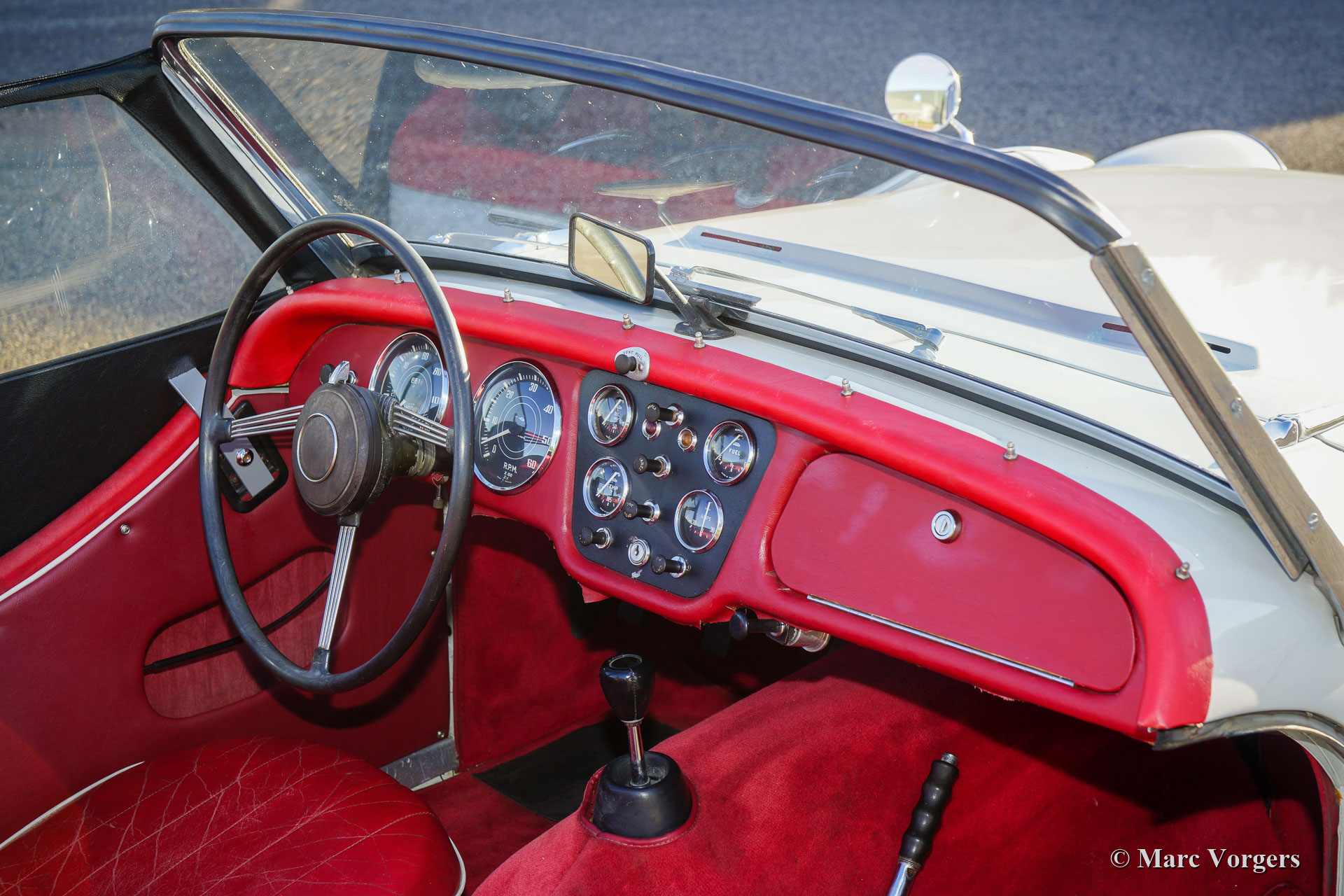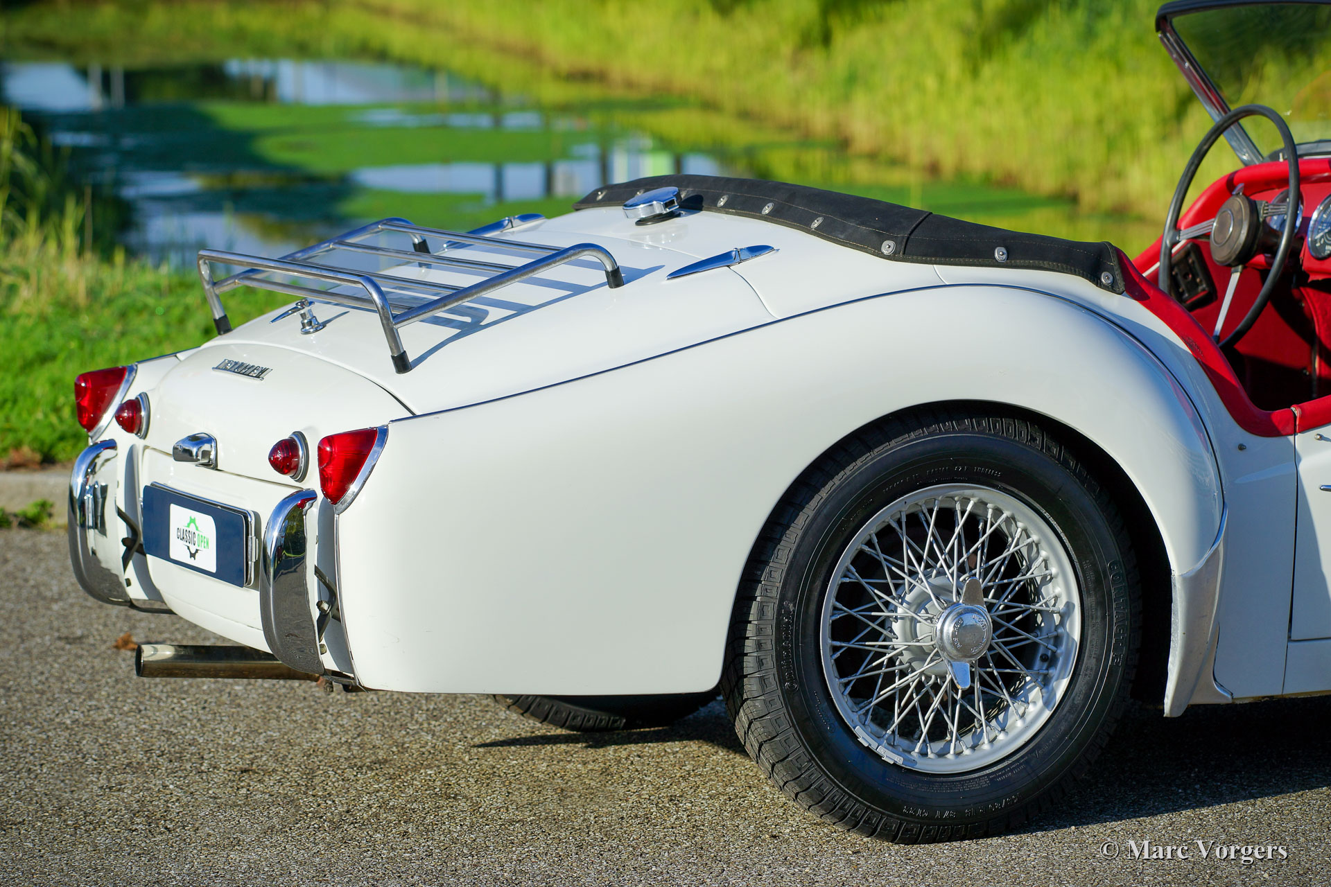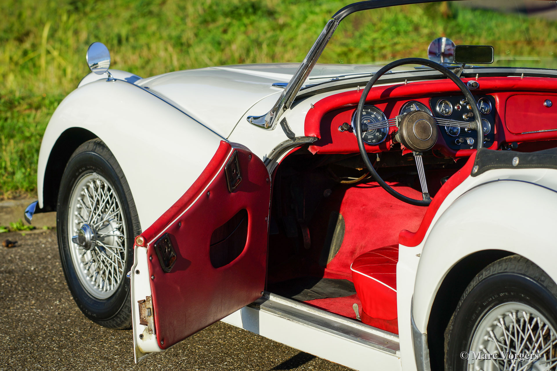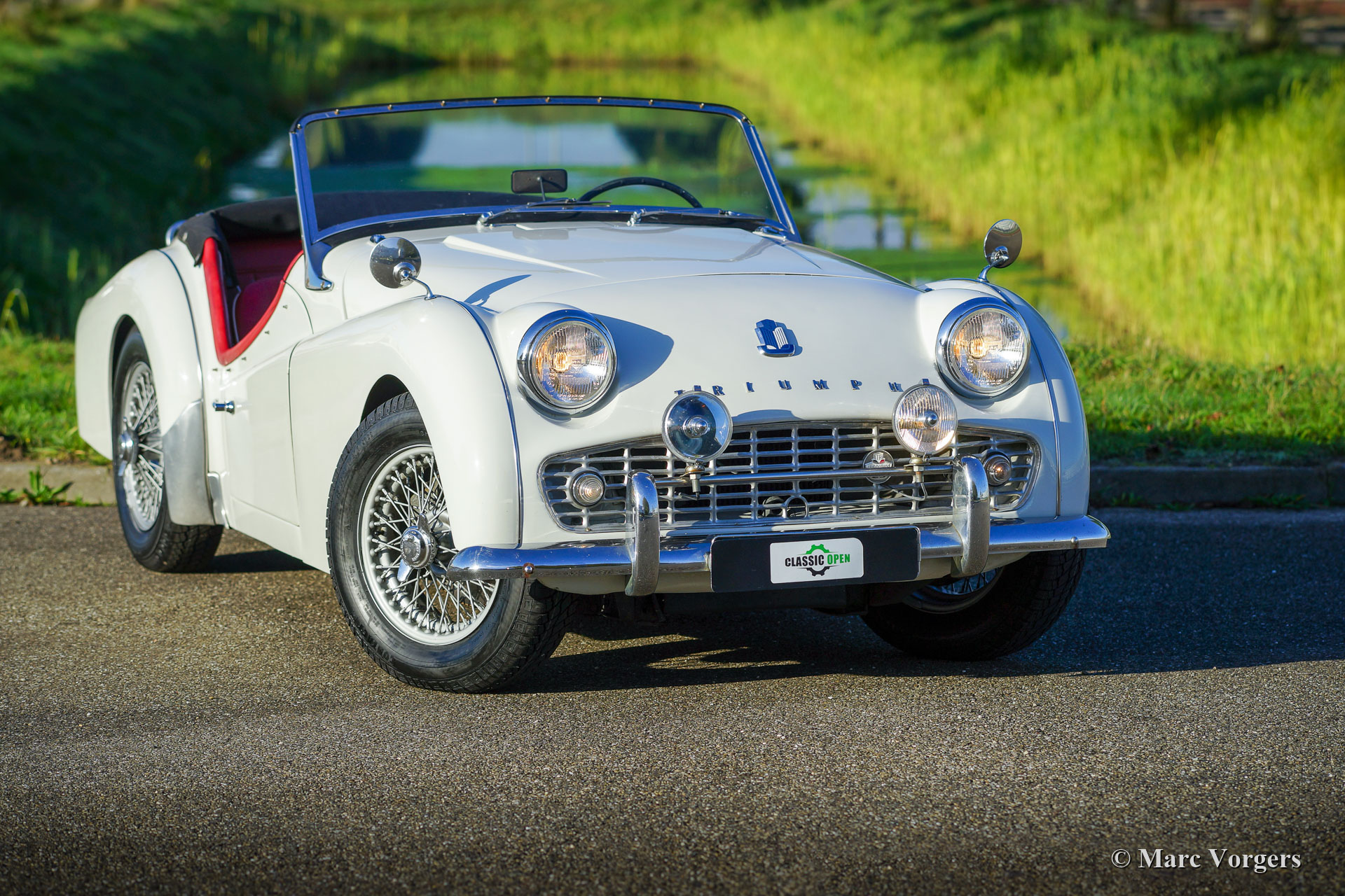 Triumph TR 3A, year 1960. Colour Ivory white combined with red leather interior. Black soft-top and black side-screens. This gorgeous Triumph TR 3A was restored many years ago, the automobile is in a very good condition and it shows wonderful original details including the original steering wheel. The classic colour combination combines perfectly with the 1950s lines of the TR 3A. This Triumph is equipped with silver painted wire wheels, a chrome baggage rack on the boot lid, and auxiliary Lucas SLR & SFT575 driving lamps at the front. The 2-Litre four cylinder in-line engine is a powerful and reliable unit delivering 100 bhp and a lot of torque. This is a characterful classic English sports car from the 1950s with a perfect open top driving experience. These Triumph sports cars were also very successful in the 1960s racing and rally competitions.