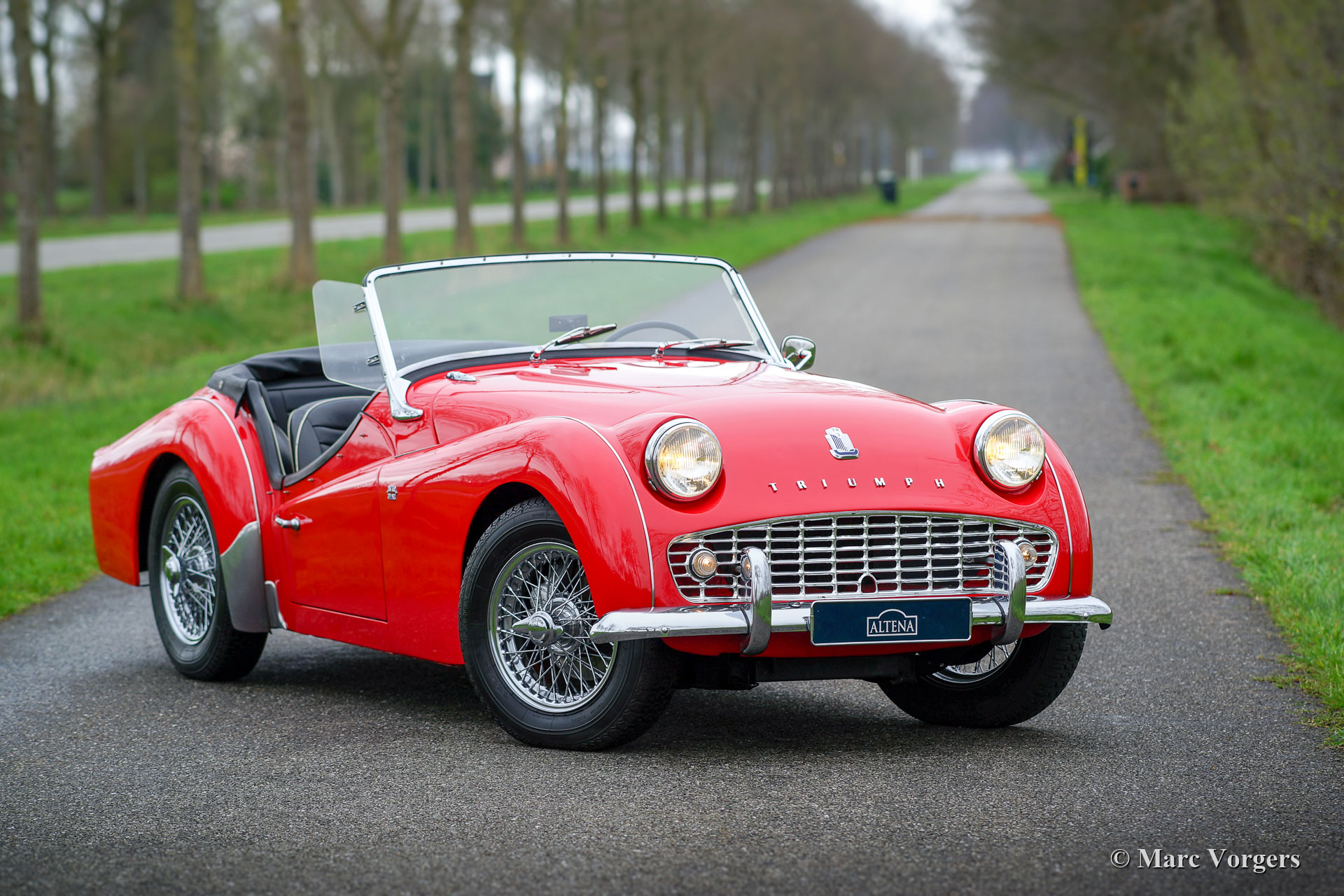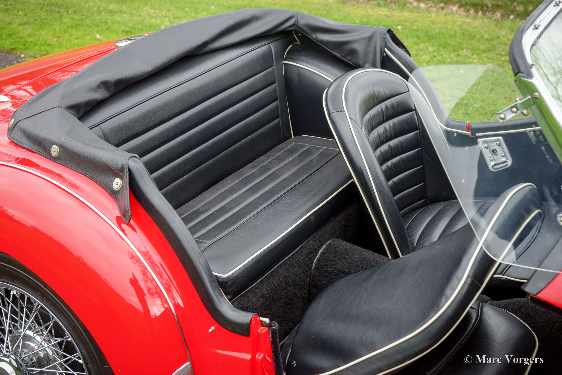 Triumph TR 3A, year 1963. Colour red combined with a black interior and black carpet. Soft-top, hood-cover, side-screens and tonneau-cover all come in black. This wonderful Triumph TR 3A was sold new in the USA, the automobile was imported to the Netherlands in the year 1998. The Triumph was extensively restored in the Netherlands in the period 2000 – 2003. The restoration was a detailed job, of course the engine and gearbox were overhauled, and the wiring loom was renewed. The car is in excellent to superb condition and the car drives delightfully! This Triumph TR 3A features chrome wire wheels with chrome knock off wheel nuts, Michelin 165/15 tyres. A very desirable specimen!