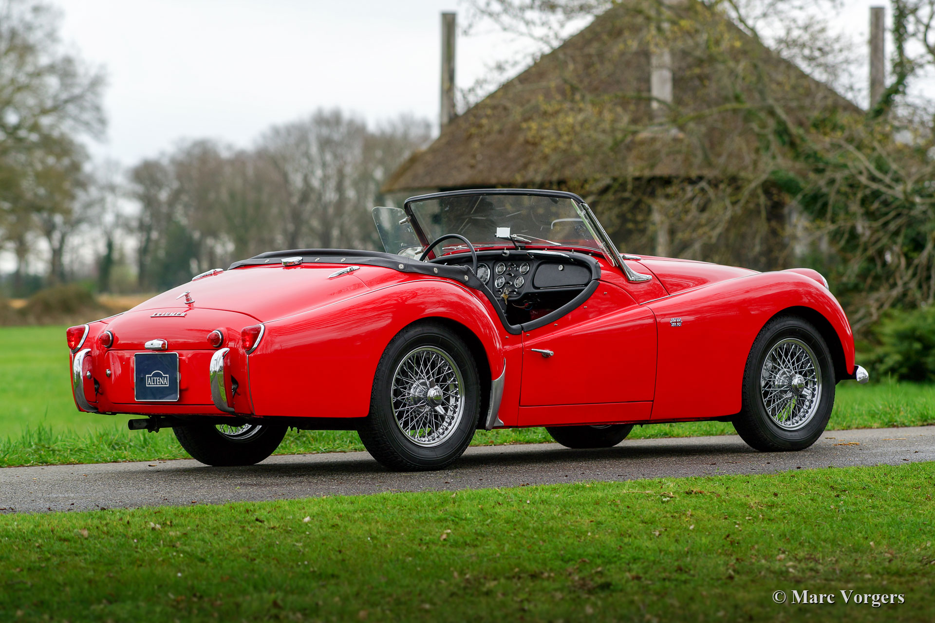 The Triumph TR 3 was uprated twice during the entire production period. In 1957 the car became a wider grille, door handles on the outside and slightly recessed headlamps and was named TR 3a then. In 1960-61 the cylinder capacity was enlarged to 2138 cc. giving a capacity of 104 bhp. and extra torque. Also the fully synchronized TR4 gearbox was incorporated. The car was then named TR 3b. The TR 3 is a pure two-person roadster, a classic generously giving you the fifties British sports car feeling, rough but honest. It comes with a simple soft-top for weather protection. Separate clip-on side screens can additionally be attached to the doors.