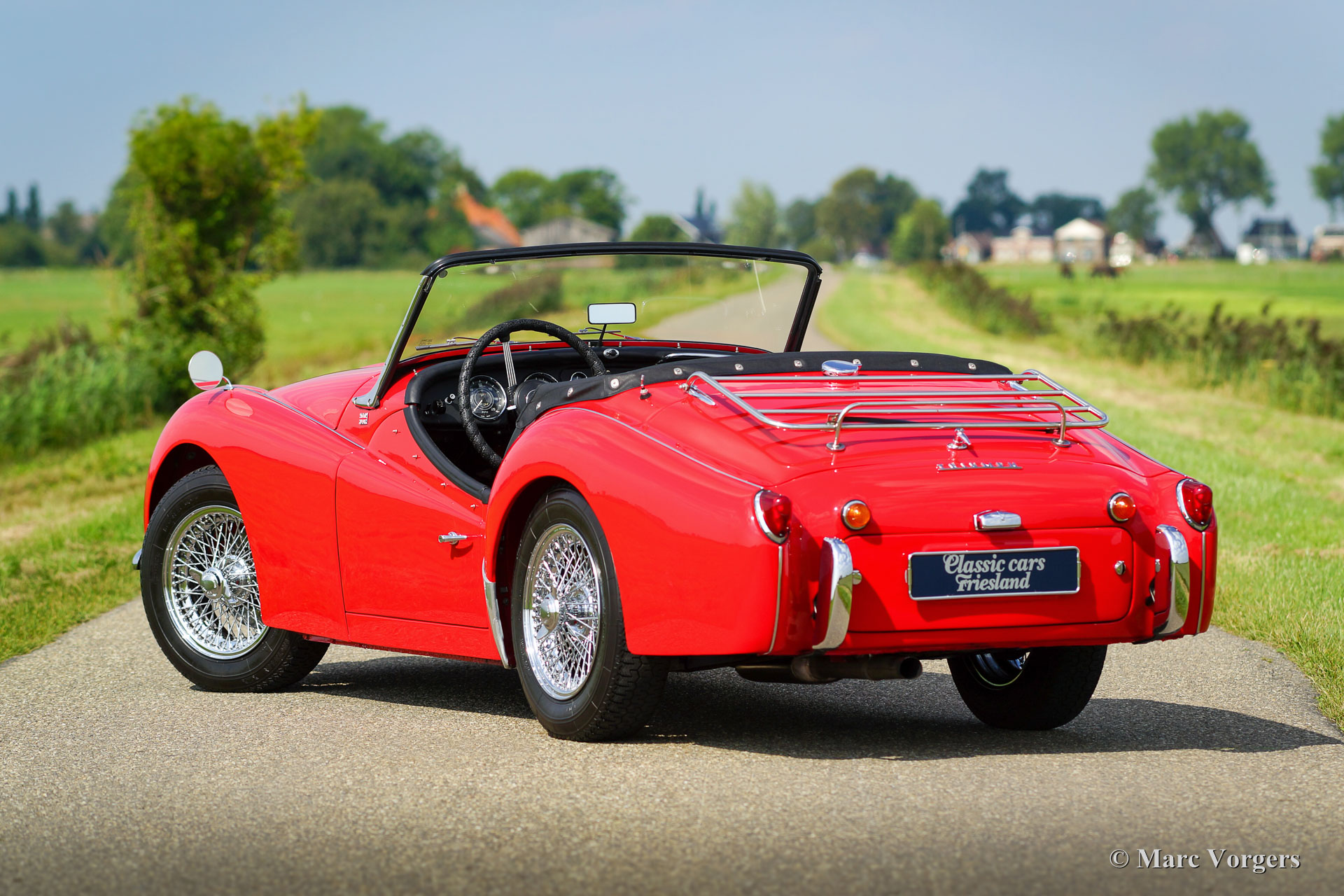 Triumph TR 3B, year 1962. Colour red with a black leather interior trimmed with white piping. Black carpet, black soft-top, side-screens, tonneau-cover and hood-cover. This is a rare Triumph TR 3B, the ‘B’ already features the 2138 cc engine which would later be fitted to the TR 4. Only 3331 examples of the TR 3B have been built. This gorgeous TR 3B was extensively and ‘body-off’ restored in the Netherlands in the past. A photo reportage of the restoration is present. During the restoration the mechanicals were also overhauled and/ or renewed, including the engine, gearbox, overdrive and the dashboard gauges. The chassis was sand-blasted and given a durable enamel coating. This rare TR 3B is in superb top condition and the car has won several prizes on Dutch and international (club) concourses. The car is fitted with overdrive, chrome wire wheels, Vredestein Classic tyres, a chrome baggage rack, a more ‘sturdy’ anti-roll-bar at the front wheels, a Stainless-Steel exhaust, new wiring, rebuilt dashboard instruments, a badge-bar with original Lucas fog- and spotlamps and a tool set. The additional lamps can be switched on/ off separately with a very nice period switch! This is a rare and perfectly driving top-specimen!