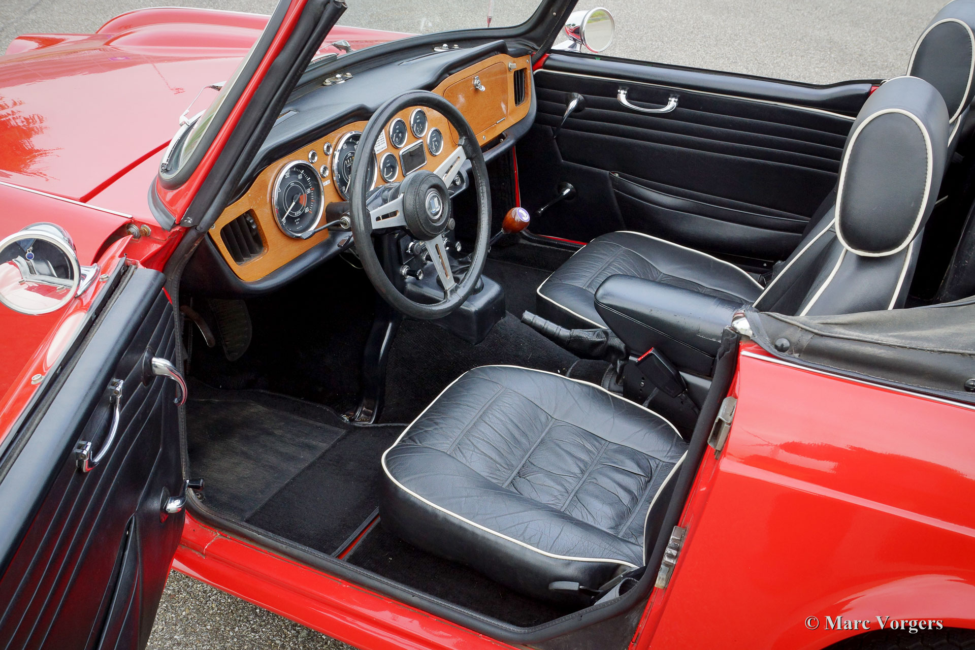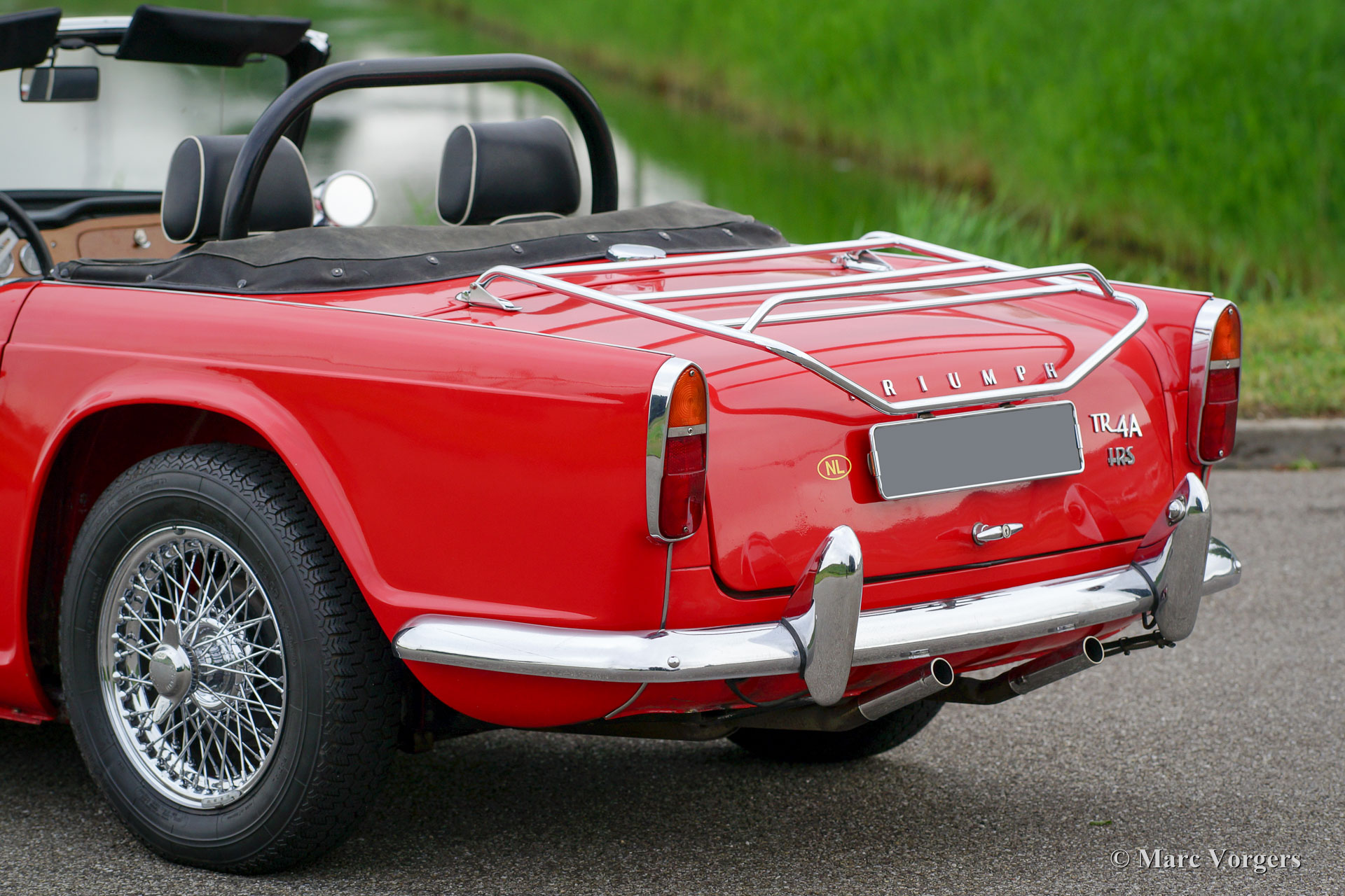 Triumph TR 4A IRS, year 1967. Colour red with a black leather interior and black carpet. This beautiful Triumph TR 4 has been cherished by the same owner for over 15 years. The automobile has been serviced perfectly and the car is in very good to excellent condition! In recent years several overhauls and improvements have been carried out; the engine was overhauled and adapted to run on lead free petrol, the clutch was renewed, and an AC generator / dynamo was fitted. The Triumph TR 4 A IRS is the last model in the TR 4 series and it features independent rear suspension (IRS) where its predecessors sported a live rear axle. This beautiful and perfectly driving Triumph TR 4 A IRS is fitted with chrome wire wheels, power brakes, overdrive, a roll-over bar, an electric cooling fan, special ‘comfort’ seats with higher back rests and head rests, two chrome ‘bullet-style door mirrors, a chrome luggage rack and a aftermarket centre armrest. Additionally, a British Motor Heritage trust document is present.